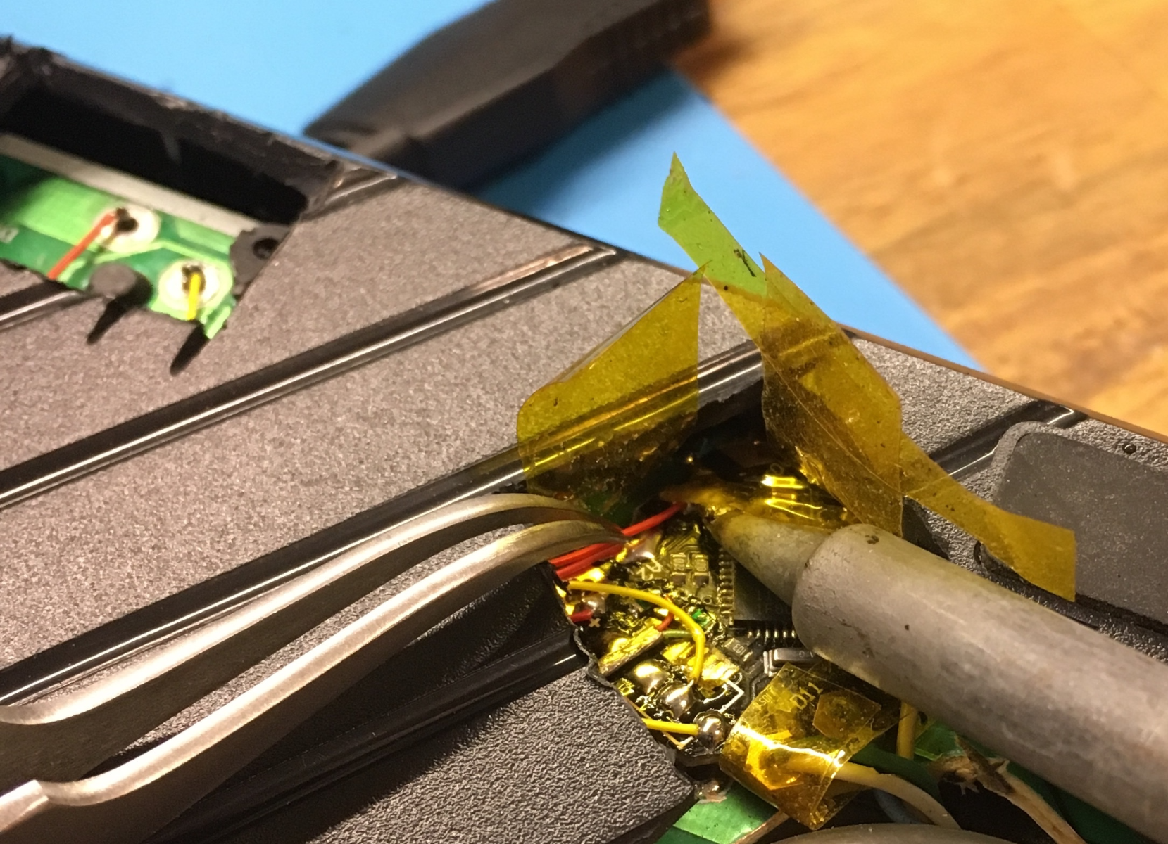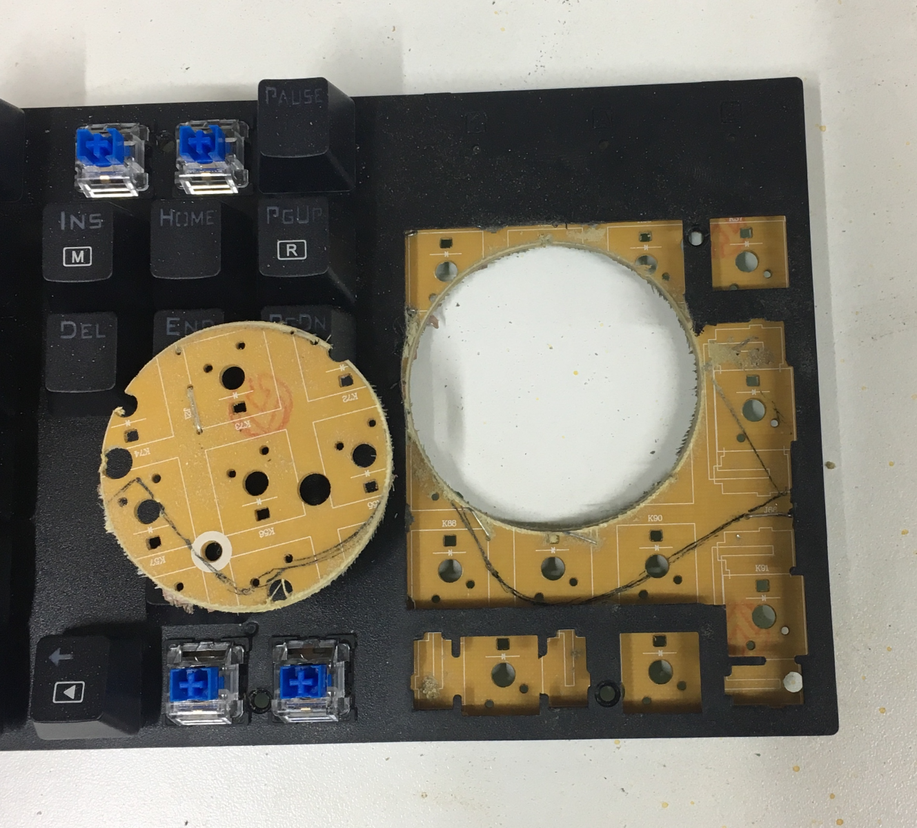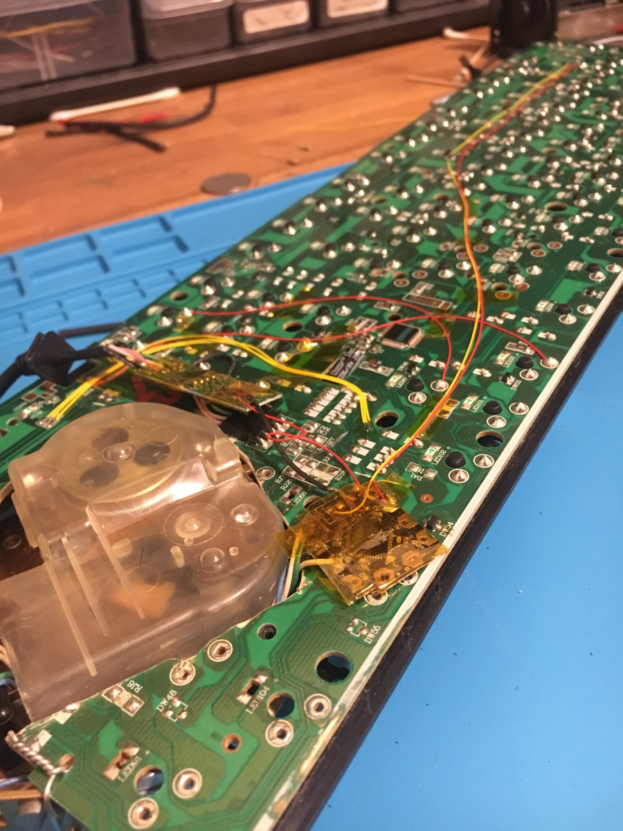 Для этого пришлось бы перерезать дорожки в нижней части печатной платы, которые позволяют клавиатуре сканировать все клавиши, чтобы определить, какие из них были нажаты, поэтому он потратил много времени, проверяя дорожки мультиметром и делая перемычки для замены этих дорожек.