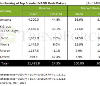 Доход индустрии флеш-памяти NAND вырос на 24,5% в 4 квартале 2023 года, ожидается, что в 1 квартале он увеличится еще на 20%