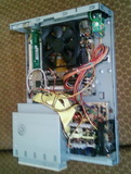 А теперь нужно позаботиться об охлаждении БП, для этого я сделал отверстие в крышке корпуса и установил тонкий кулер, восьмидесятка идеально подошла, процессор и северный мост охлаждаются 120кой.