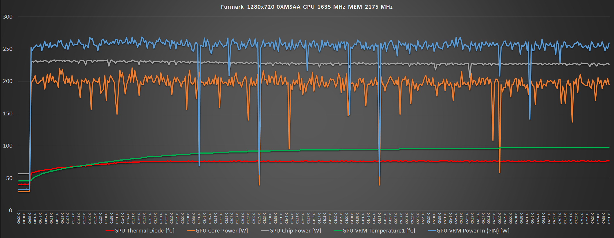 Furmark 1280x720 8XMSAA в разгоне GPU 1635 МГц MEM 2175 МГц