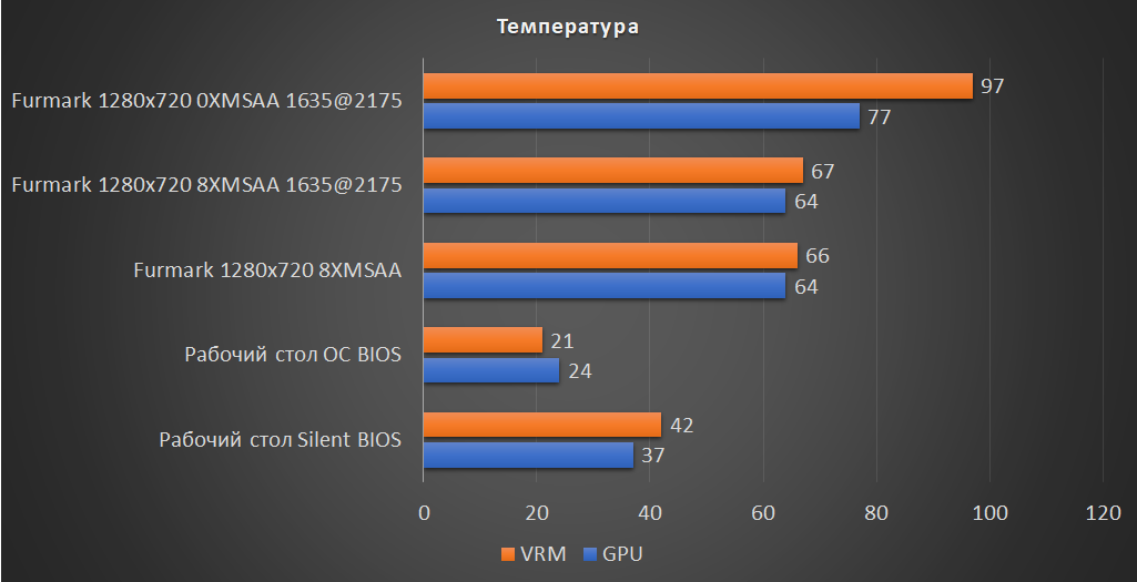 В разгоне кривая работы системы охлаждения видеокарты была изменена 70 °C – 100% оборотов.