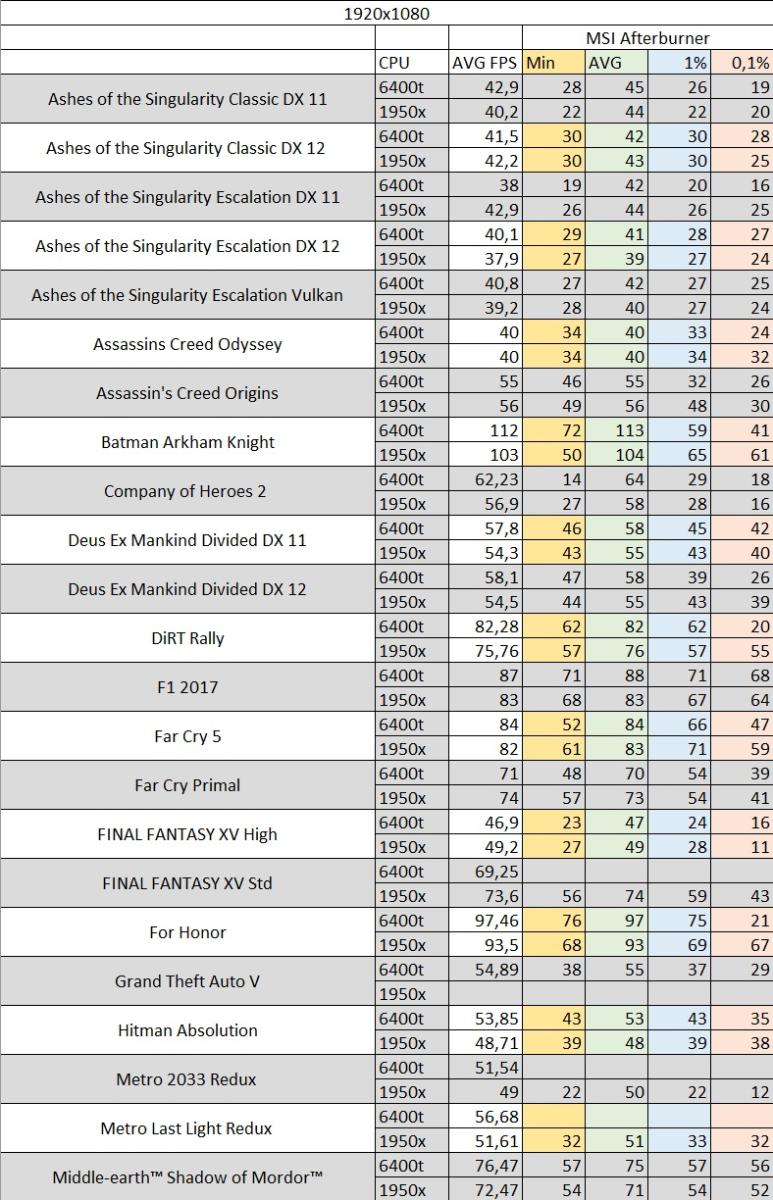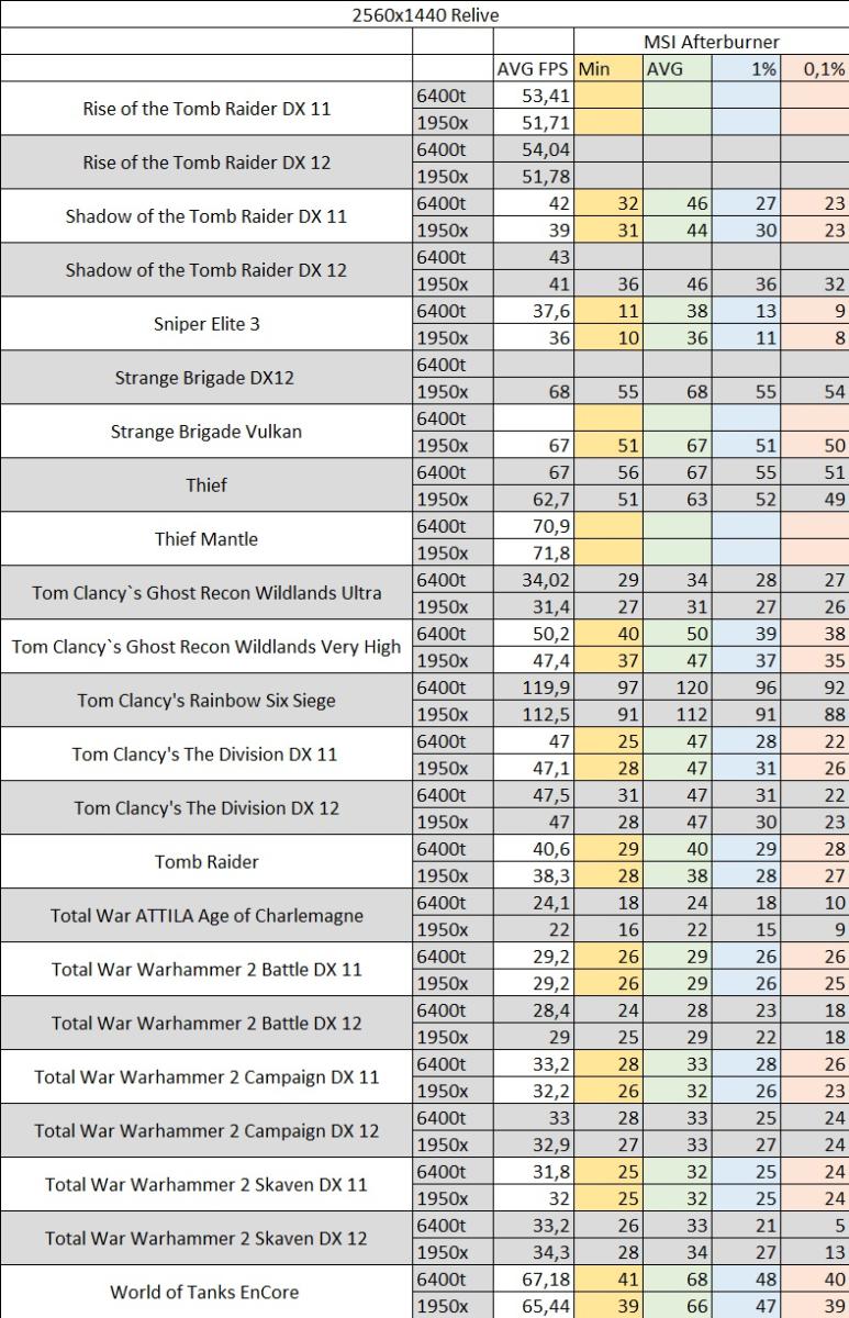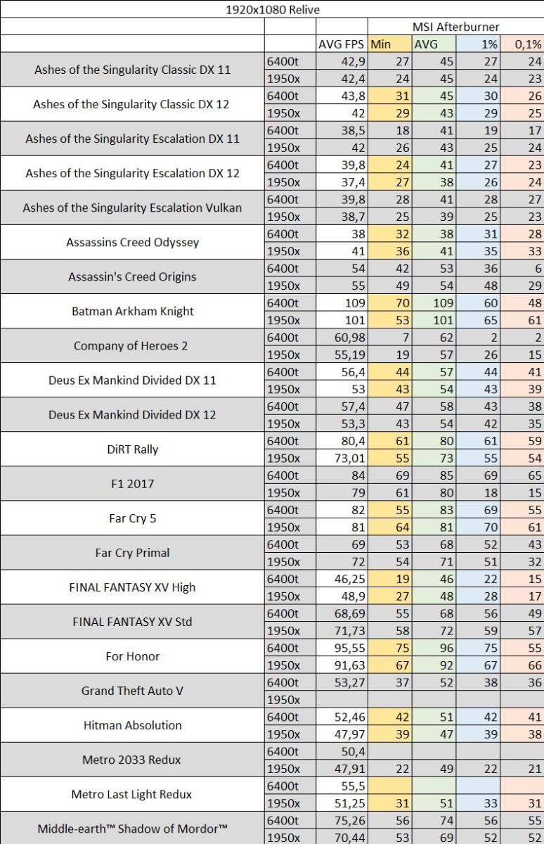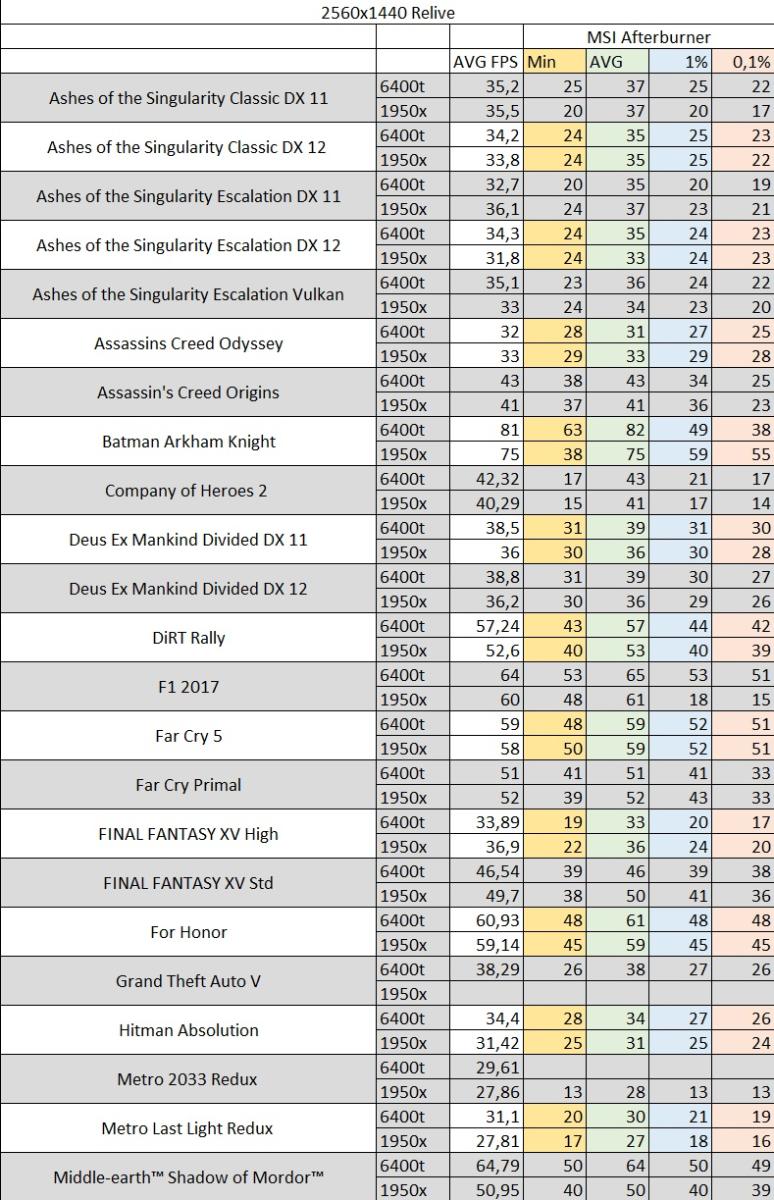 Ниже в таблицах показаны замеры среднего fps в играх и данные из Msi Afterbuner min, avg, 1%, 0,1%, а также с использованием Relive.