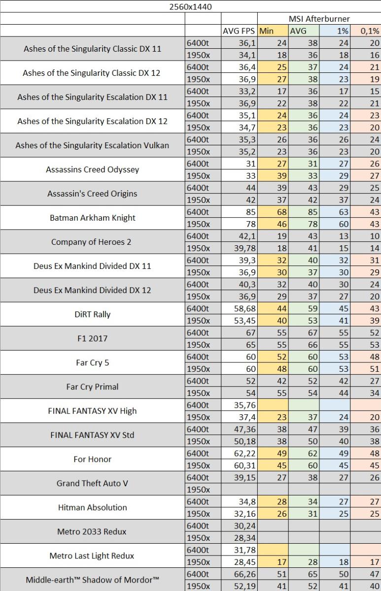 Выше на графиках приведены средний fps в двух разрешениях 1920x1080 и 2560x1440. Threadripper не смог в большинстве случаев обогнать i7-6400t, несмотря на хорошую память.
