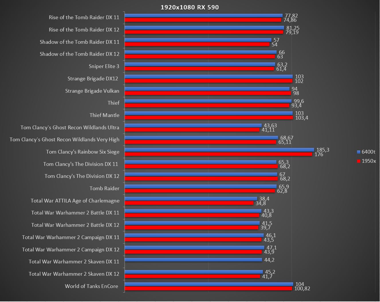 В этом тесте будет сравнение двух процессоров Intel i7-6400t и Threadripper 1950X с видеокартой PowerColor Radeon RX 590 в игровых бенчмарках. Результаты с Intel взяты с этого блога Tест видеокарты PowerColor AMD Radeon RX 590 Red Devil [AXRX 590 8GBD5-3DH/OC].