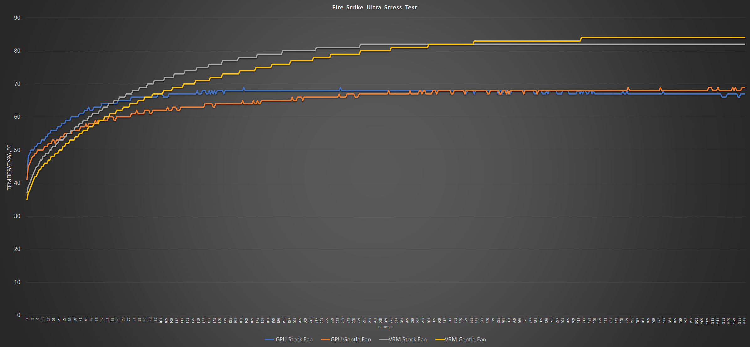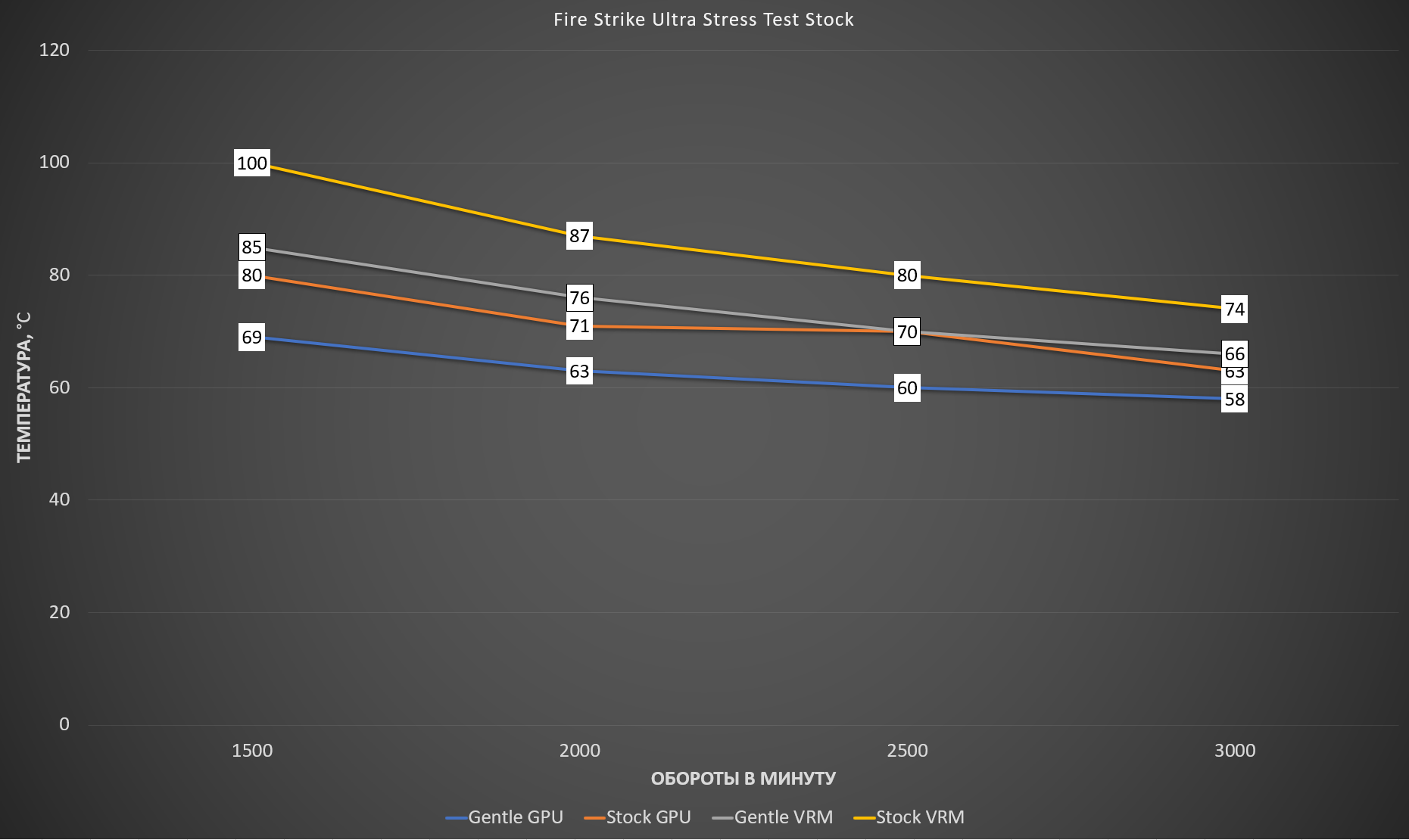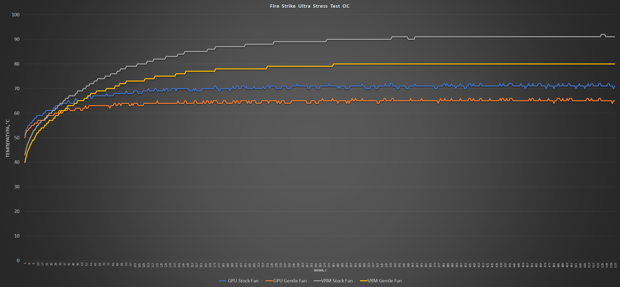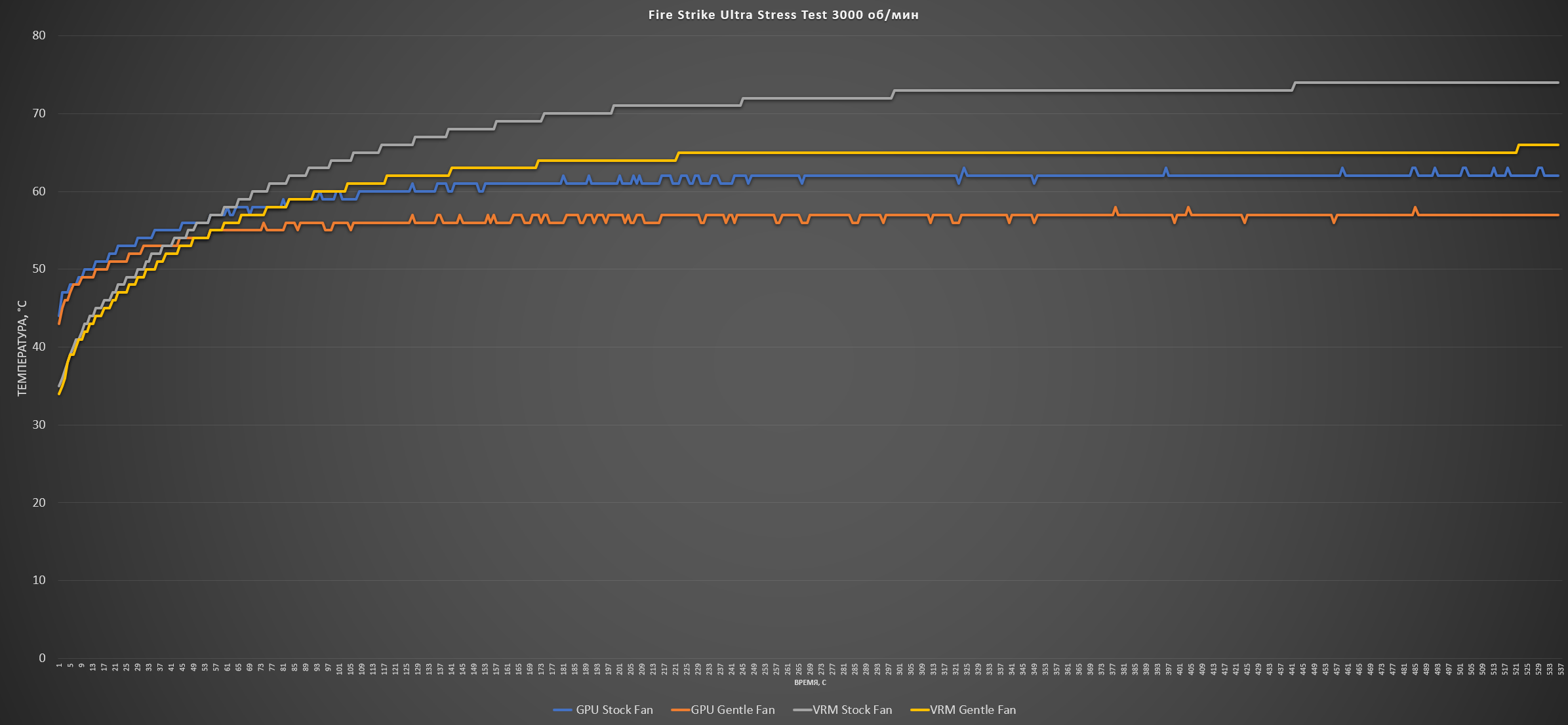 В разгоне, с настроенной кривой вентилятора, Gentle Typhoon GT-3000 PWM вырывается уже вперед в отличие от стока, разница составляет на GPU от 4 до 11 °C и VRM от 7 до 15 °C в зависимости от теста.