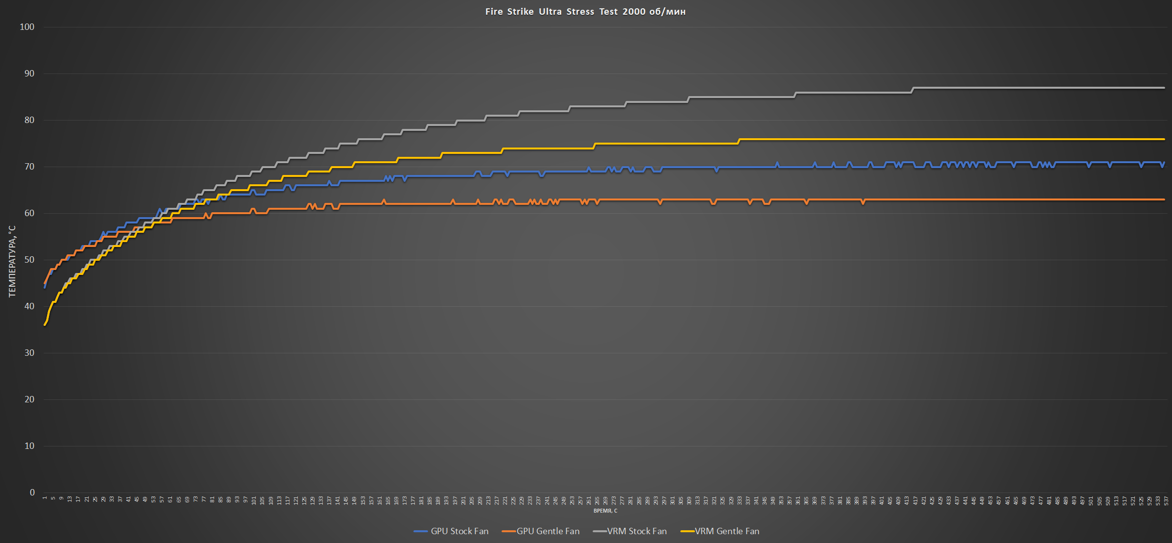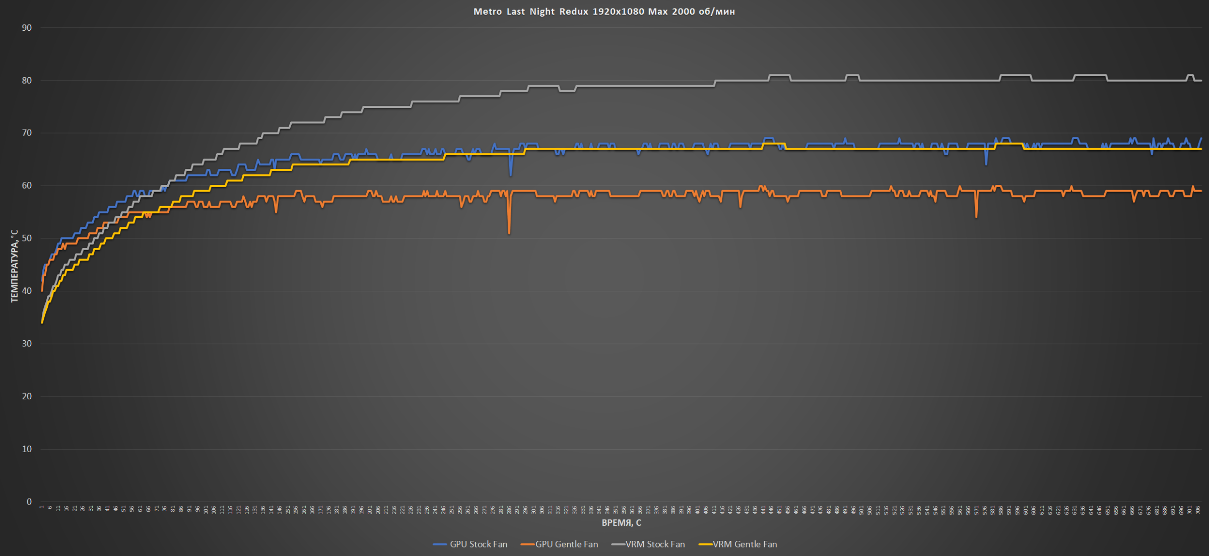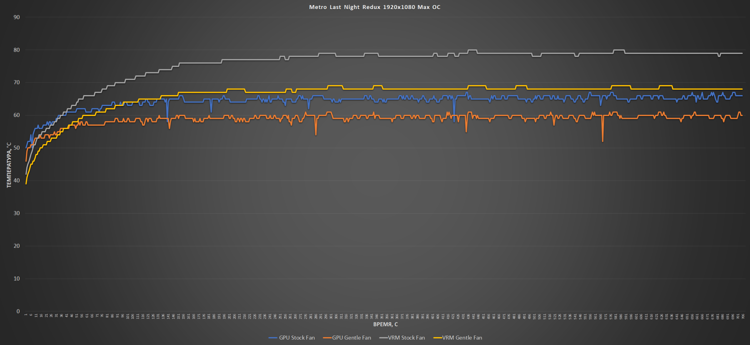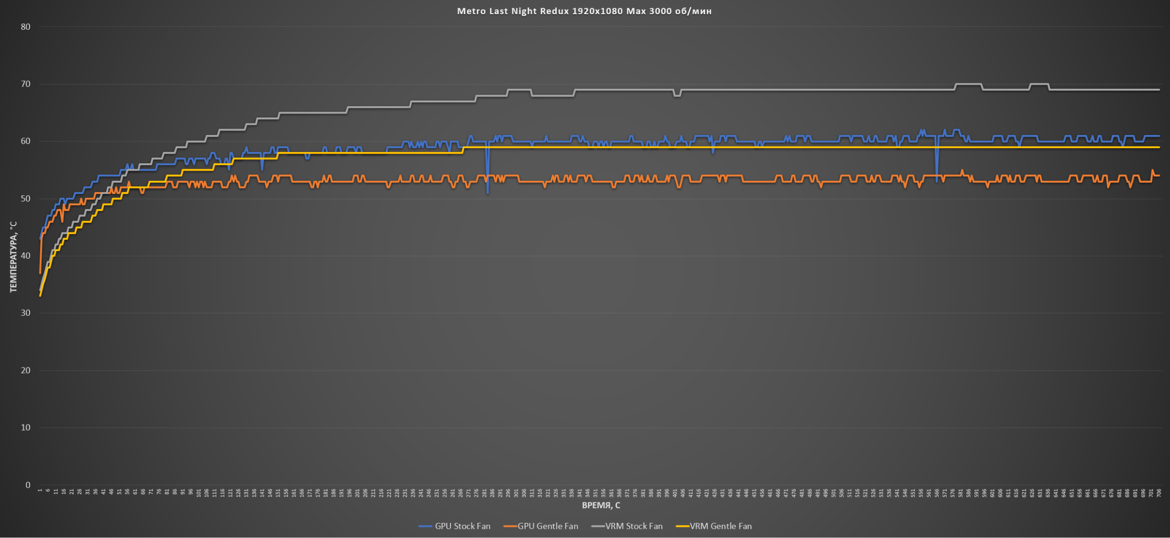 В разгоне, с настроенной кривой вентилятора, Gentle Typhoon GT-3000 PWM вырывается уже вперед в отличие от стока, разница составляет на GPU от 4 до 11 °C и VRM от 7 до 15 °C в зависимости от теста.