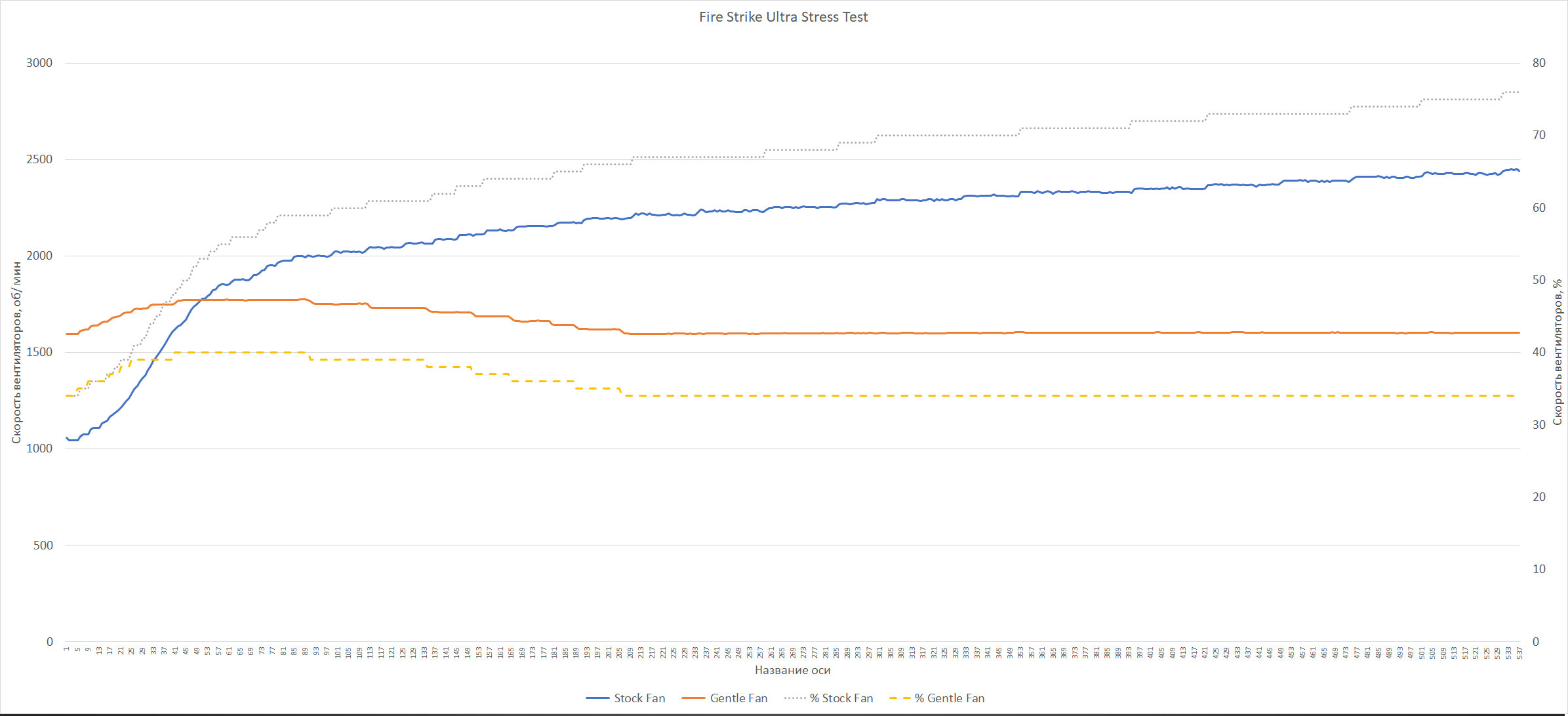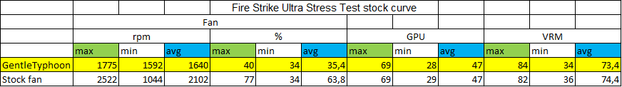 Выше на снимках с экрана видно стоковые настройки кривой вентилятора и минимальные, максимальные и средние показания оборотов и температур во время Fire Strike Ultra Stress Test.