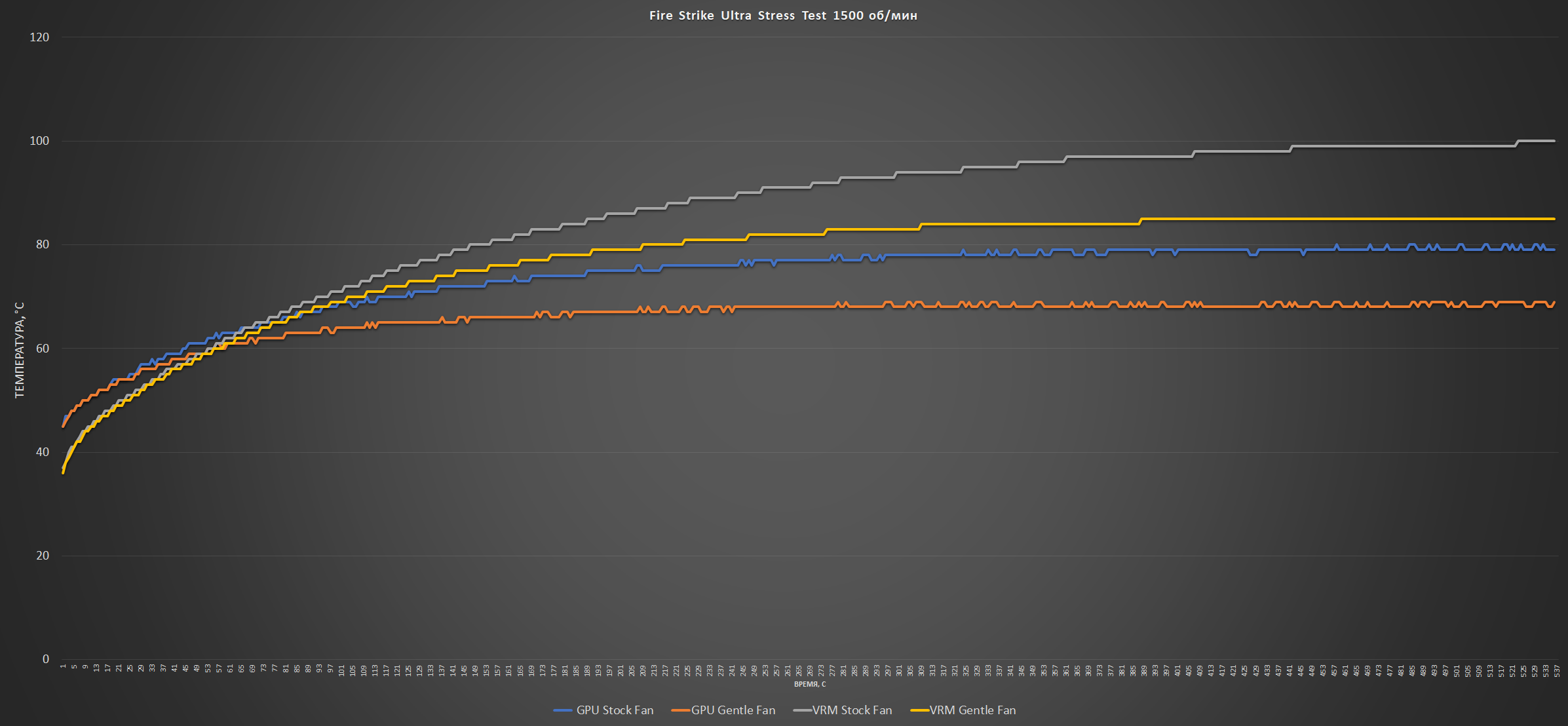 На фиксированных 1500 оборотах в минуту Gentle Typhoon вырывается значительно вперед: 69 °C против 80 °C на GPU и 85 °C против 100 °C на VRM, а по среднему 7 °C и 8 °C.