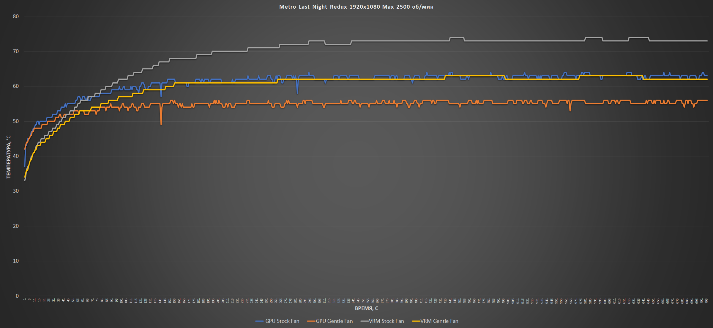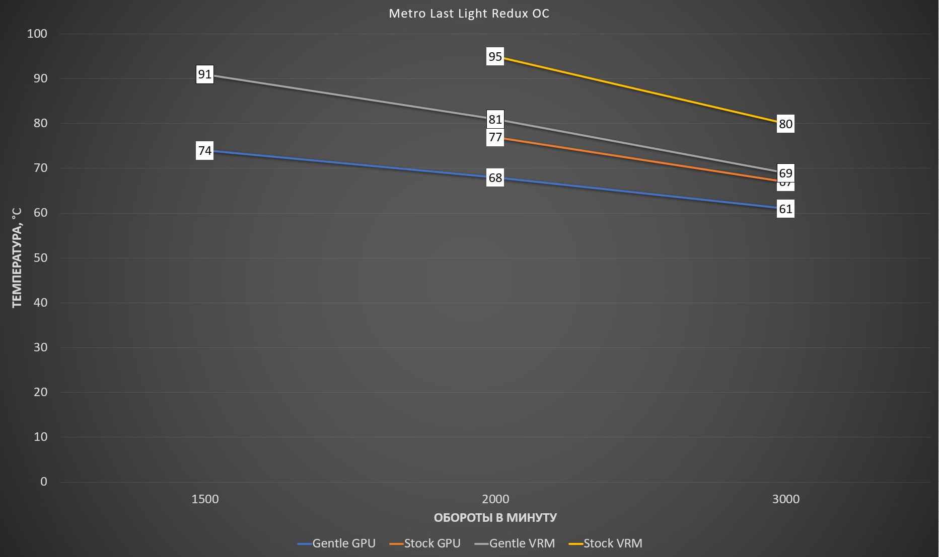 На 1500 об/мин в Metro Last Light Redux разница в зоне VRM составила целых 14 °C, 69,6 °C на Skythe и 83,5 °C на стоковых.