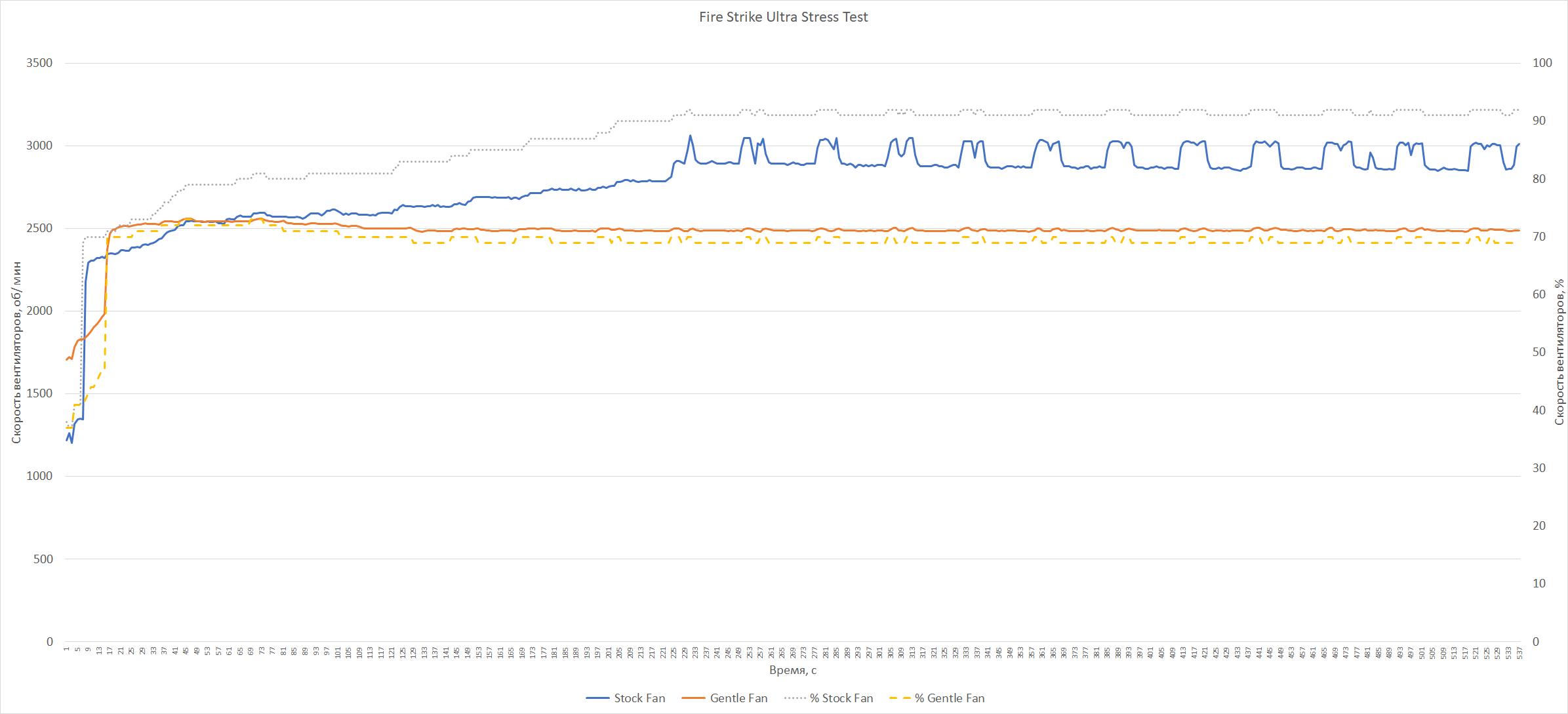 На графике в тесте 3DMark Fire Strike Ultra Stress Test, видно, что Gentle Typhoon вырывается вперед, в течение 5 минут он держит температуру ниже, чем стоковые. С 6-ой минуты GT-3000 PWM начинает уступать стоковым вентилятором, теперь обратим внимание на 2-ой график оборотов и выясним, почему так произошло. На втором графике видно, что вентиляторы Skythe начали снижать обороты после 90 секунд теста и в итоге Gentle Typhoon проиграли только 2 °C в зоне VRM.