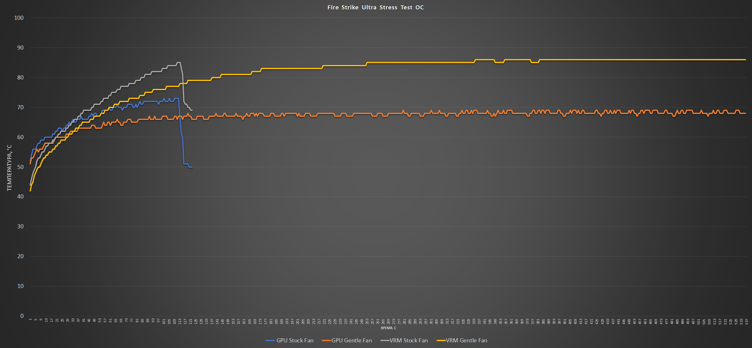Вот тут появляется первый тест в разгоне в Fire Strike Ultra Stress Test Gentle Typhoon справился с охлаждением, а стоковые – нет.