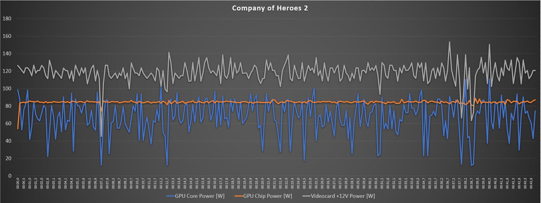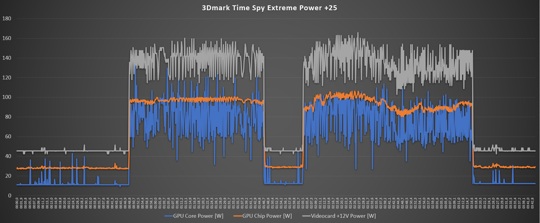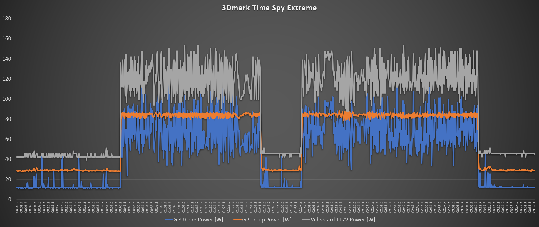 На скрине выше показан тест 3Dmark TIme Spy Extreme, где показано энергопотребление видеокарты, с использованием программы HWiNFO64. График Videocard +12V Power [W] показывает энергопотребление видеокарты через Corsair Link Digital. Частота опроса датчиков HWiNFO64 100 мс. На графике видно, что было использовано 2 графических теста из 3Dmark TIme Spy Extreme. В первом тесте средние энергопотребление по датчикам составило: GPU Core Power [W] – 68,06 Вт, GPU Chip Power [W] – 84,06 Вт Videocard +12V Power [W] – 120,04 Вт. Во втором тесте средние значения составили: GPU Core Power [W] – 69,49 Вт, GPU Chip Power [W] – 84,02 Вт Videocard +12V Power [W] – 123,05 Вт. На скриншоте ниже также показаны средние, минимальные и максимальные показатели энергопотребления.