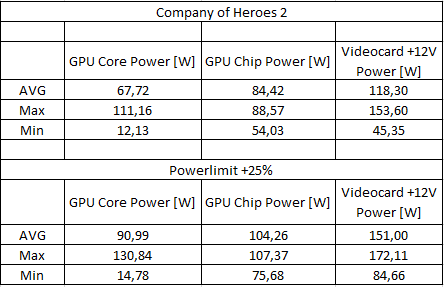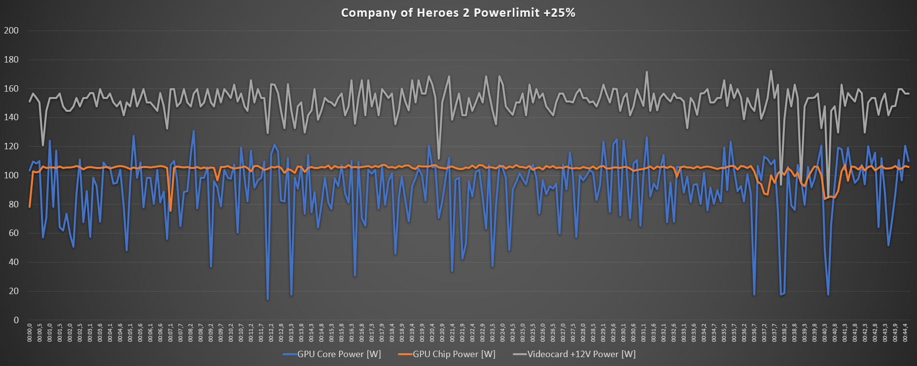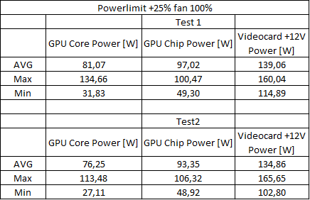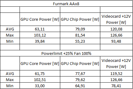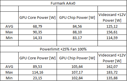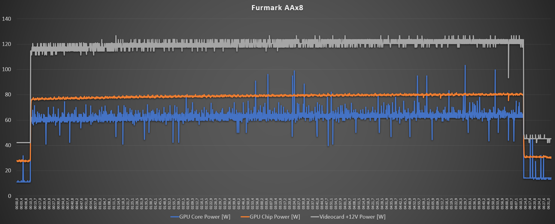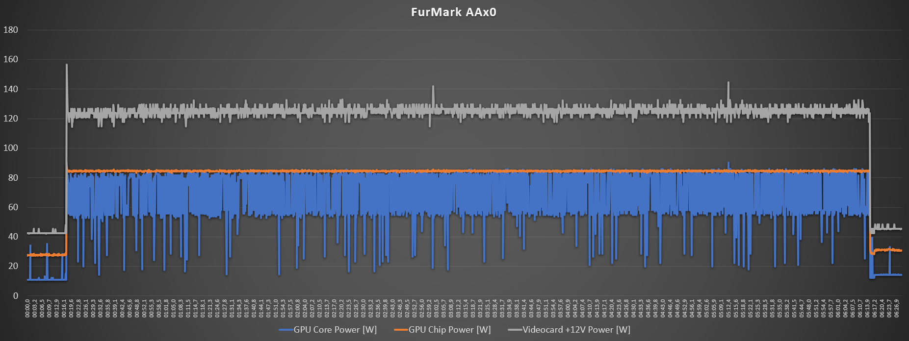 Тест в FurMark со сглаживанием AAx0: видно пик в начале теста, он особенно заметен со стоковым лимитом, относительно лимита потребления GPU 85 Вт почти полное потребление видеокарты составило +84% 156,61 Вт. Энергопотребление со стоковым лимитом и с увеличенным можете увидеть ниже в таблице.