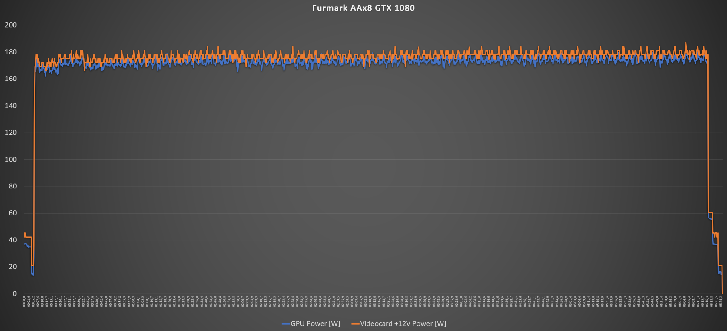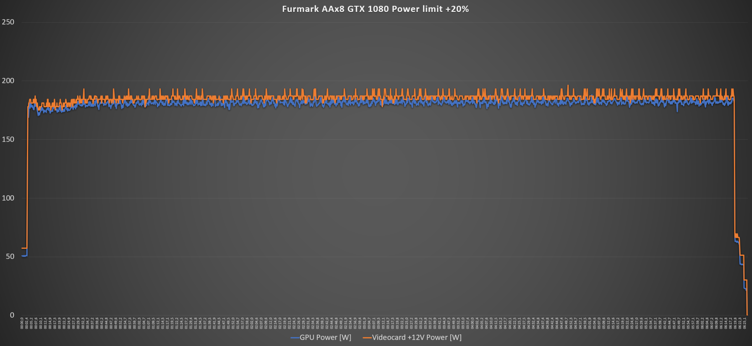 В Furmark AAx8 данные практически совпадают: максимальное значение GPU Power 180,08 Вт, среднее - 173 Вт, Videocard +12V Power максимальное - 187,21 Вт, среднее - 187,21 Вт. С увеличением лимита на 20% были получены следующие значения энергопотребления: максимальное значение GPU Power 188,22 Вт, среднее – 181,17 Вт, Videocard +12V Power максимальное - 196,22 Вт, среднее - 196,27 Вт.