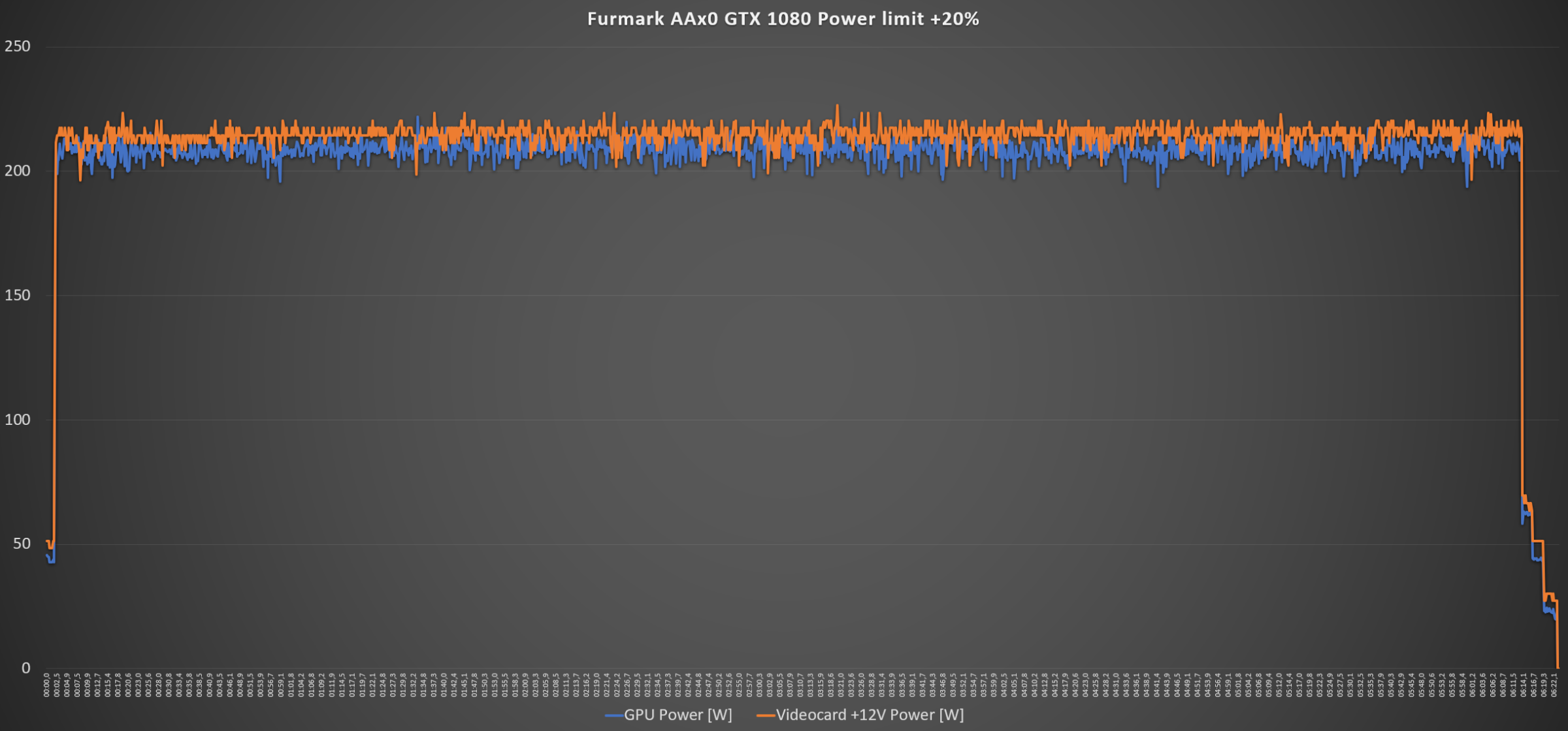 В Furmark AAx0 повторяется так же ситуация что и раньше: максимальное значение GPU Power 186,32 Вт, среднее – 176,73 Вт, Videocard +12V Power максимальное - 193,25 Вт, среднее - 180,18 Вт. С увеличением лимита на 20% были получены следующие значения энергопотребления: максимальное значение GPU Power 221,85 Вт, среднее – 208,59 Вт, Videocard +12V Power максимальное - 226,47 Вт, среднее – 214,66 Вт.