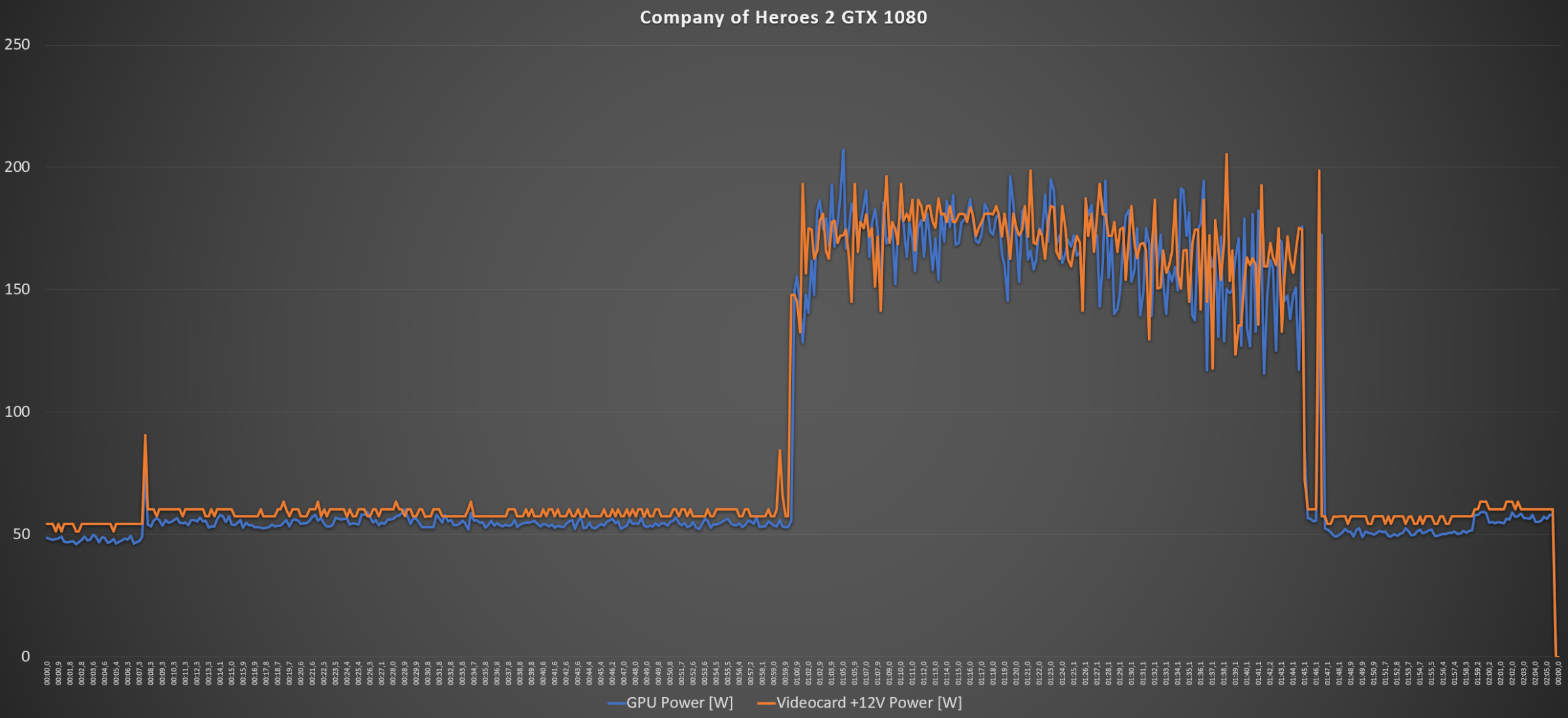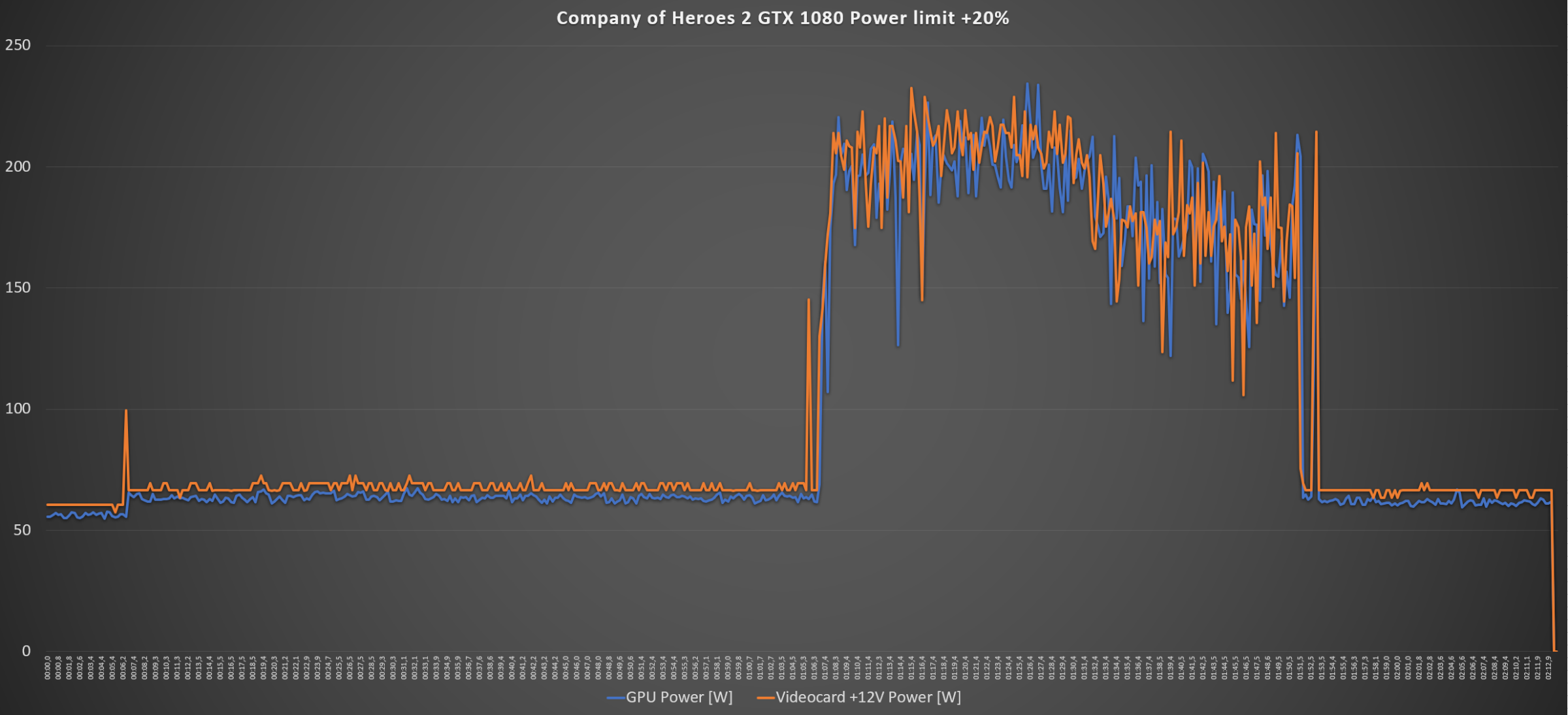 В Company of Heroes 2 1920x1080 энергопотребление видеокарты составило: максимальное значение GPU Power 207,37 Вт, среднее – 165,50 Вт, Videocard +12V Power максимальное – 205,33 Вт, среднее - 169,84 Вт. С увеличением лимита на 20% были получены следующие значения энергопотребления: максимальное значение GPU Power 234,31 Вт, среднее – 183,84 Вт, Videocard +12V Power максимальное - 232,5 Вт, среднее – 188,05 Вт.