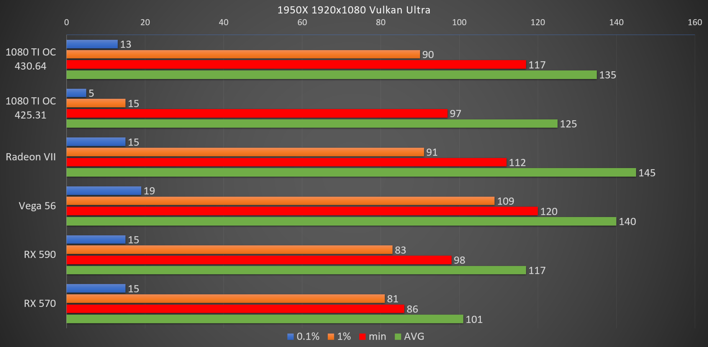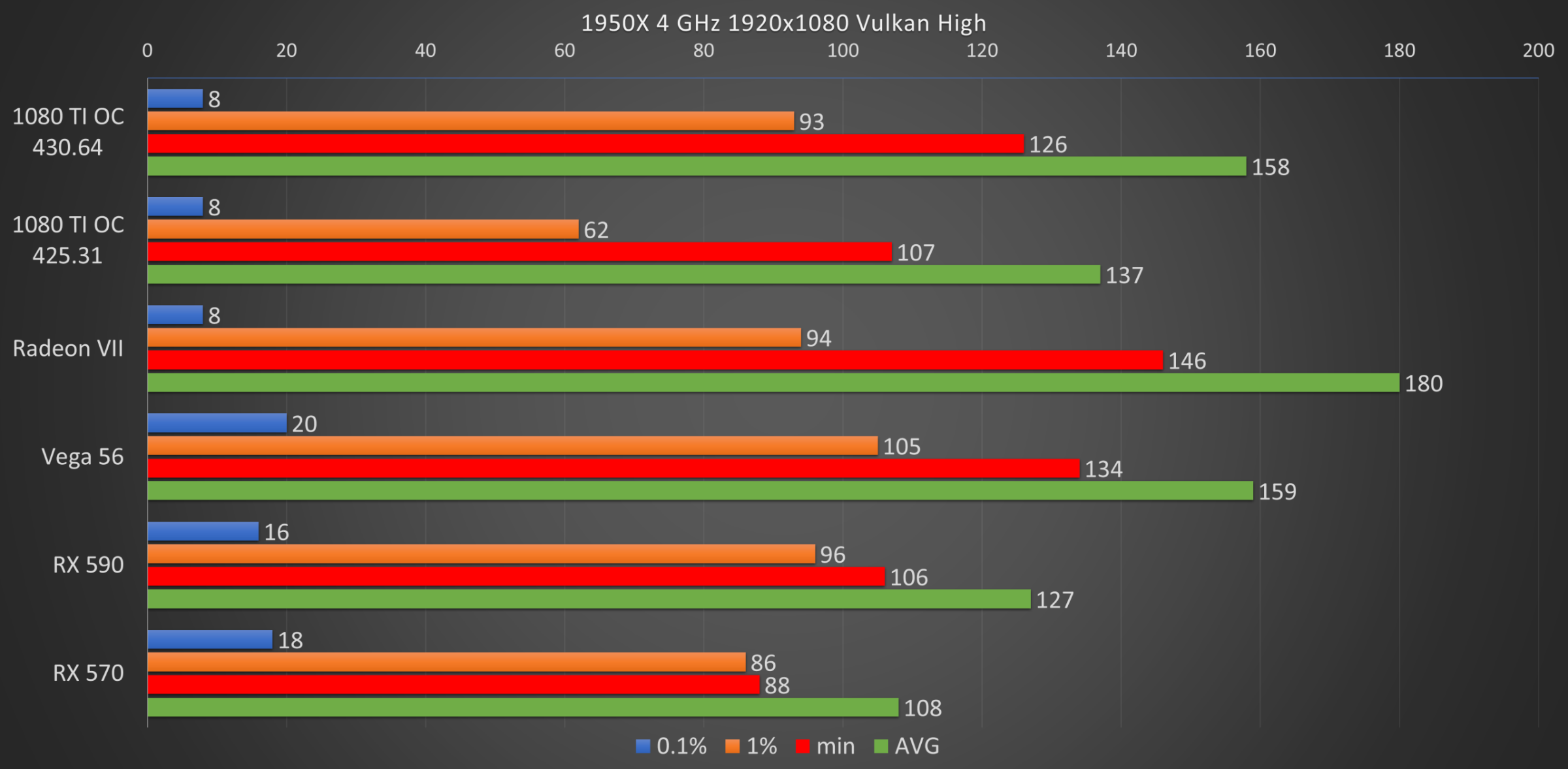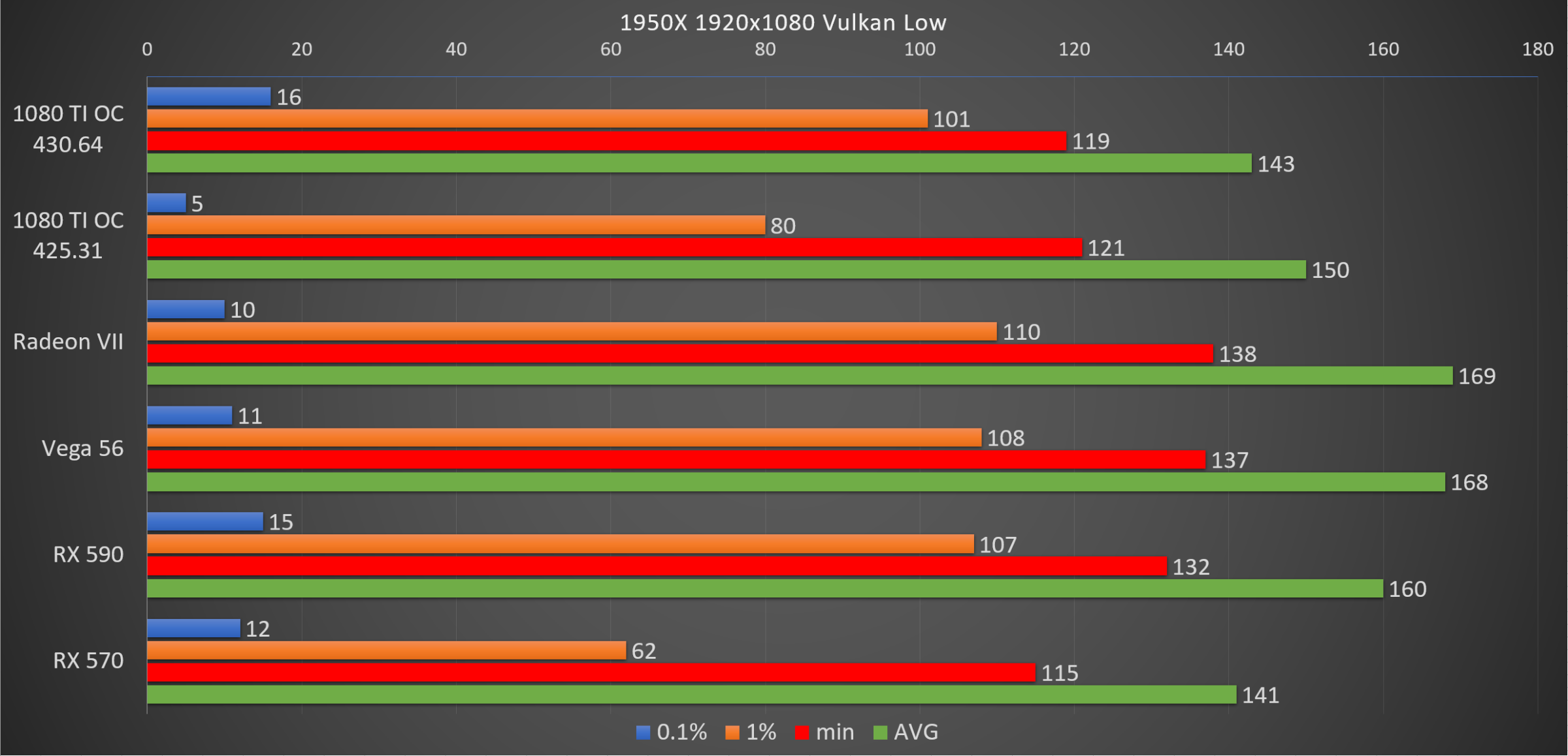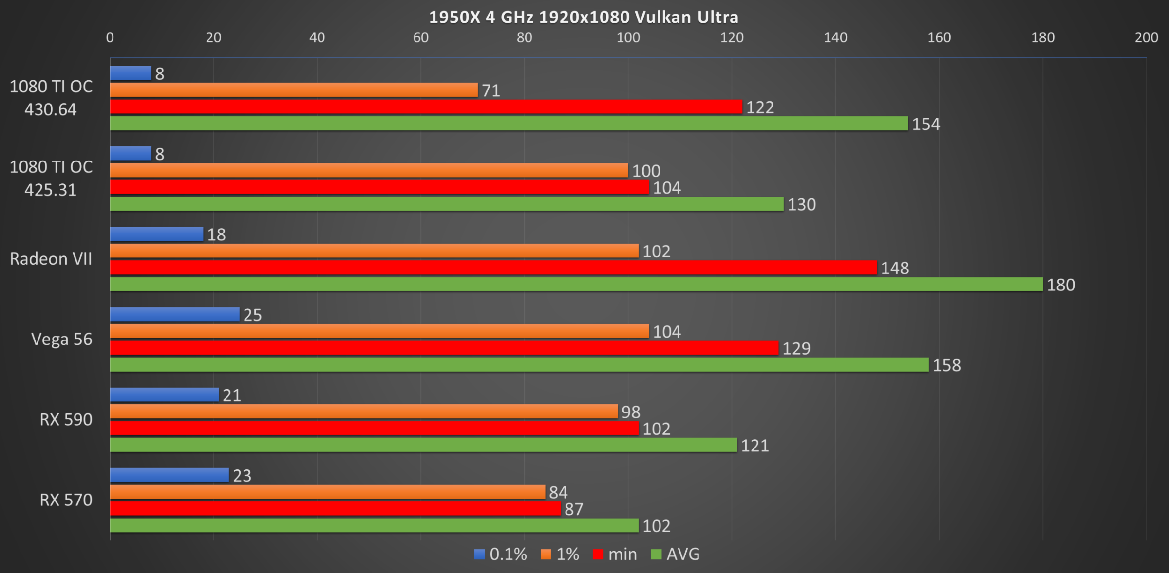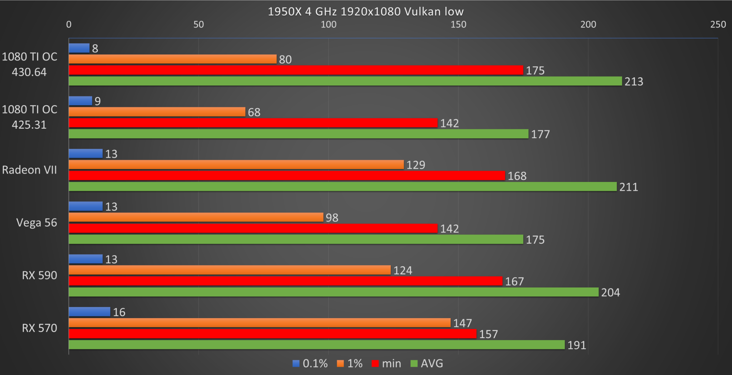 На момент тестирования вышедший драйвер 430.64 поднял производительность в Vulkan, но снизил производительность в DX 11 в FHD. Nvidia оказалась более процессорозависима, снижение настройки графики, приводит к тому что RX 570 начинает дышать в спину 1080 Ti. В DX 11 лидирует видеокарта 1080 Ti, в Vulkan AMD.