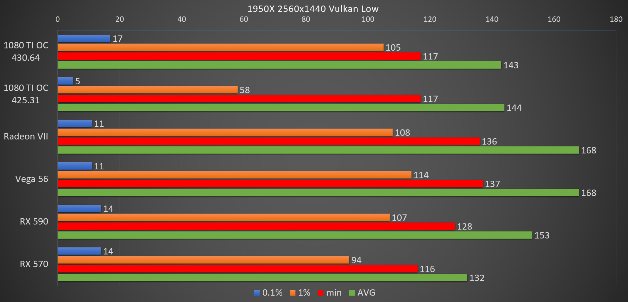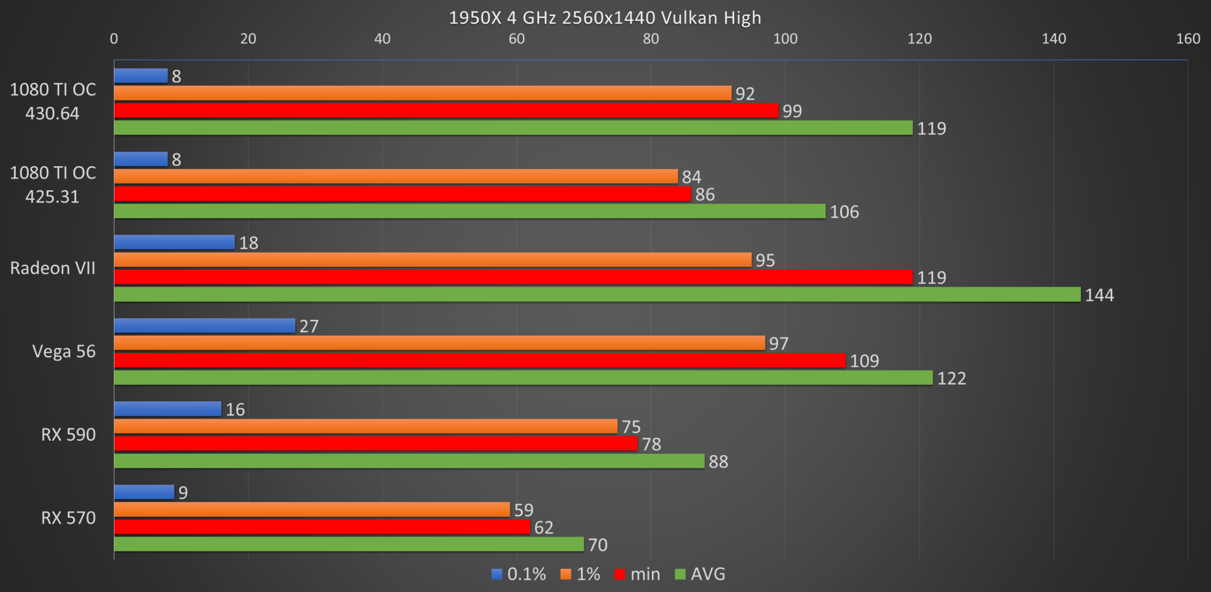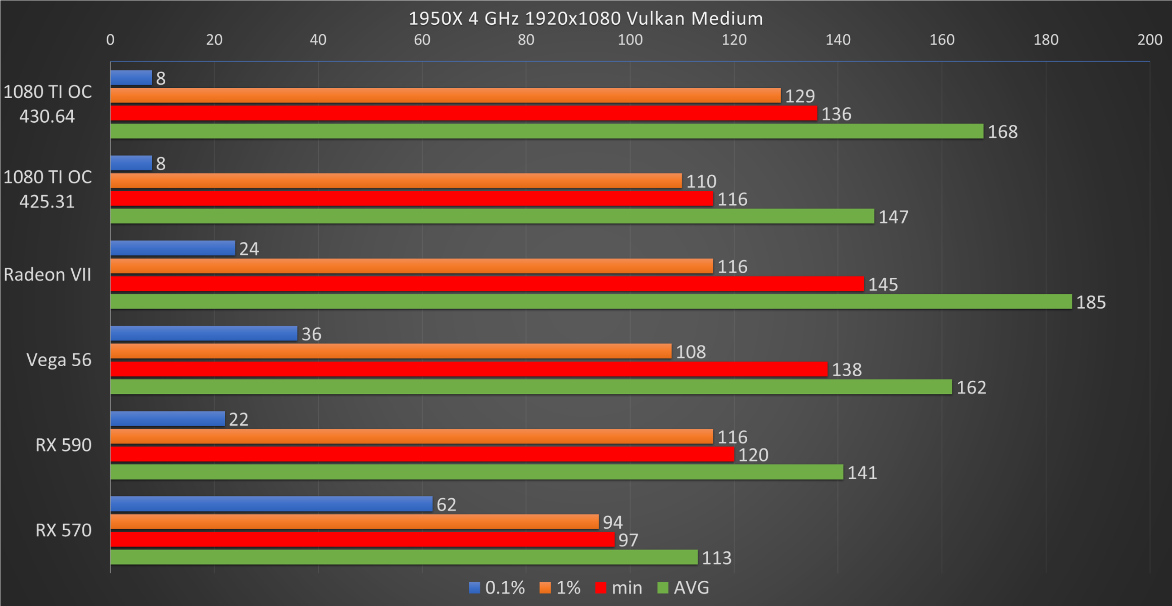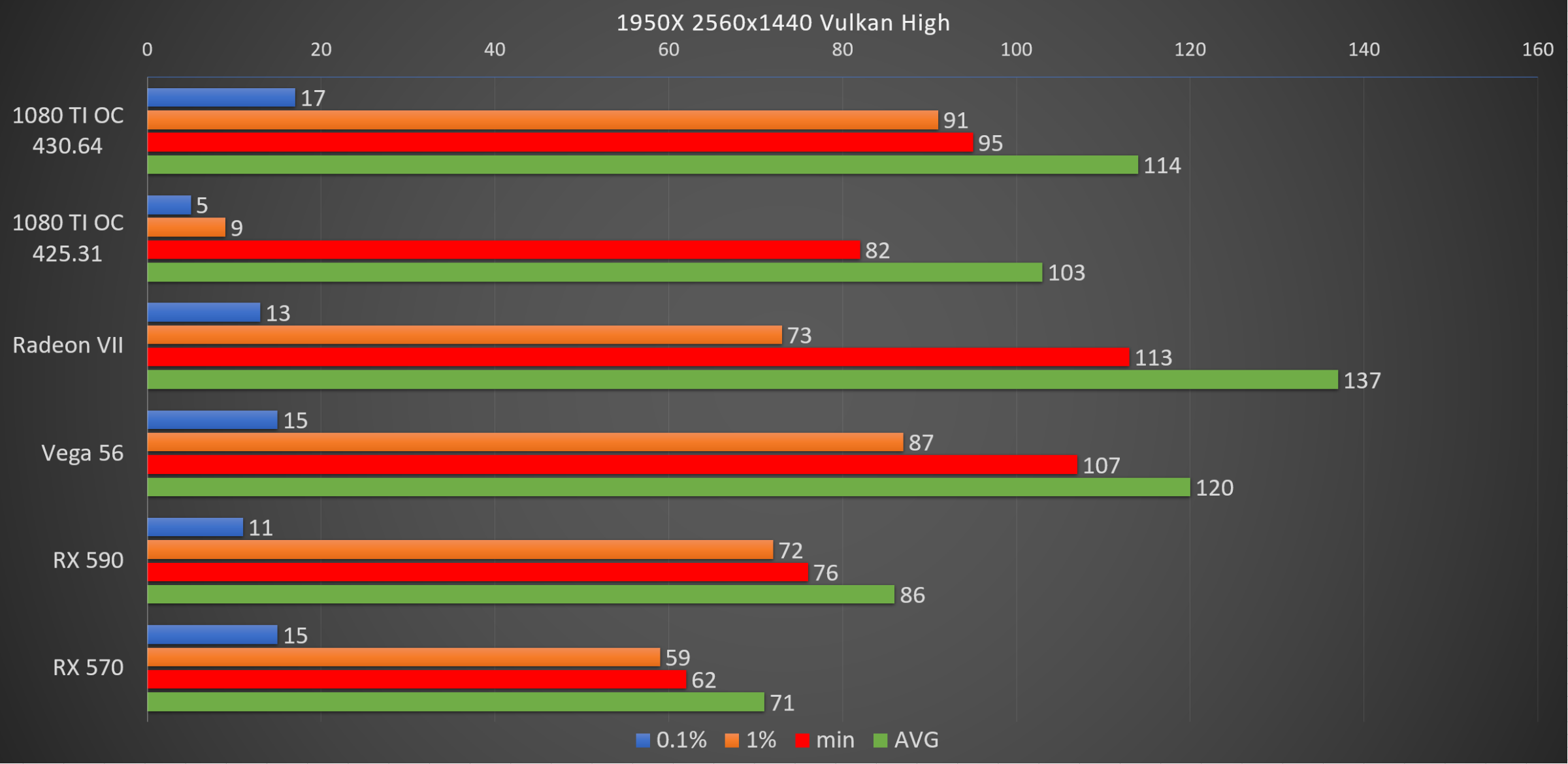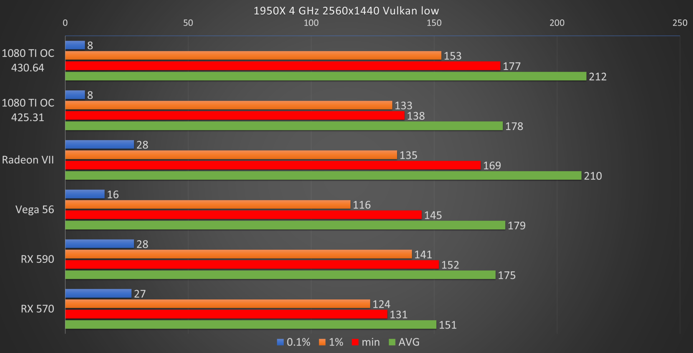 На момент тестирования вышедший драйвер 430.64 поднял производительность в Vulkan, но снизил производительность в DX 11 в FHD. Nvidia оказалась более процессорозависима, снижение настройки графики, приводит к тому что RX 570 начинает дышать в спину 1080 Ti. В DX 11 лидирует видеокарта 1080 Ti, в Vulkan AMD.