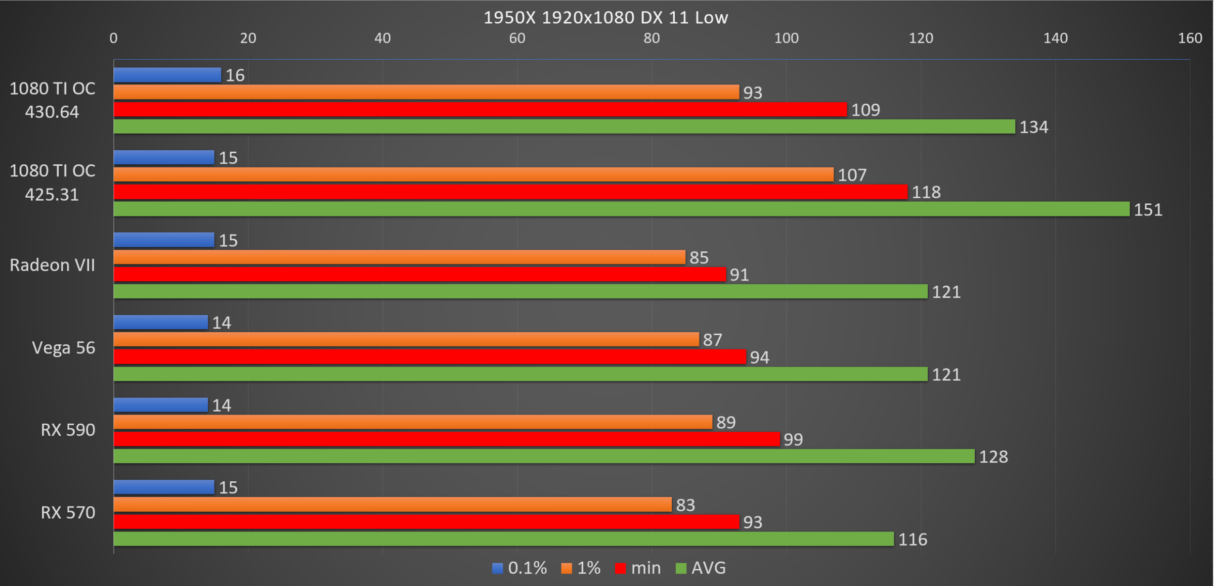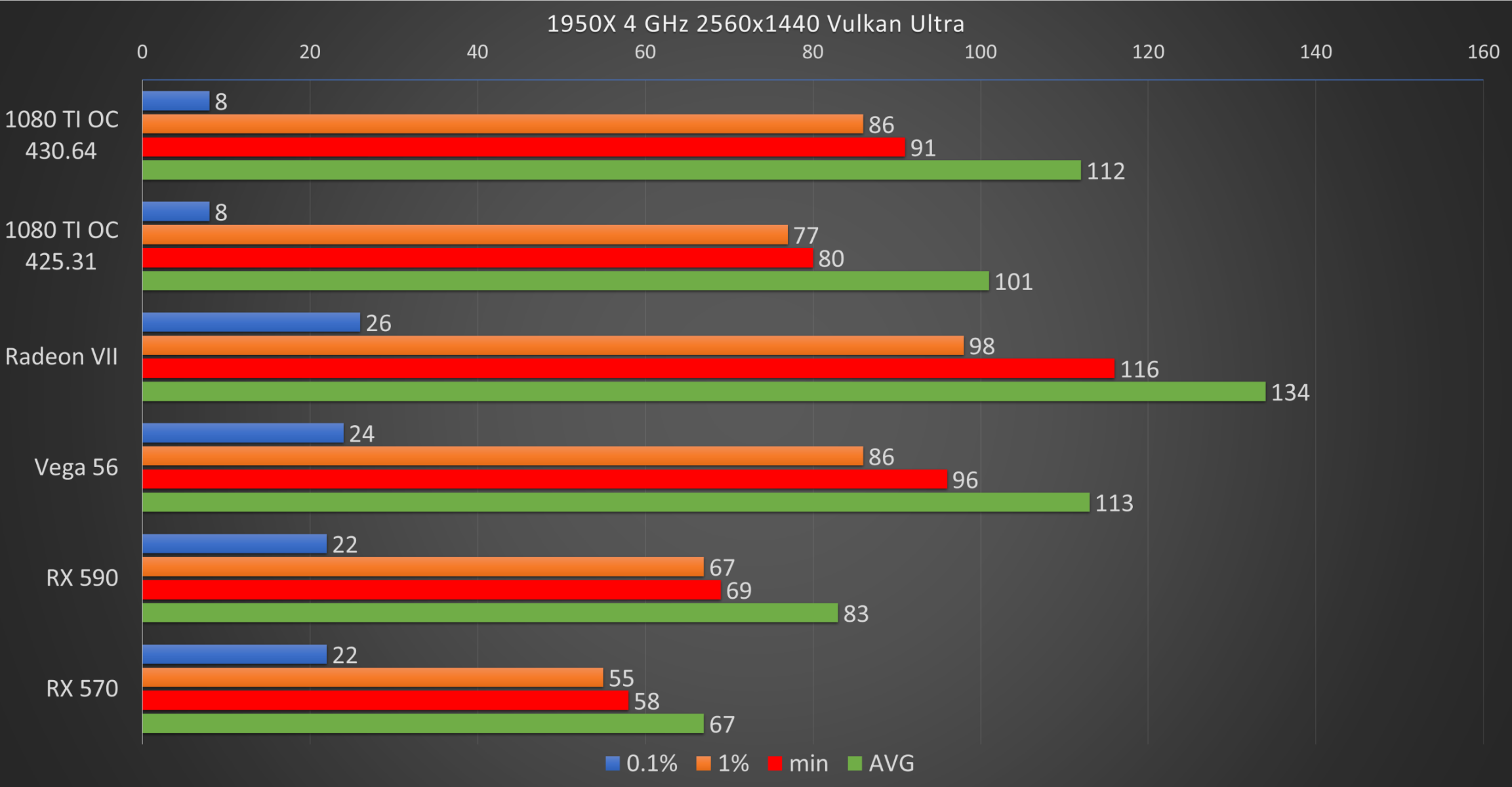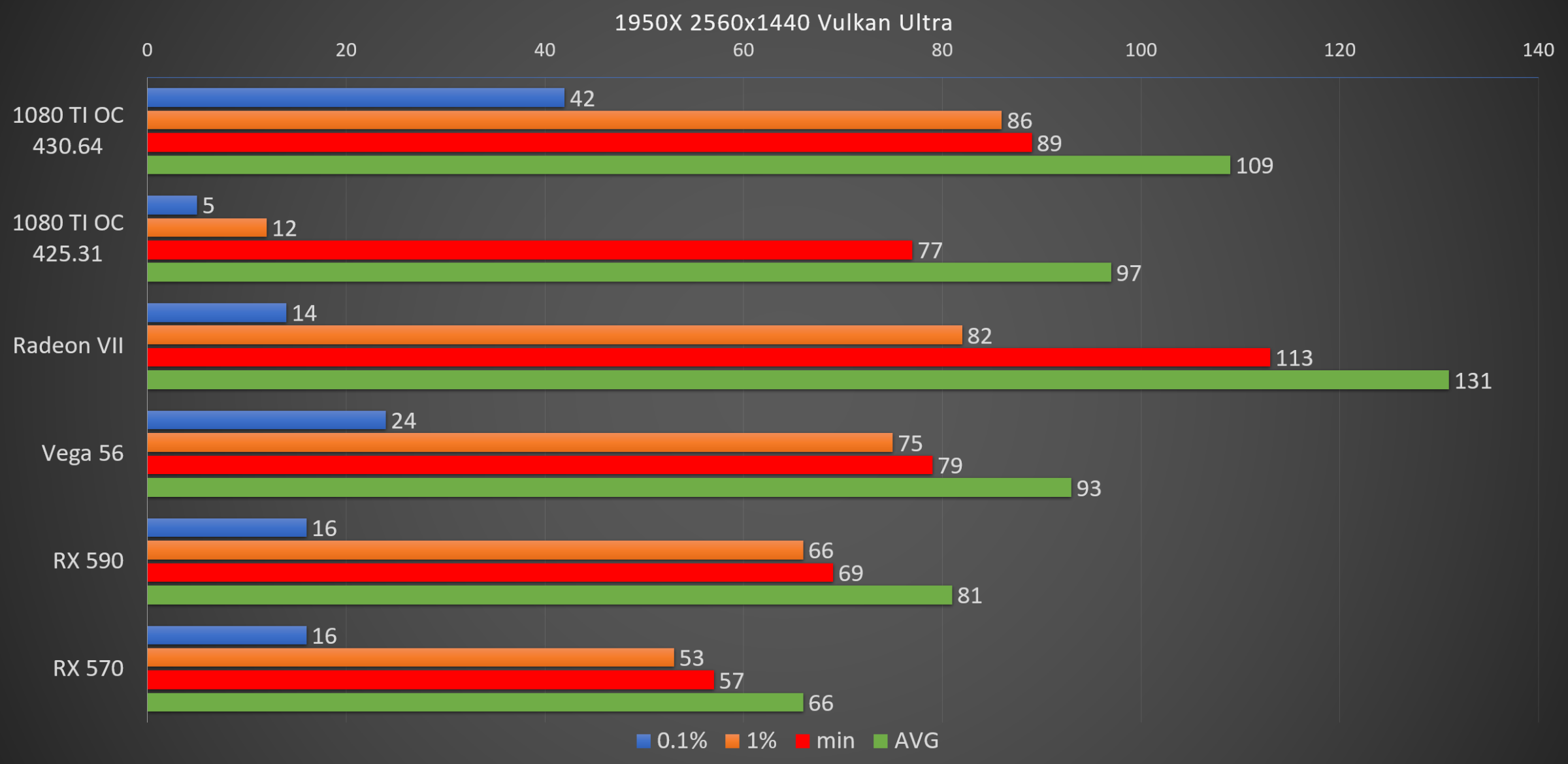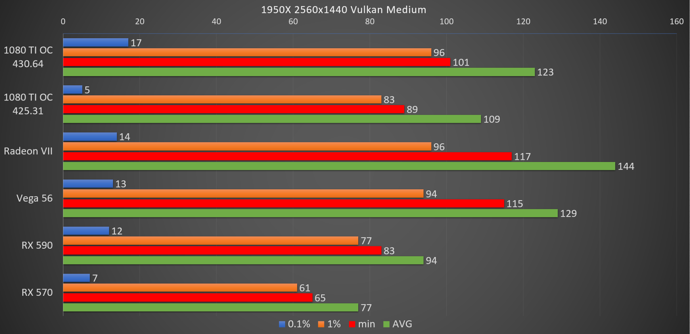 На момент тестирования вышедший драйвер 430.64 поднял производительность в Vulkan, но снизил производительность в DX 11 в FHD. Nvidia оказалась более процессорозависима, снижение настройки графики, приводит к тому что RX 570 начинает дышать в спину 1080 Ti. В DX 11 лидирует видеокарта 1080 Ti, в Vulkan AMD.