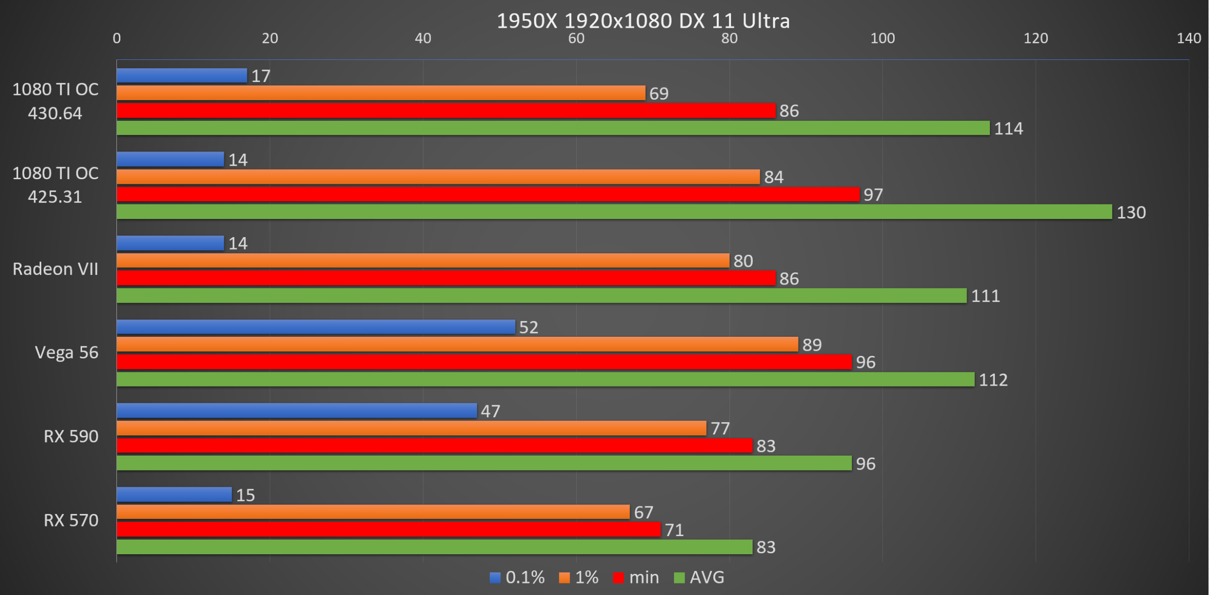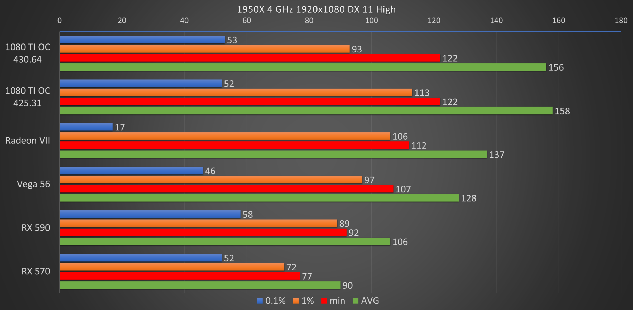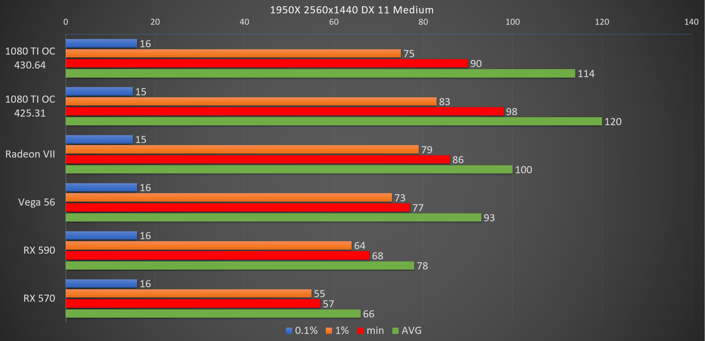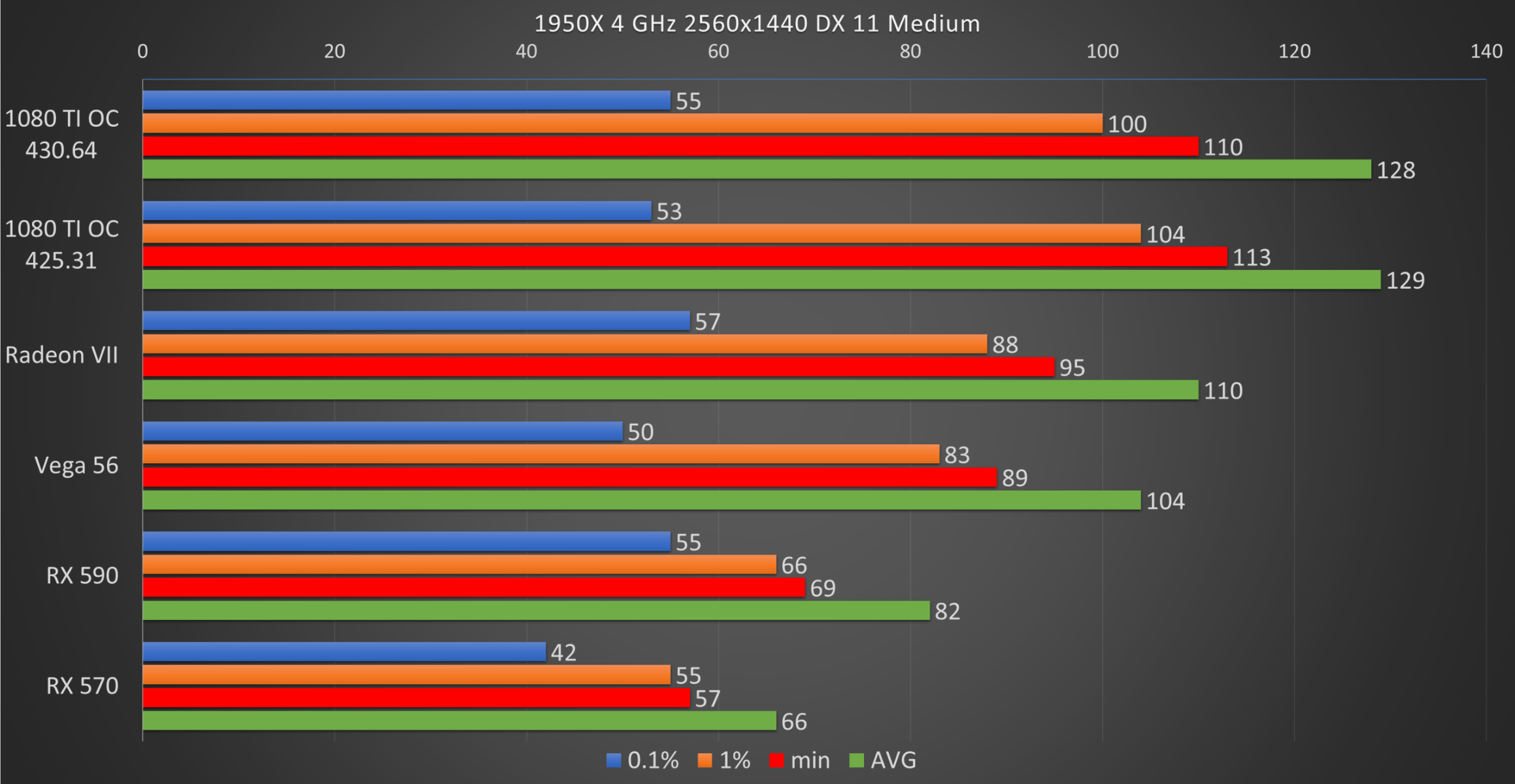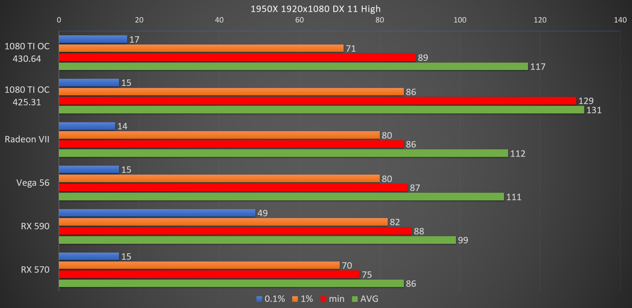 На момент тестирования вышедший драйвер 430.64 поднял производительность в Vulkan, но снизил производительность в DX 11 в FHD. Nvidia оказалась более процессорозависима, снижение настройки графики, приводит к тому что RX 570 начинает дышать в спину 1080 Ti. В DX 11 лидирует видеокарта 1080 Ti, в Vulkan AMD.