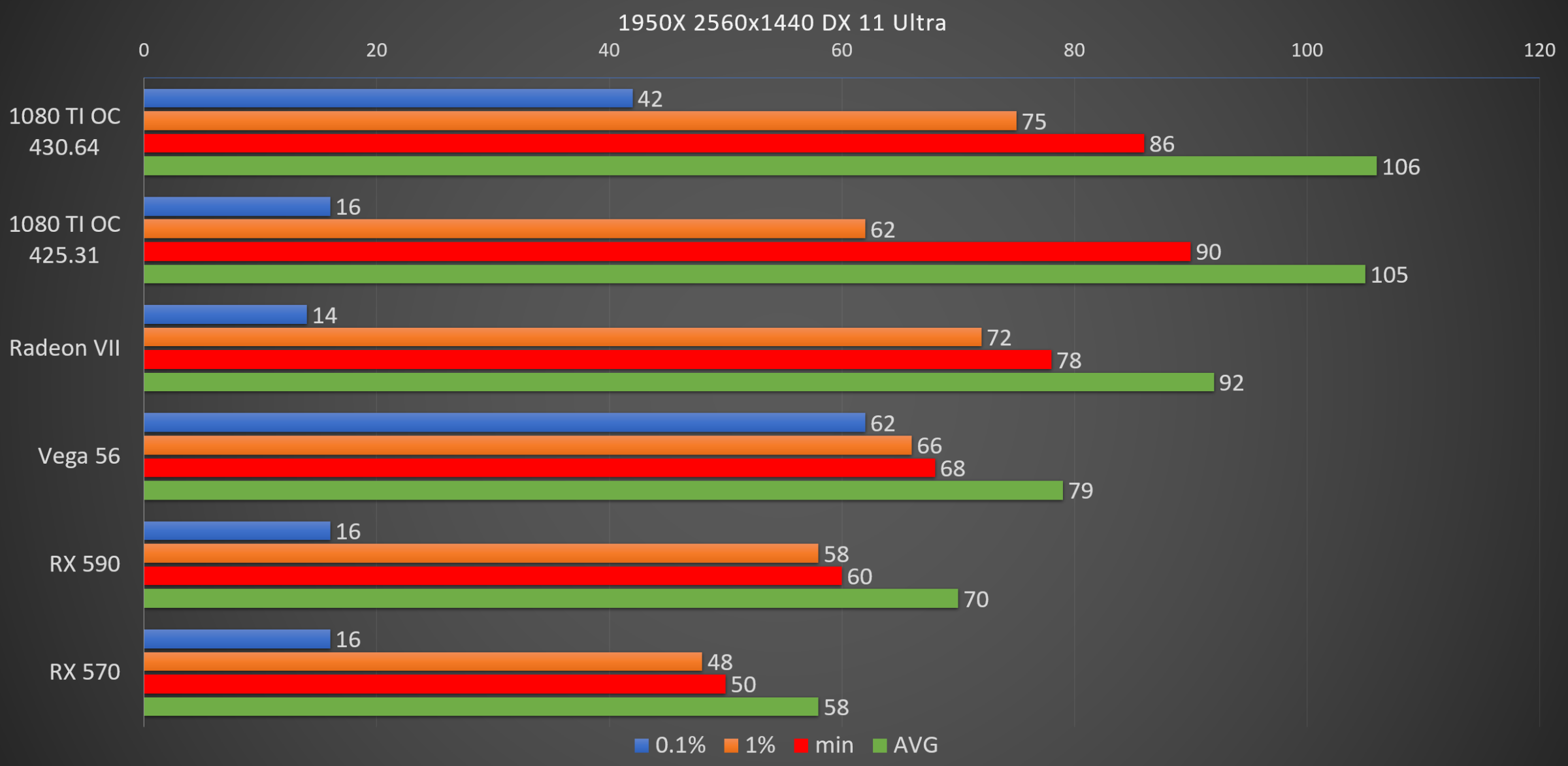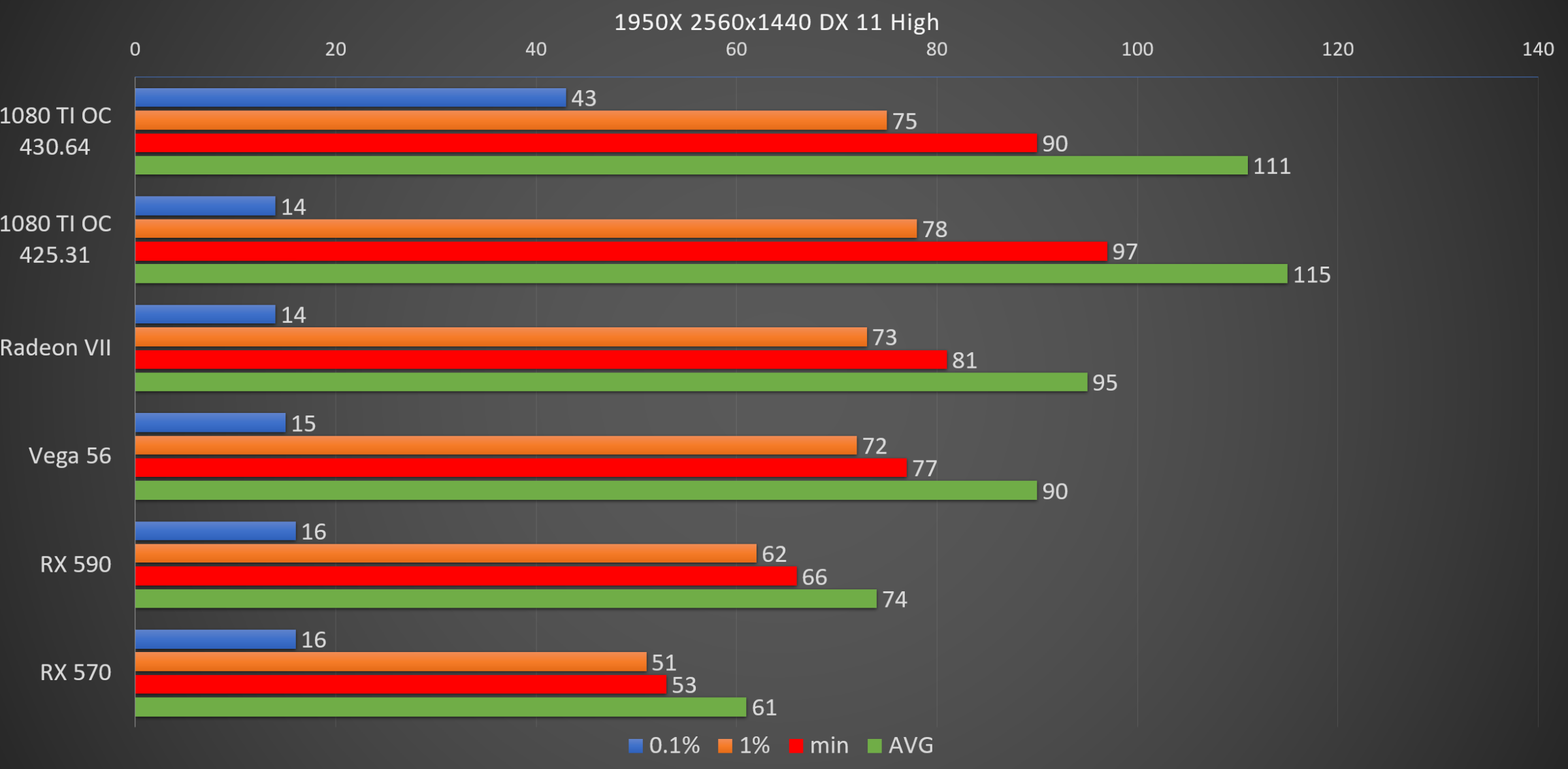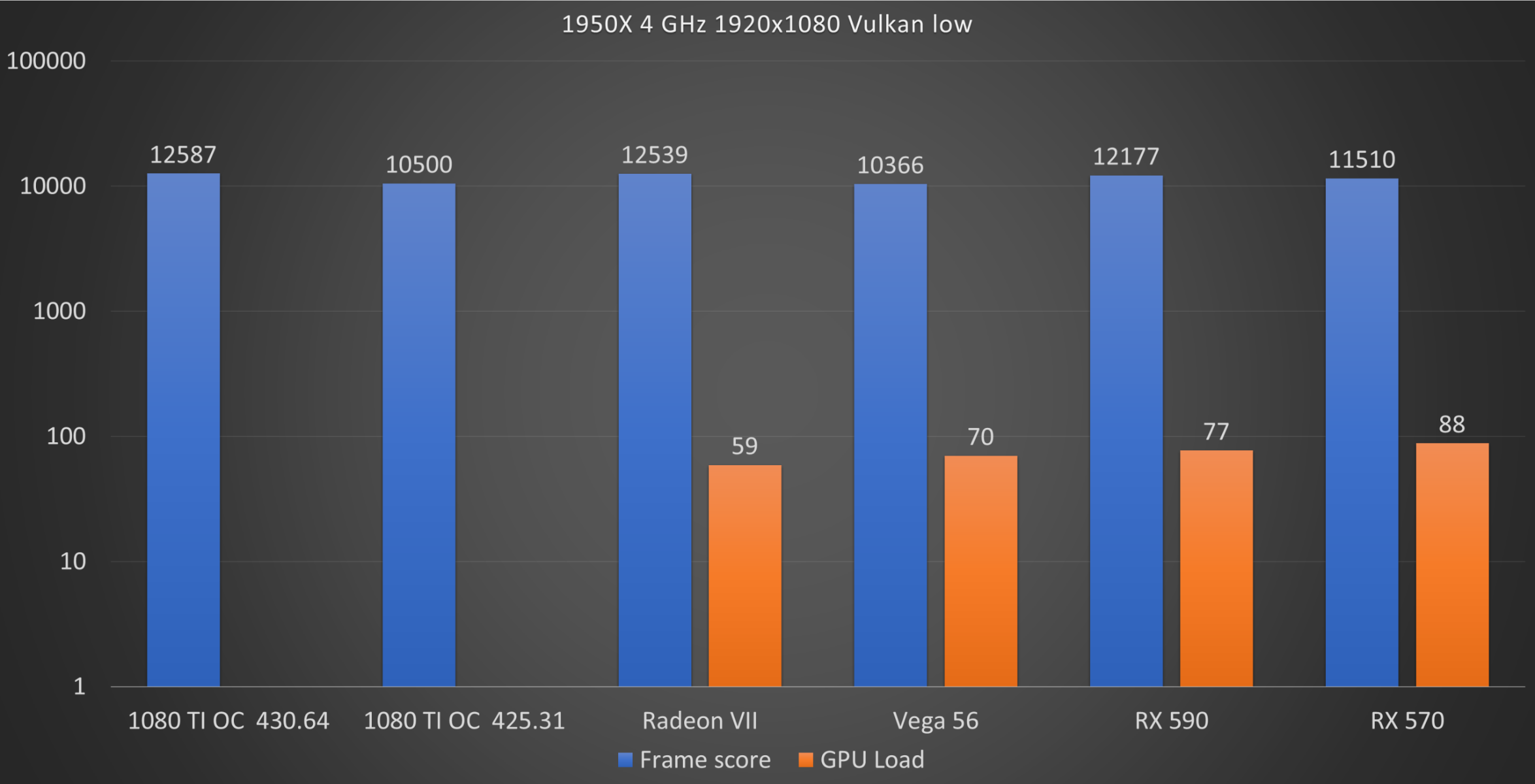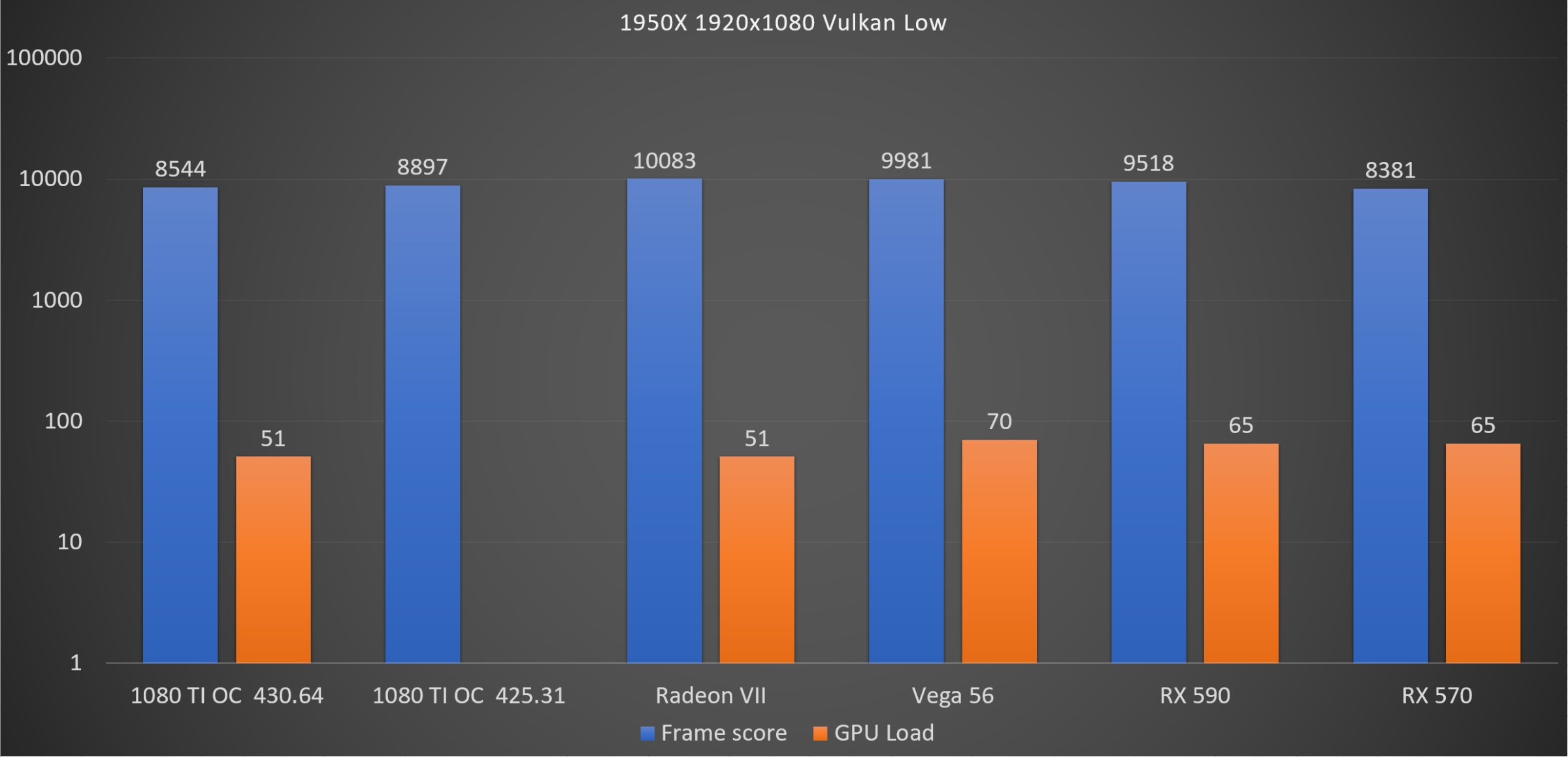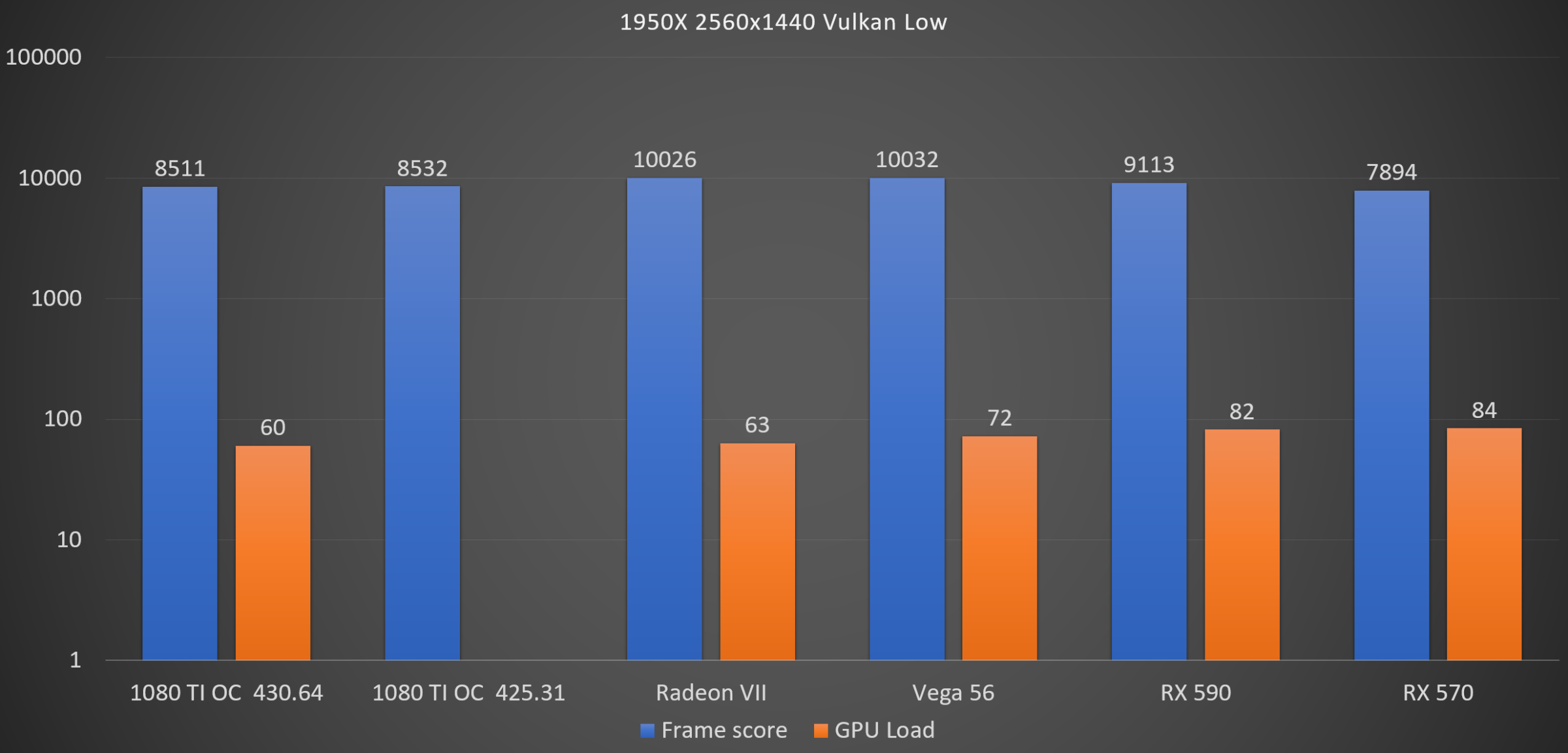 На момент тестирования вышедший драйвер 430.64 поднял производительность в Vulkan, но снизил производительность в DX 11 в FHD. Nvidia оказалась более процессорозависима, снижение настройки графики, приводит к тому что RX 570 начинает дышать в спину 1080 Ti. В DX 11 лидирует видеокарта 1080 Ti, в Vulkan AMD.