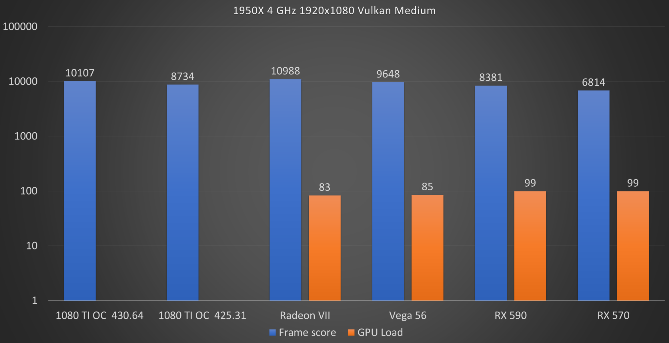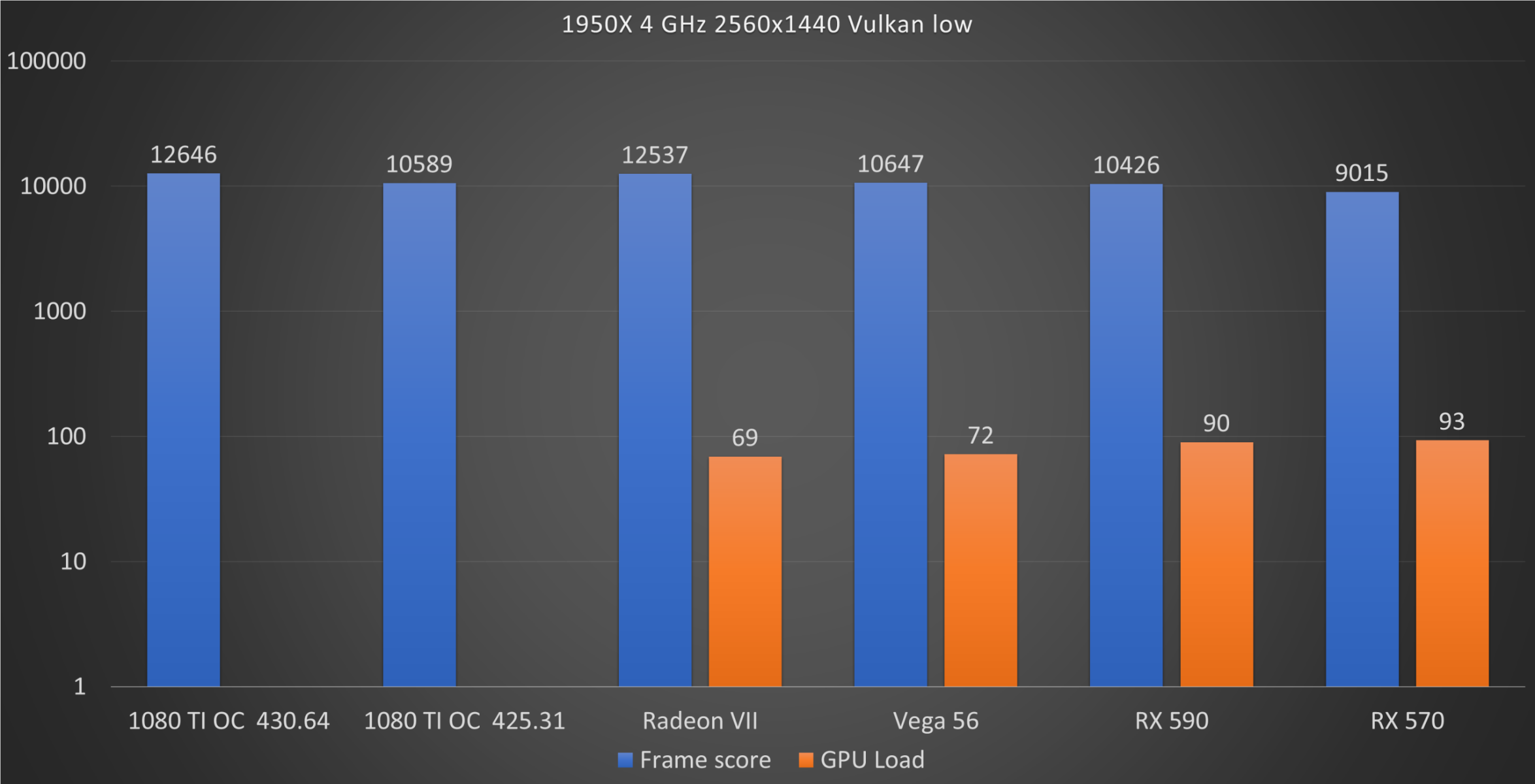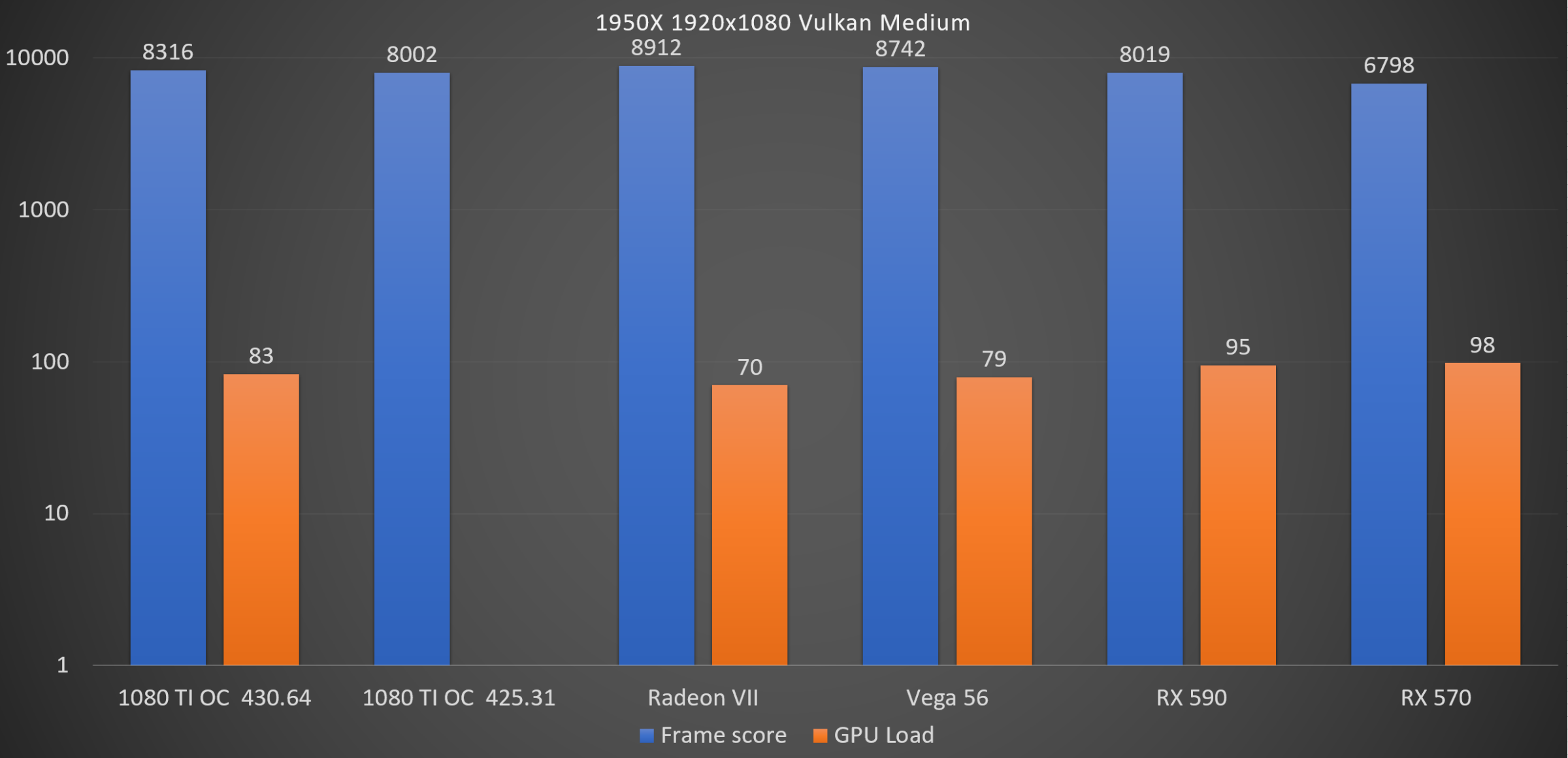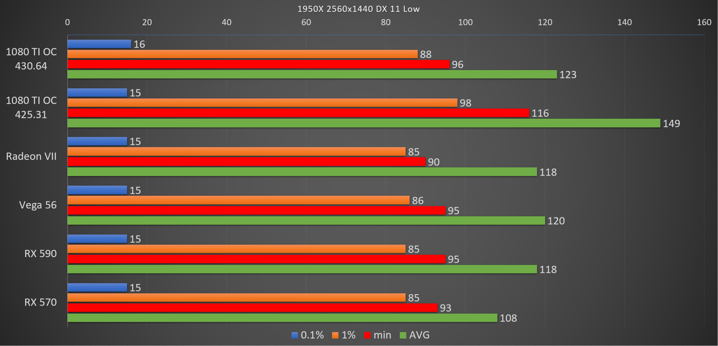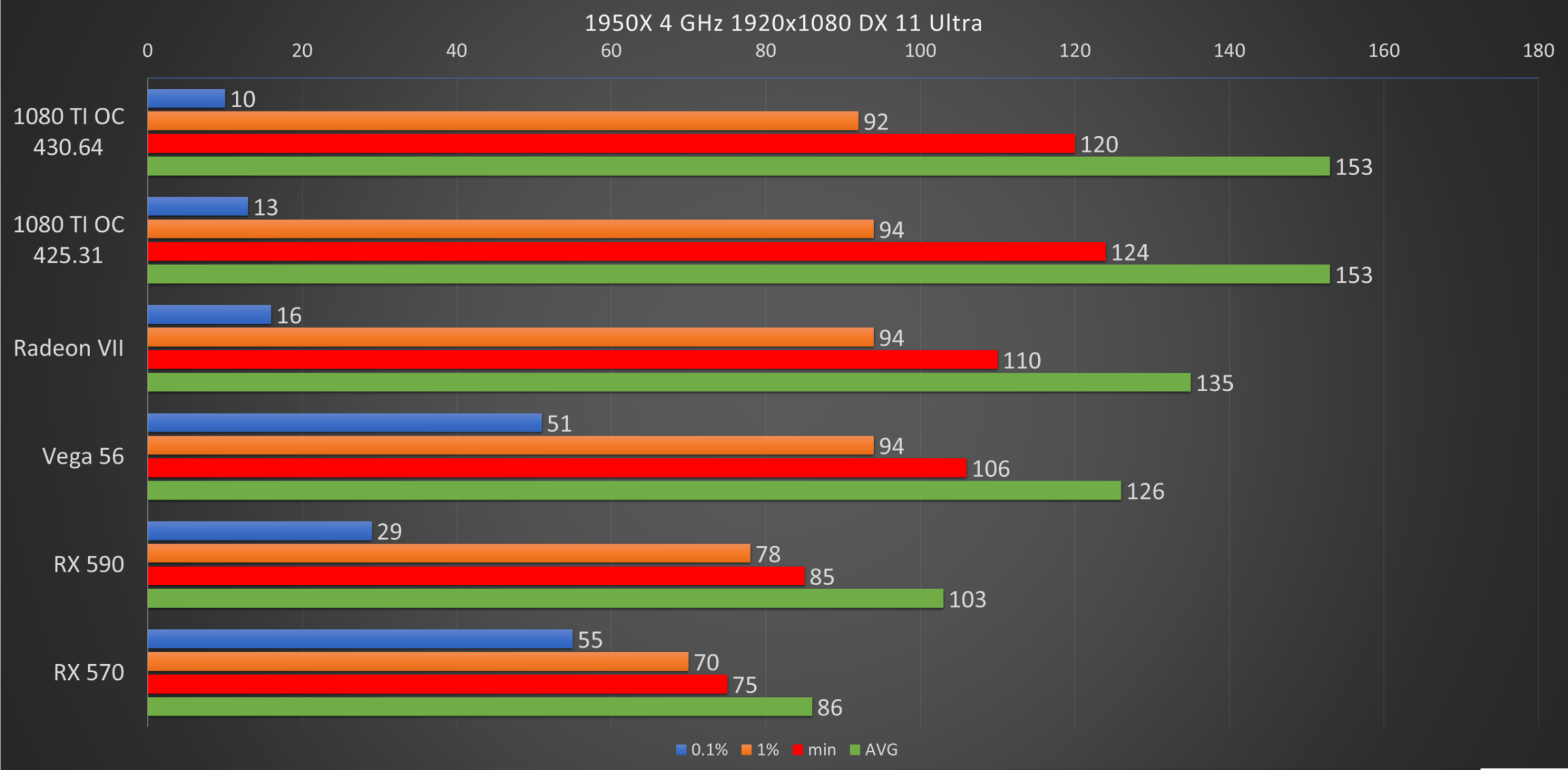 На момент тестирования вышедший драйвер 430.64 поднял производительность в Vulkan, но снизил производительность в DX 11 в FHD. Nvidia оказалась более процессорозависима, снижение настройки графики, приводит к тому что RX 570 начинает дышать в спину 1080 Ti. В DX 11 лидирует видеокарта 1080 Ti, в Vulkan AMD.