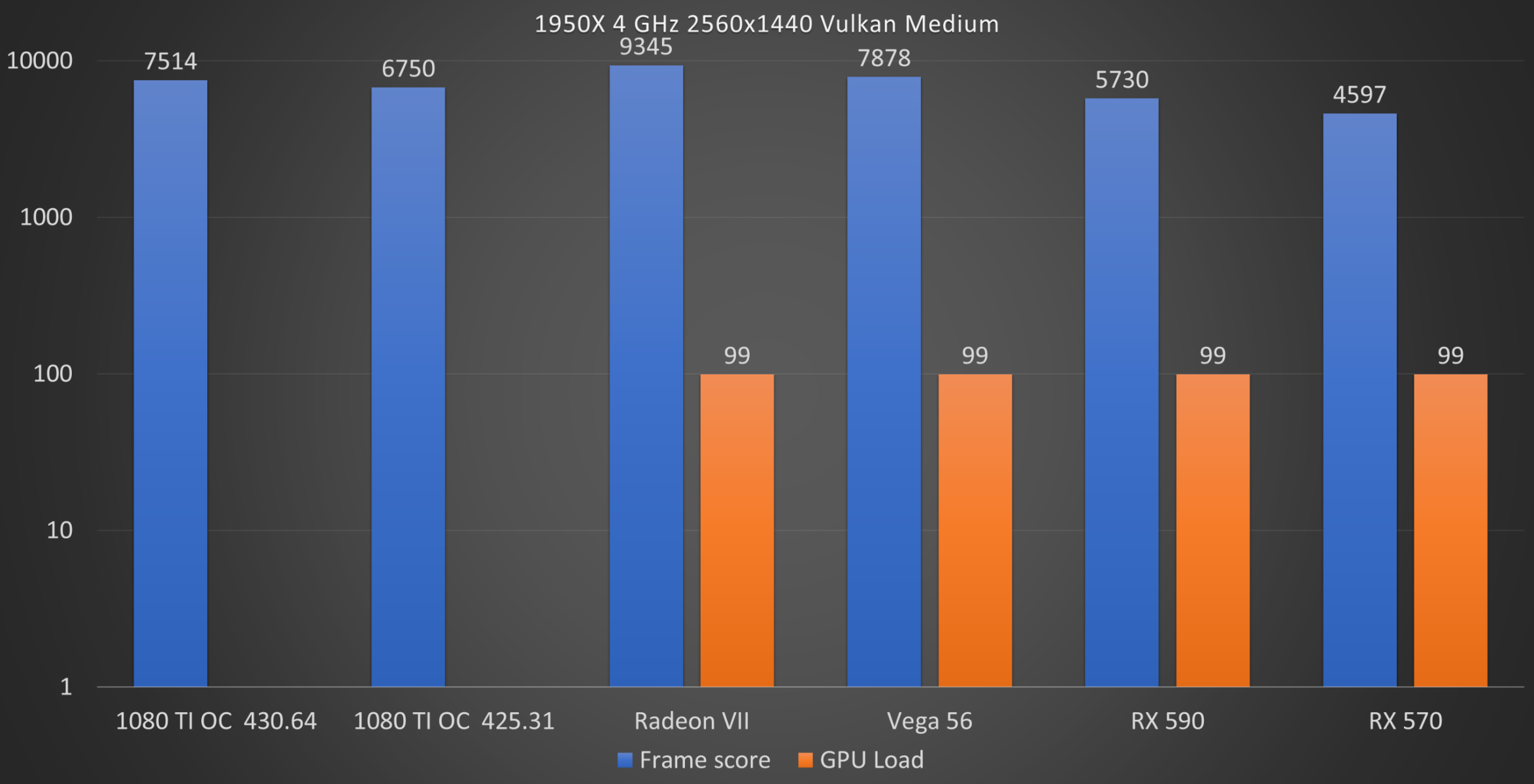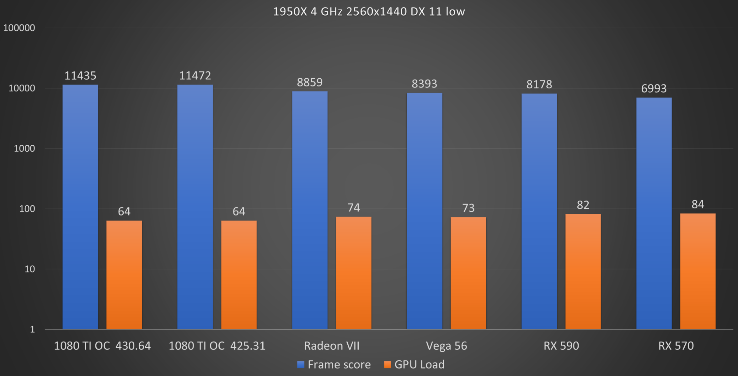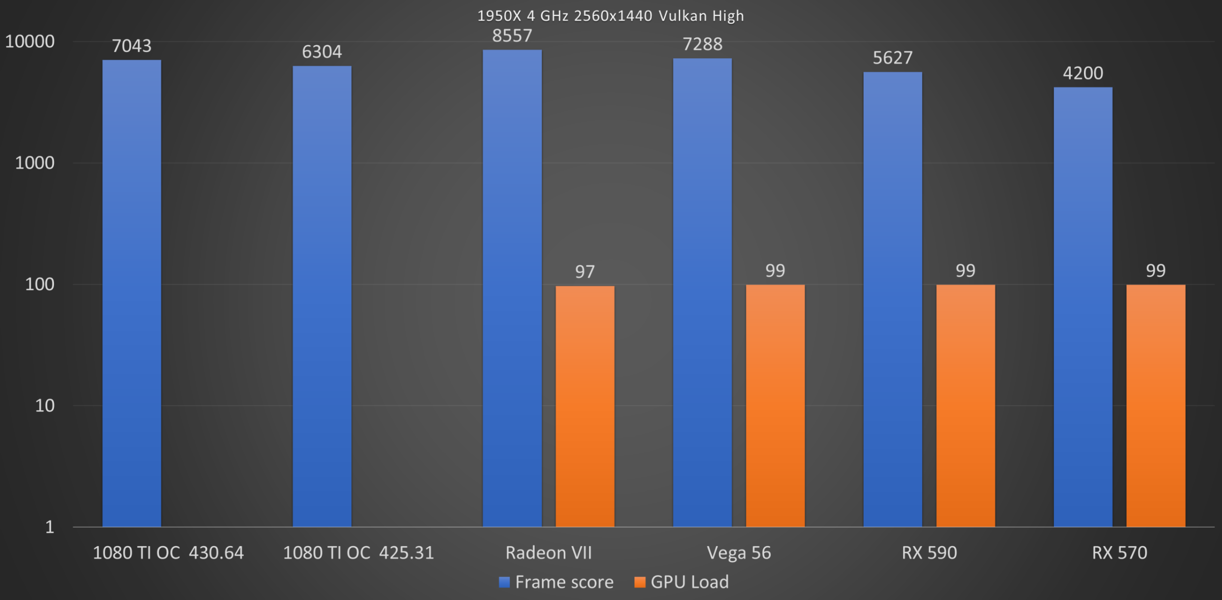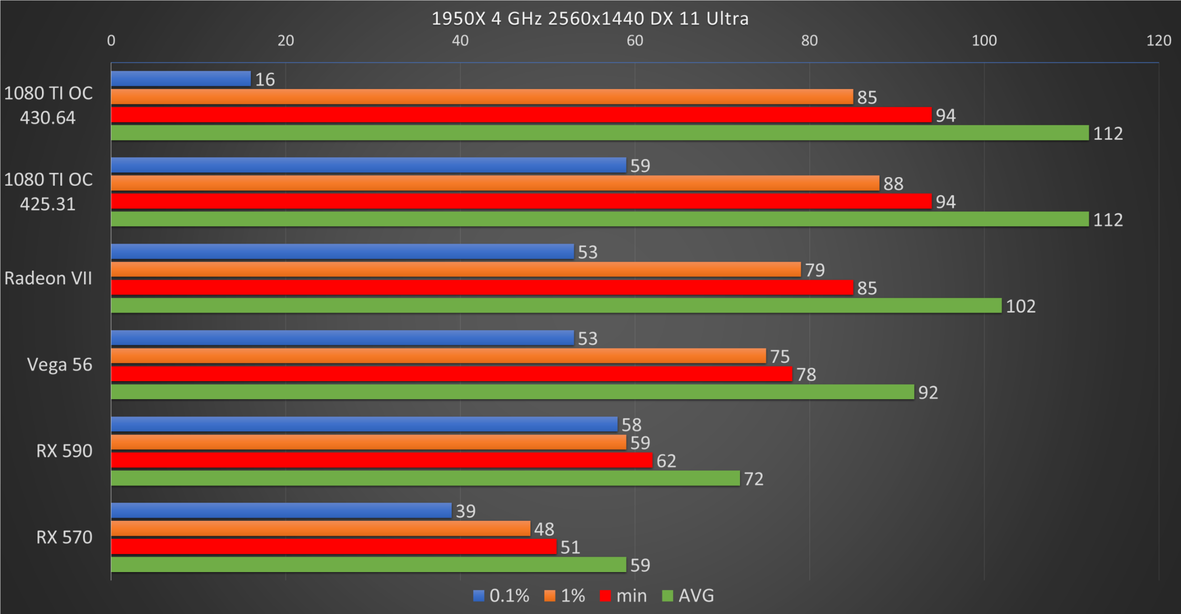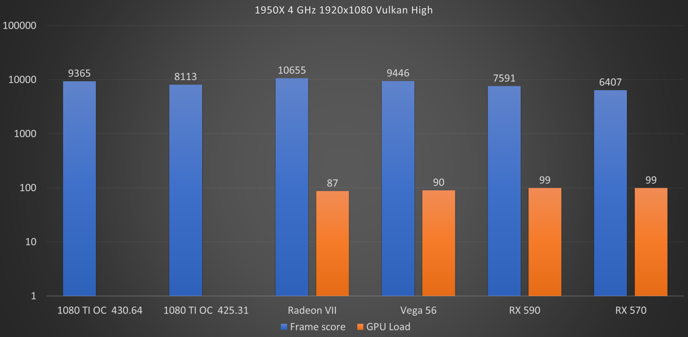 На момент тестирования вышедший драйвер 430.64 поднял производительность в Vulkan, но снизил производительность в DX 11 в FHD. Nvidia оказалась более процессорозависима, снижение настройки графики, приводит к тому что RX 570 начинает дышать в спину 1080 Ti. В DX 11 лидирует видеокарта 1080 Ti, в Vulkan AMD.