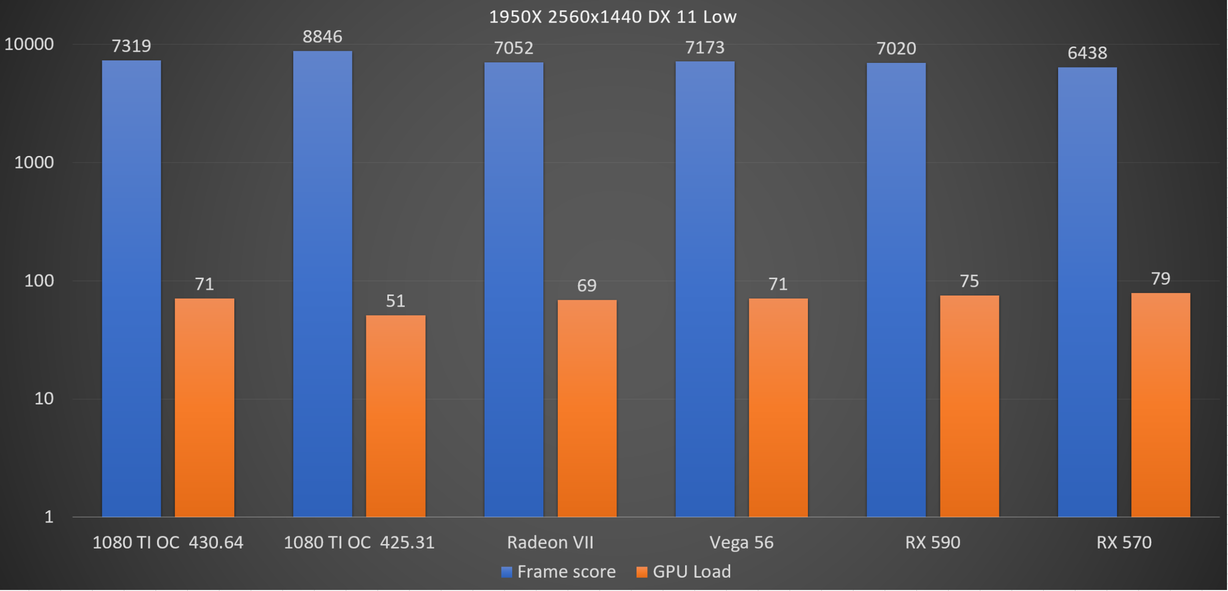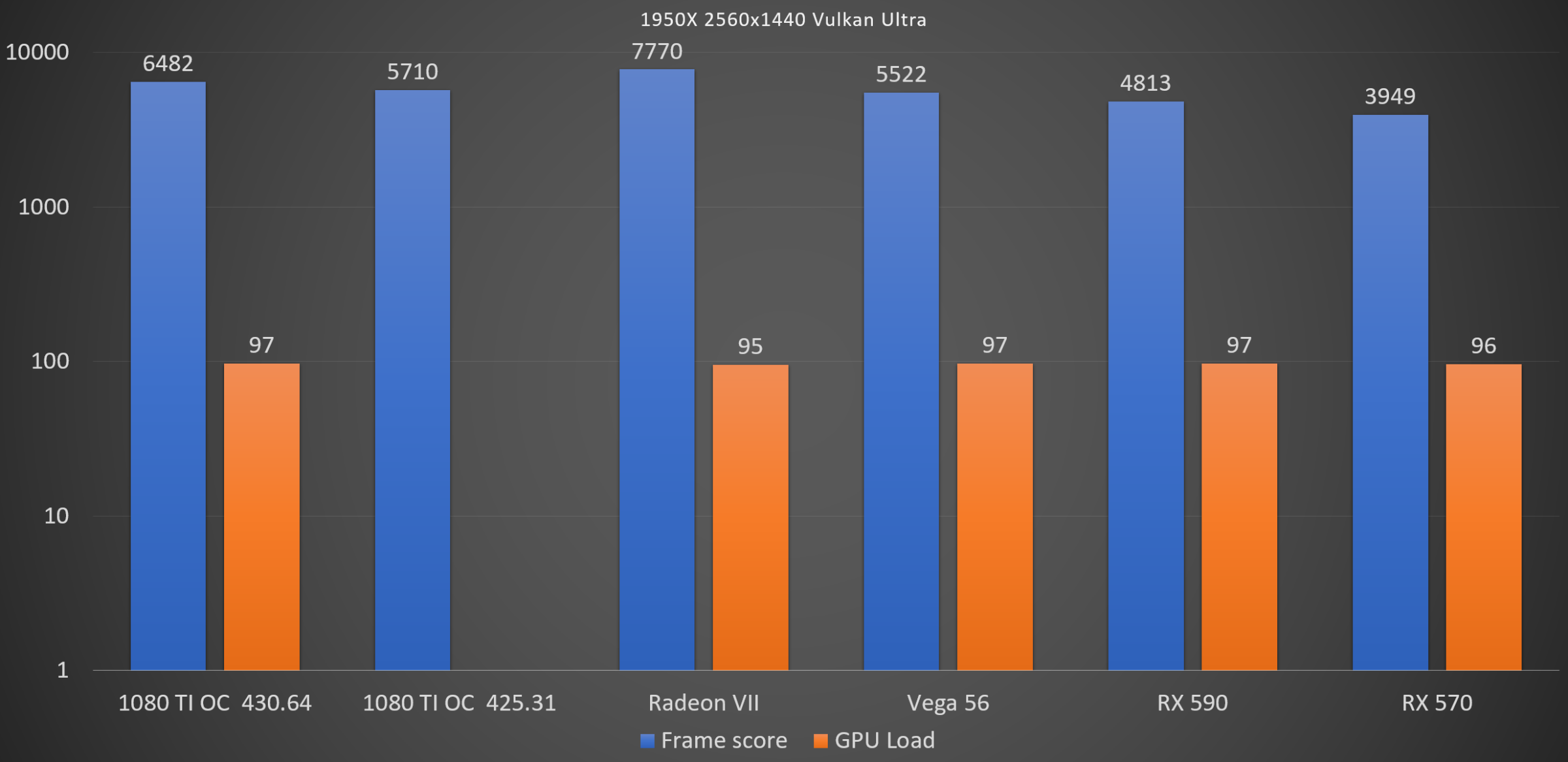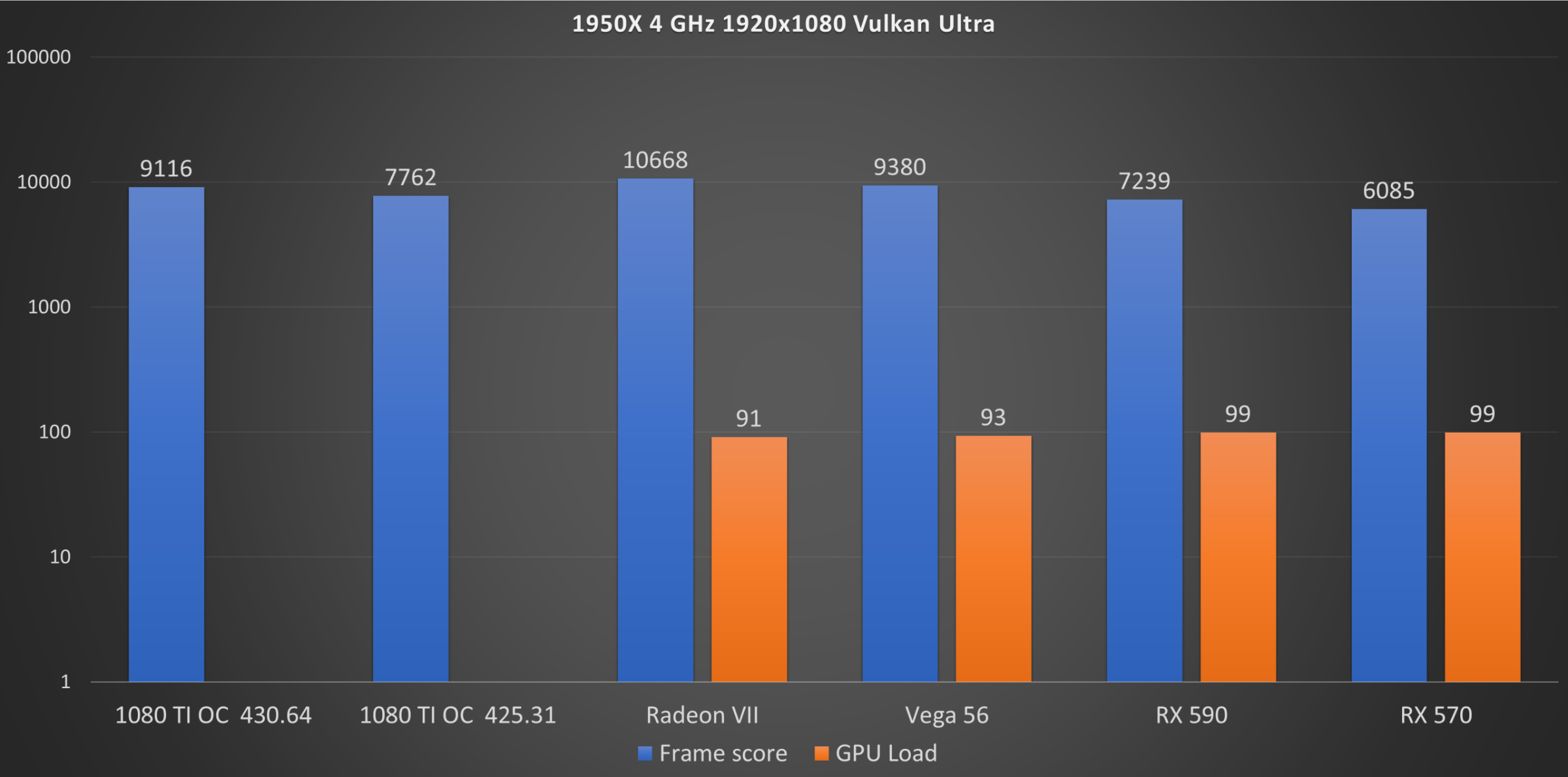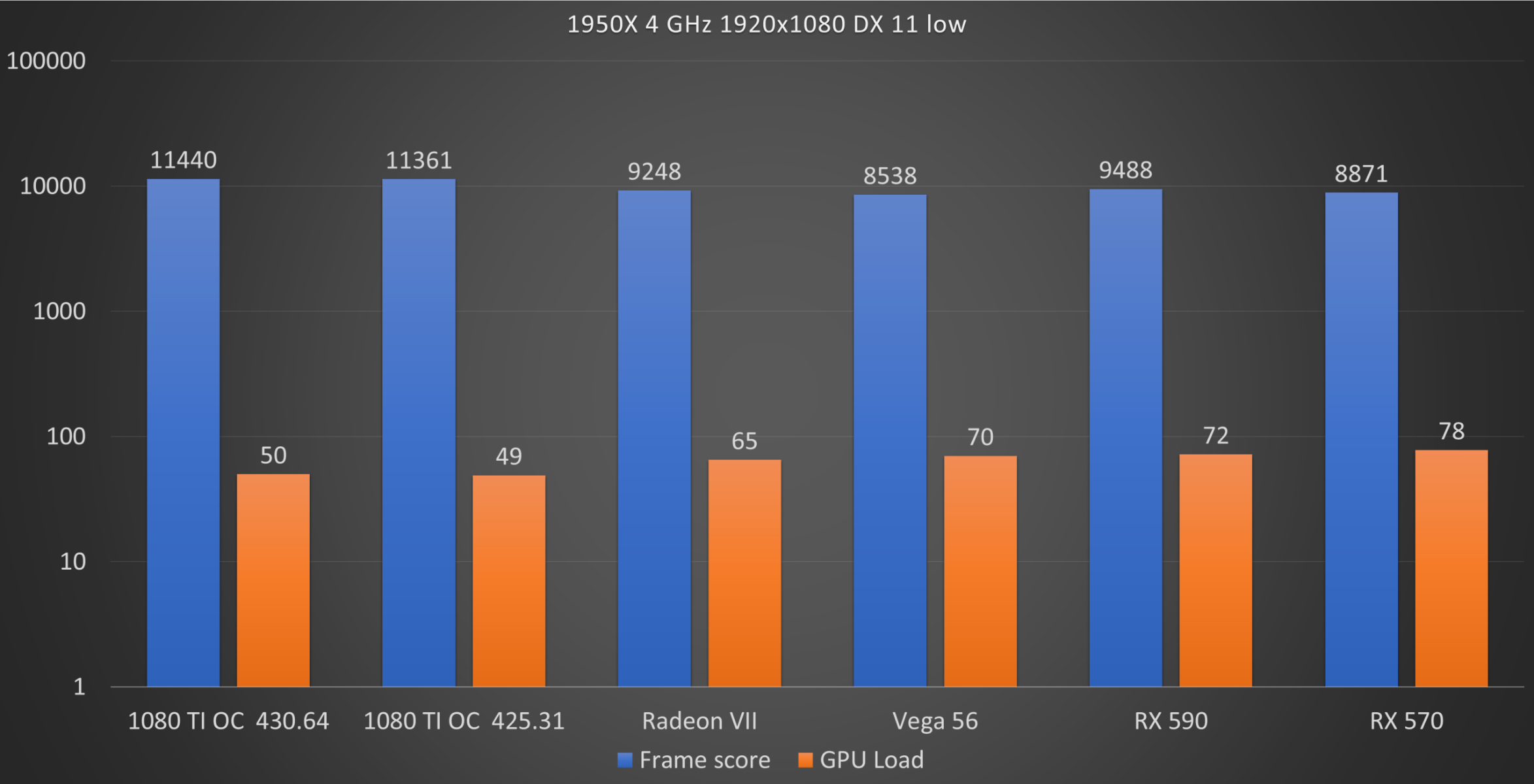 На момент тестирования вышедший драйвер 430.64 поднял производительность в Vulkan, но снизил производительность в DX 11 в FHD. Nvidia оказалась более процессорозависима, снижение настройки графики, приводит к тому что RX 570 начинает дышать в спину 1080 Ti. В DX 11 лидирует видеокарта 1080 Ti, в Vulkan AMD.