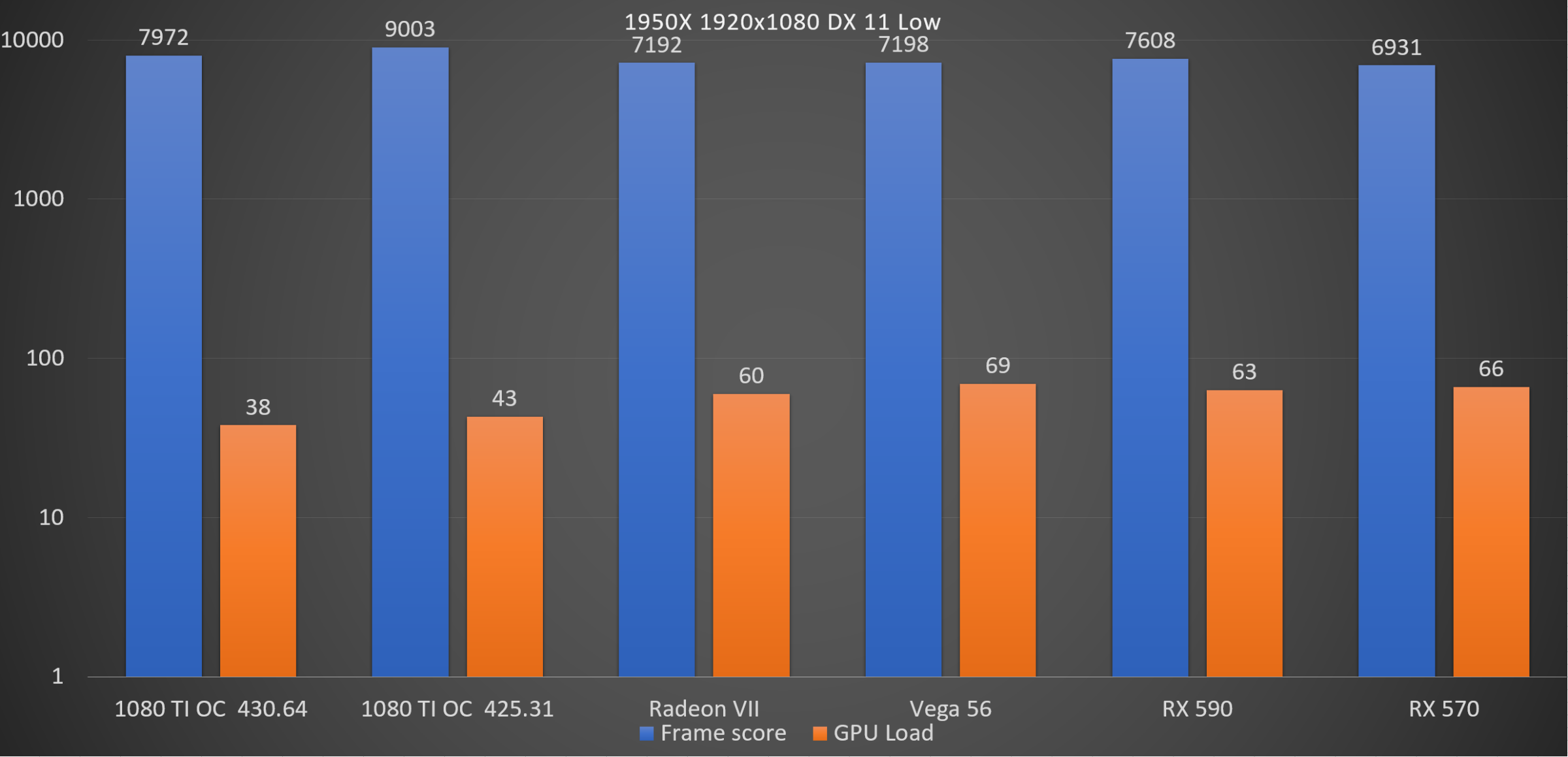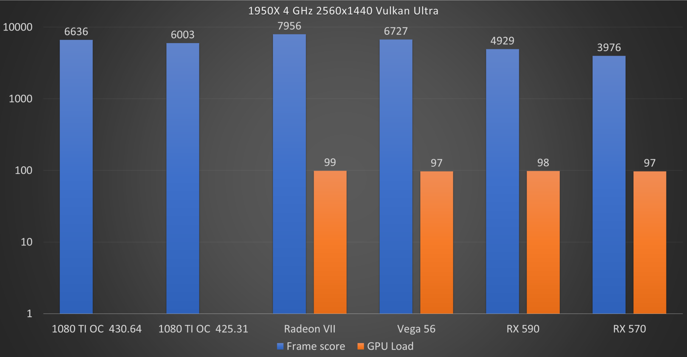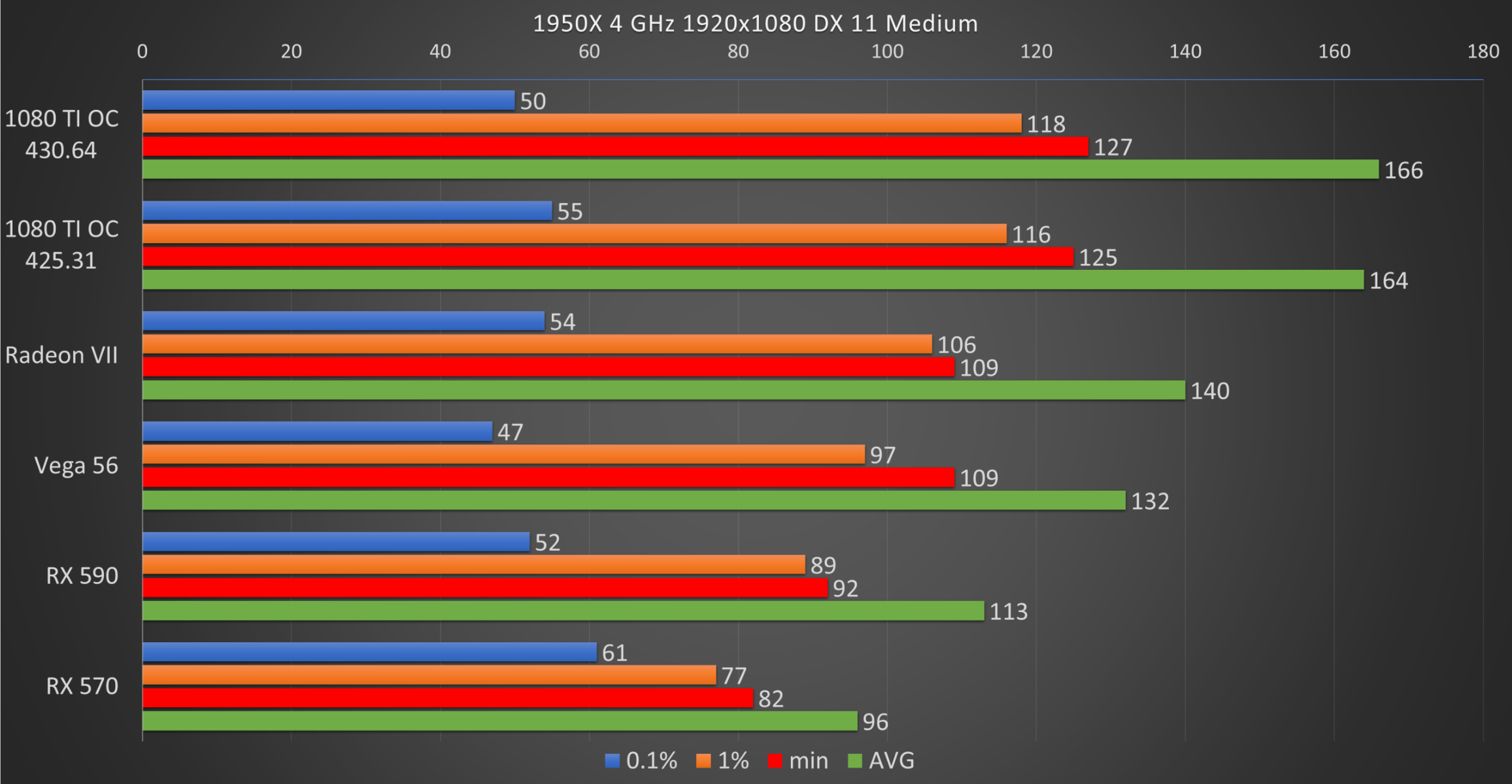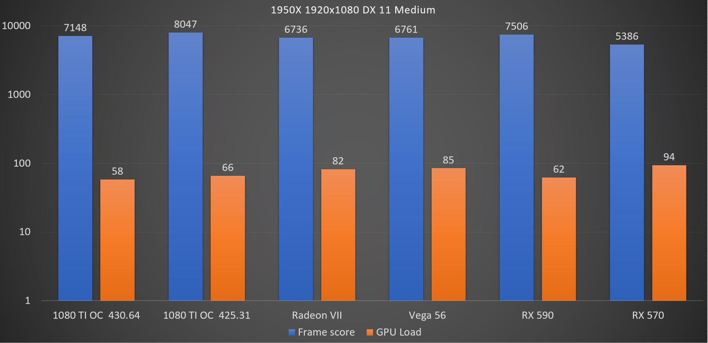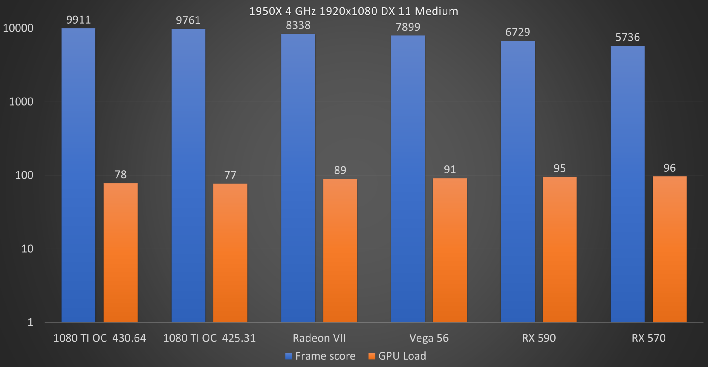 На момент тестирования вышедший драйвер 430.64 поднял производительность в Vulkan, но снизил производительность в DX 11 в FHD. Nvidia оказалась более процессорозависима, снижение настройки графики, приводит к тому что RX 570 начинает дышать в спину 1080 Ti. В DX 11 лидирует видеокарта 1080 Ti, в Vulkan AMD.