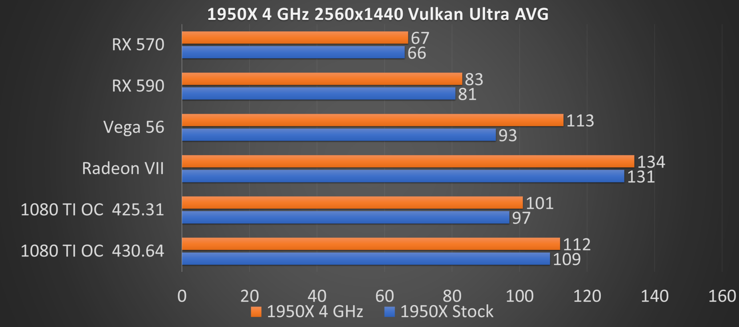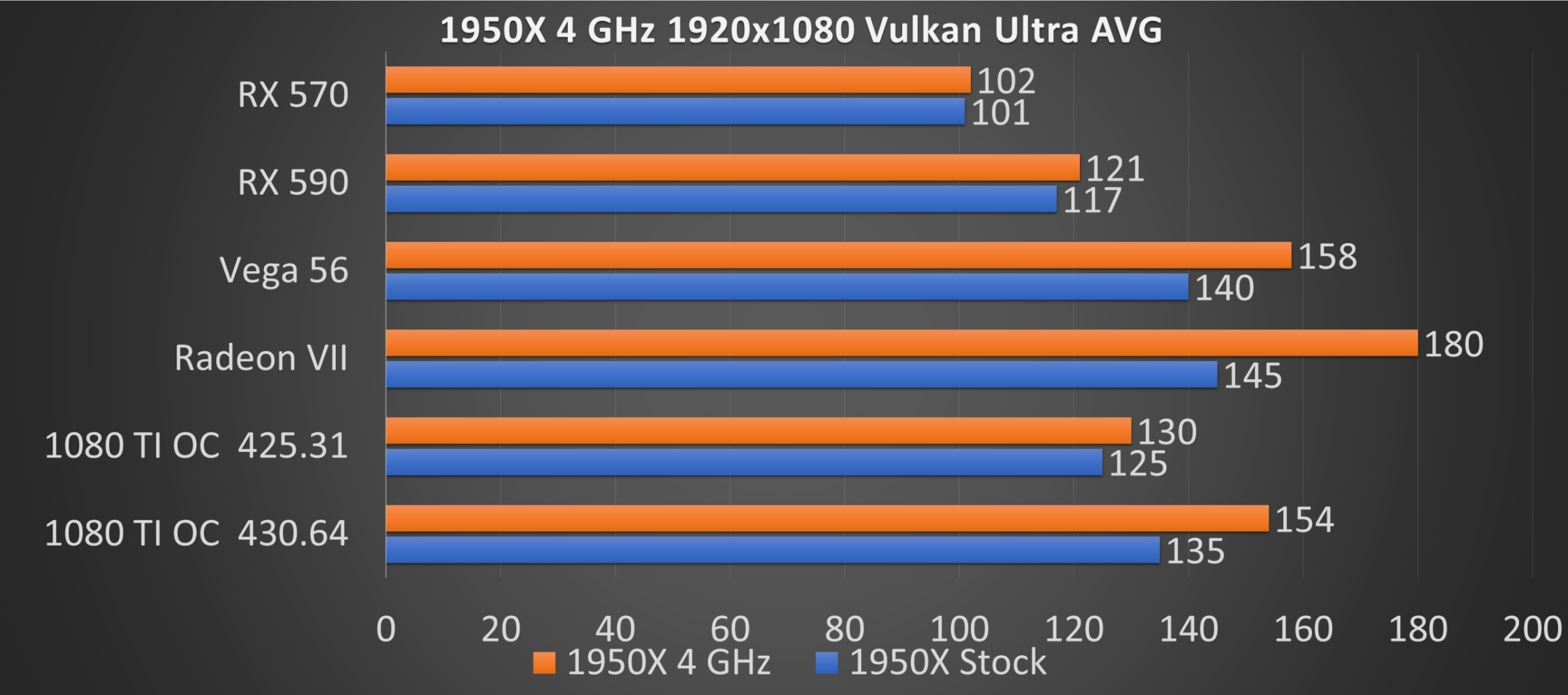 С разогнанным процессором в DX 11 1920x1080 у 1080 Ti нет проблем c производительностью в обоих версиях драйвера. Со снижением качества графики в Vulkan наблюдается обратная картина, видеокарта 1080 Ti вырывается в лидеры.