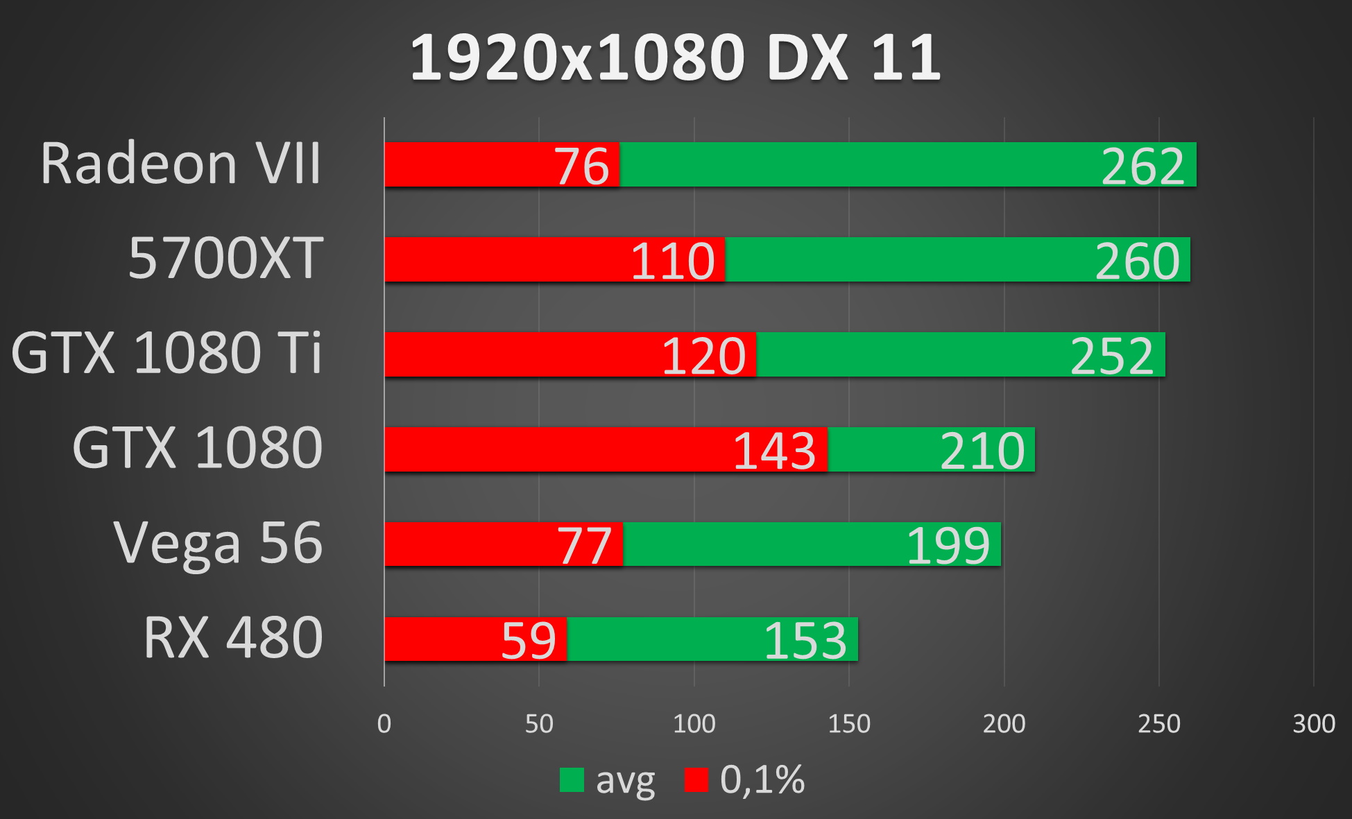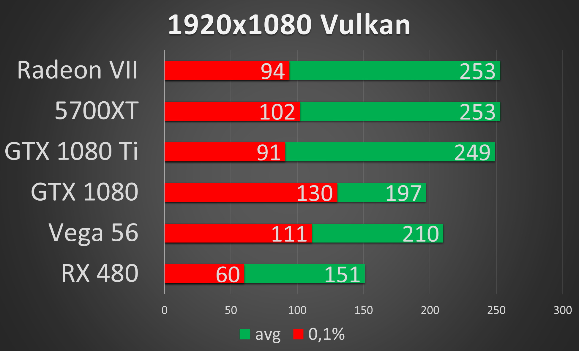 Игра лучше всего оптимизирована под видеокарты AMD. Лидерами по производительности оказались видеокарты Radeon VII, 5700 XT и GTX 1080 Ti. Все данные получены во время записи с использованием Relive и Shadow Play. Vulkan поднял производительность для всех видеокарт AMD в разрешении 2560x1440 и в 1920x1080 только для Vega 56, а Nvidia теряет производительность. Все тесты были произведены на настройках “Общее качество” ультра. Для всех видеокарт есть тест записи видео сравнения DX 11 Vs Vulkan.
