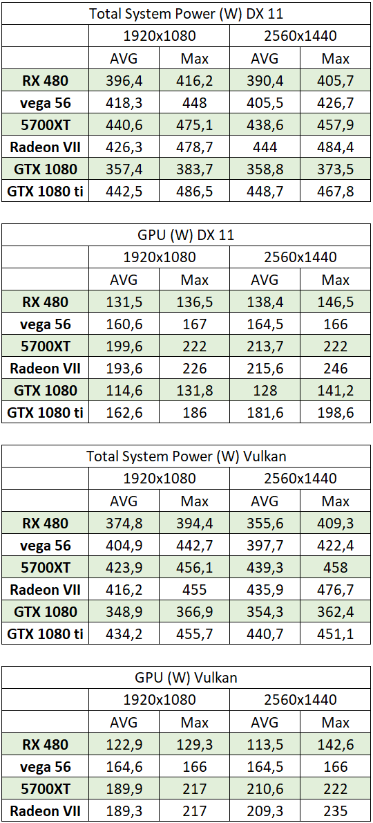 Измерения проводились с помощью MSI Afterburner 4.6.2 в режиме бенчмарк. Тест в игре проводился в бесплатные выходные, использовался встроенный бенчмарк. Энергопотребление системы измерялось через программу HWiNFO64 и Corsair link (Corsair HX1000i), с частотой опроса 1 секунда (1000 мс). Обработка результатов энергопотребления производилась в программе GenericLogViewer v5.2. Для видеокарты RX 480 использовался BIOS 165 Вт. Все видеокарты тестировались на заводских частотах