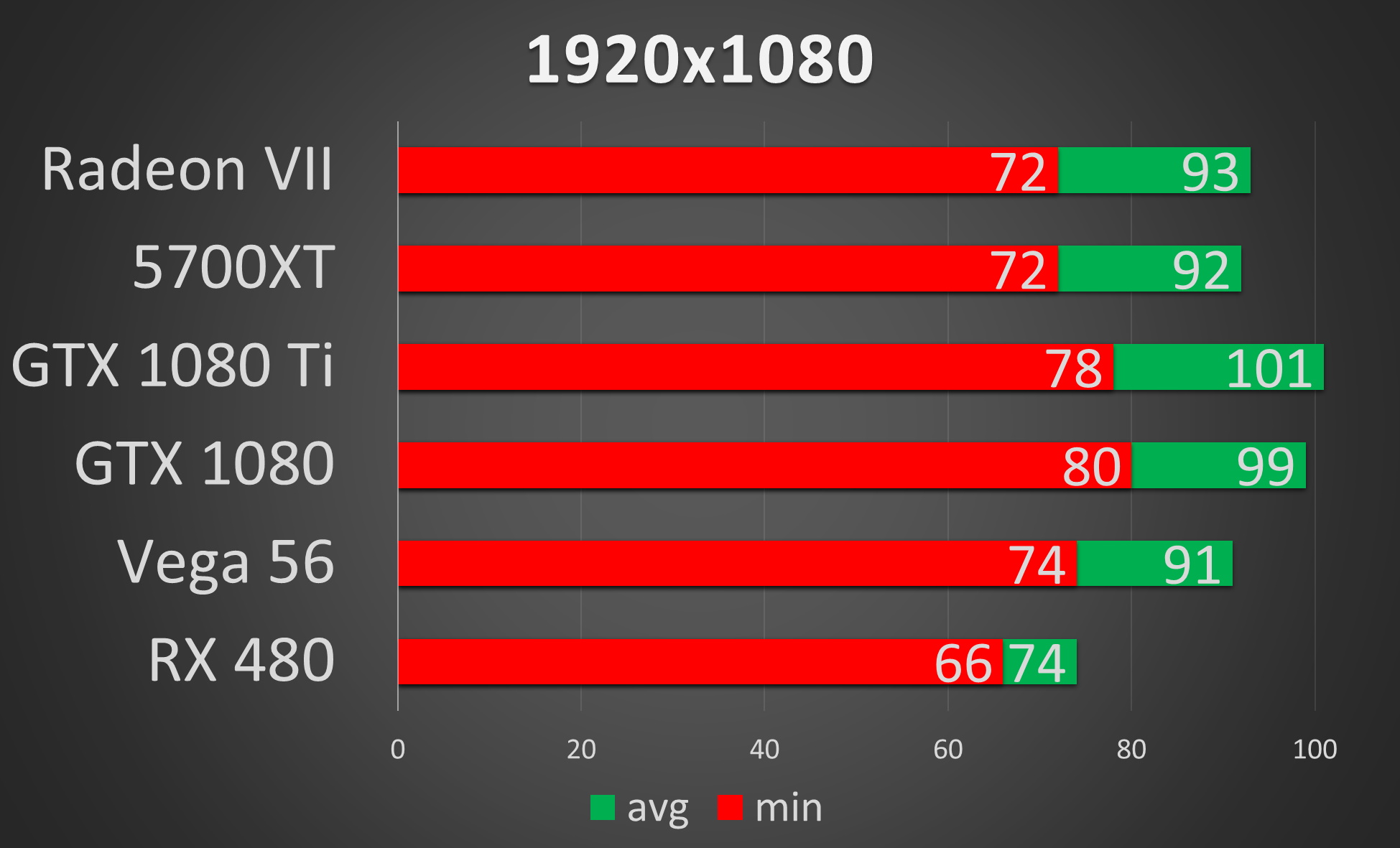 В 1920x1080 производительность видеокарт ограничивает процессор, за исключением RX 480. Процессорозависимость видеокарт AMD выше, чем у NVIDIA.