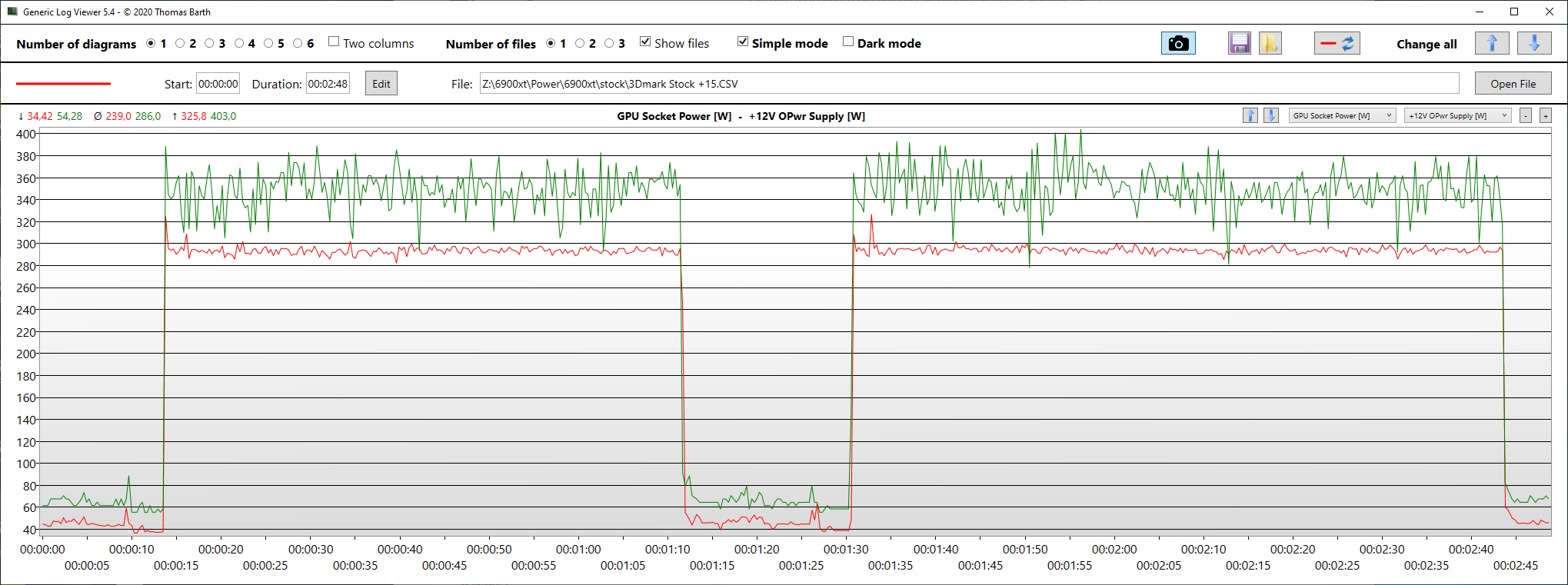 В первом тестовом отрезке 3DMark Time Spy Extreme получены следующие результаты: GPU Socket Power [W] максимальное энергопотребление 324 Вт, среднее – 289 Вт, а для +12V OPwr Supply [W] максимальное –400 Вт, среднее – 342 Вт. Во втором тестовом отрезке 3DMark Time Spy Extreme получены следующие результаты: GPU Socket Power [W] максимальное – 326 Вт, среднее – 290 Вт, а для +12V OPwr Supply [W] максимальное – 403 Вт, среднее – 345 Вт.