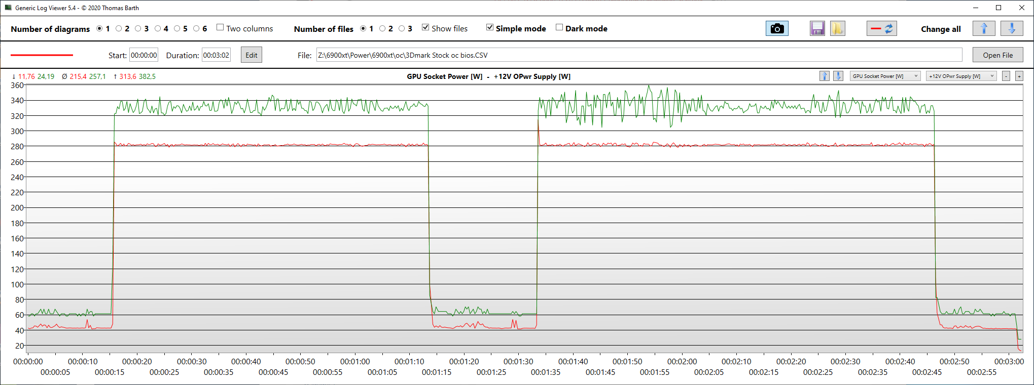 В первом тестовом отрезке 3DMark Time Spy Extreme получены следующие результаты: GPU Socket Power [W] максимальное энергопотребление 313 Вт, среднее – 278 Вт, а для +12V OPwr Supply [W] максимальное – 377 Вт, среднее – 327 Вт. Во втором тестовом отрезке 3DMark Time Spy Extreme получены следующие результаты: GPU Socket Power [W] максимальное – 314 Вт, среднее – 279 Вт, а для +12V OPwr Supply [W] максимальное – 383 Вт, среднее – 330 Вт.