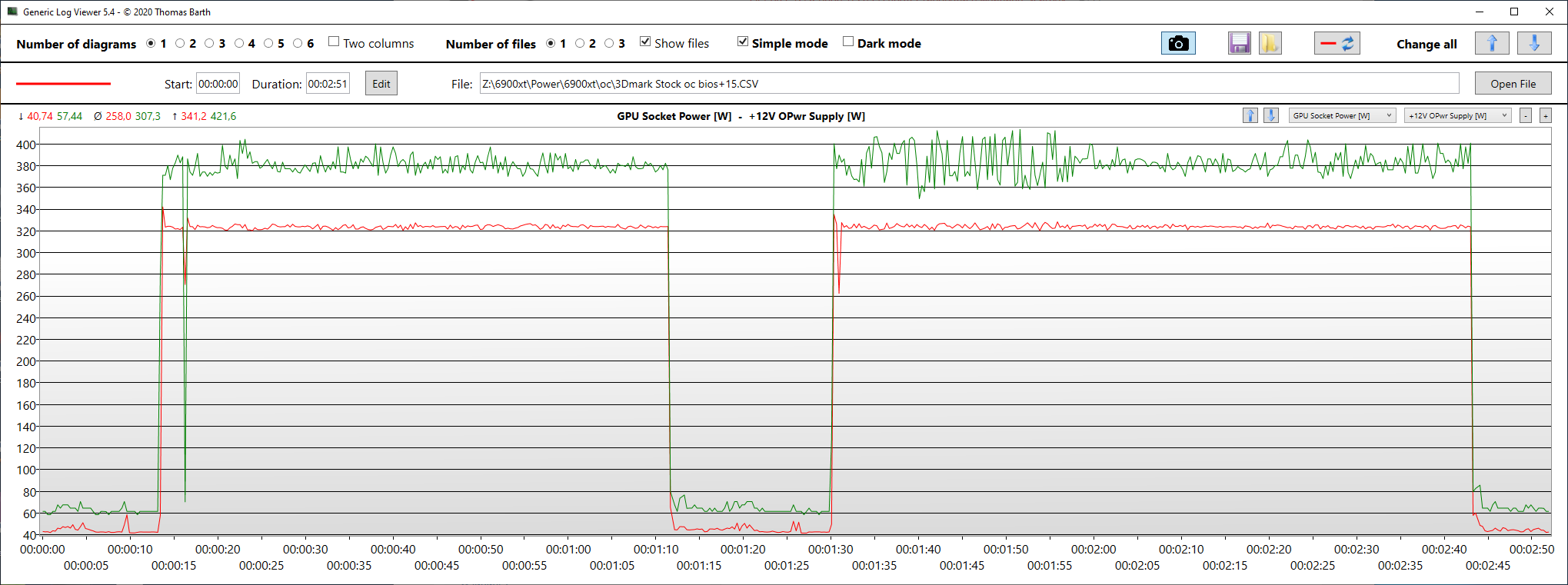 В первом тестовом отрезке 3DMark Time Spy Extreme получены следующие результаты: GPU Socket Power [W] максимальное энергопотребление 341 Вт, среднее – 319 Вт, а для +12V OPwr Supply [W] максимальное – 422 Вт, среднее – 376 Вт. Во втором тестовом отрезке 3DMark Time Spy Extreme получены следующие результаты: GPU Socket Power [W] максимальное – 320 Вт, среднее – 336 Вт, а для +12V OPwr Supply [W] максимальное – 415 Вт, среднее – 380 Вт.