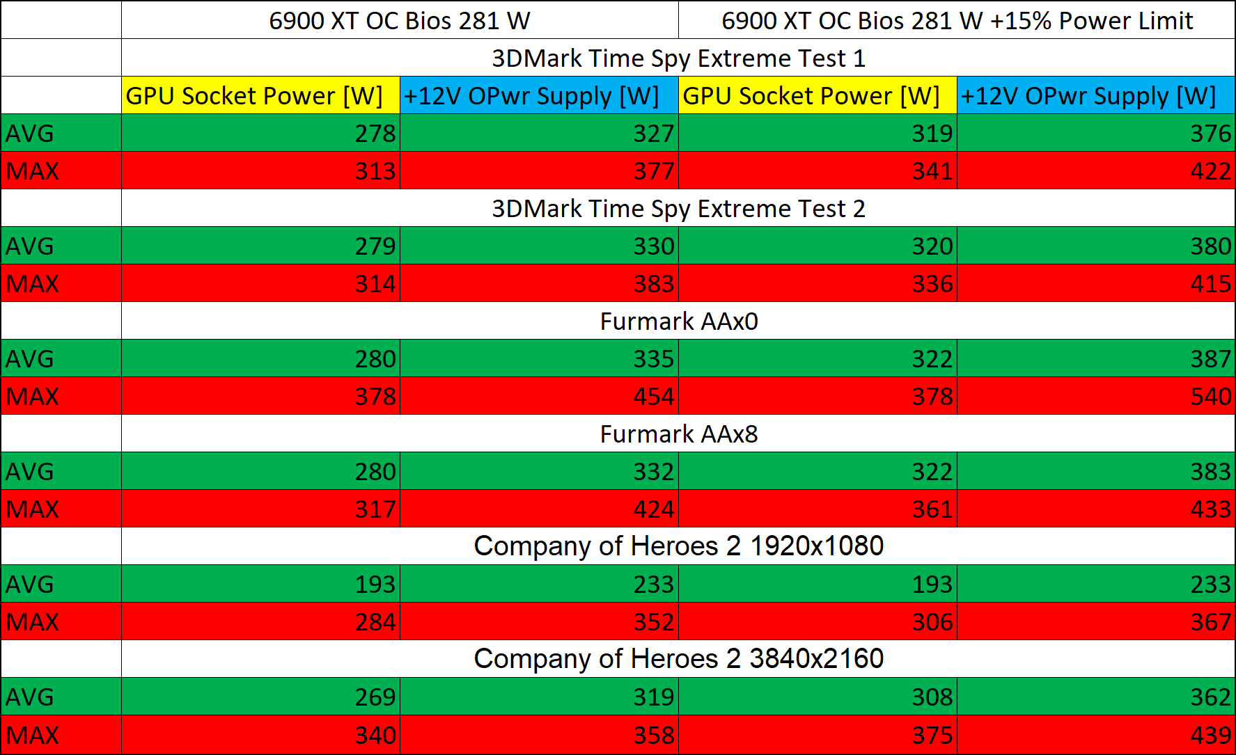 В Company of Heroes 2 3840x2160 энергопотребление видеокарты составило: максимальное значение GPU Socket Power [W] 299 Вт, среднее – 244 Вт, +12V OPwr Supply [W] максимальное – 420 Вт, среднее – 291 Вт. С увеличением лимита на 15% были получены следующие значения энергопотребления: максимальное значение GPU Socket Power [W] 332 Вт, среднее – 281 Вт, +12V OPwr Supply [W] максимальное – 457 Вт, среднее – 331 Вт.