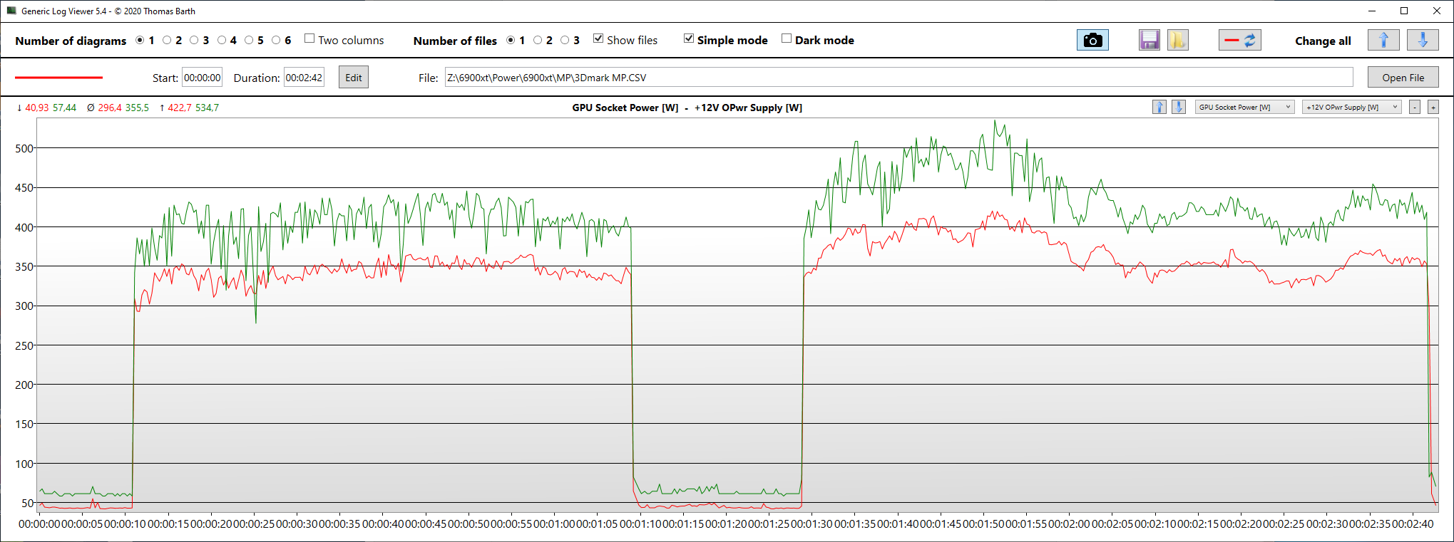 В первом тестовом отрезке 3DMark Time Spy Extreme получены следующие результаты: GPU Socket Power [W] максимальное энергопотребление 366 Вт, среднее – 334 Вт, а для +12V OPwr Supply [W] максимальное –448 Вт, среднее – 396 Вт. Во втором тестовом отрезке 3DMark Time Spy Extreme получены следующие результаты: GPU Socket Power [W] максимальное – 423 Вт, среднее – 360 Вт, а для +12V OPwr Supply [W] максимальное – 535 Вт, среднее – 431Вт.