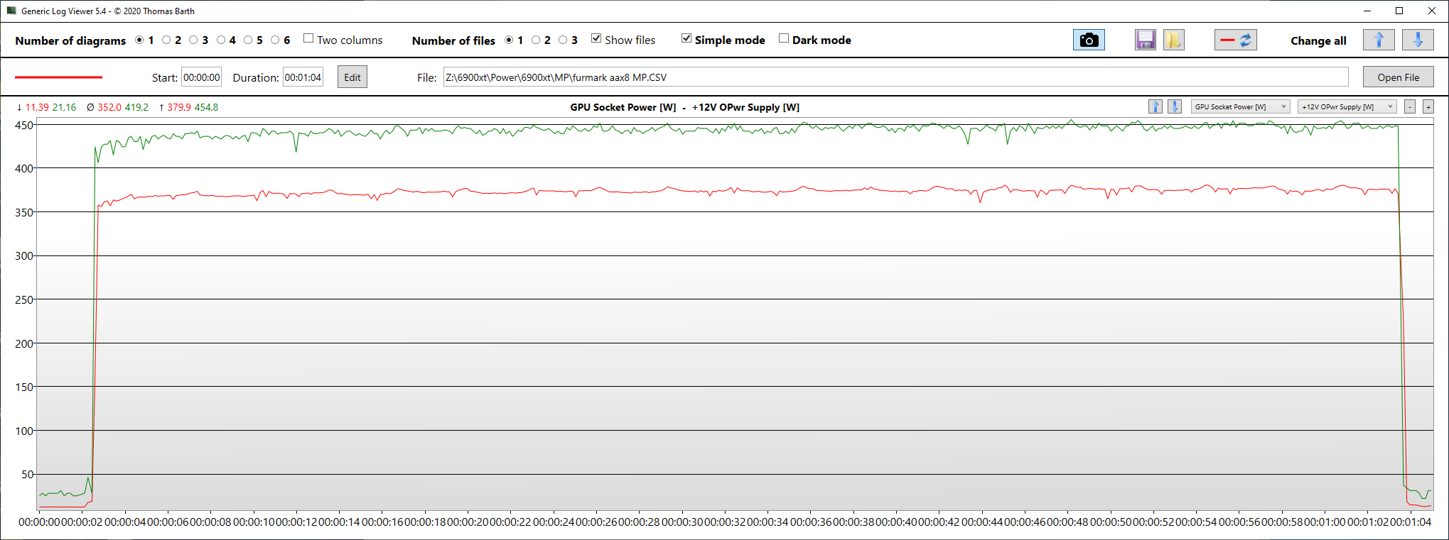 В Furmark AAx8 данные практически совпадают: максимальное значение GPU Socket Power [W] 368 Вт, среднее – 380 Вт, +12V OPwr Supply [W] максимальное – 455 Вт, среднее – 437 Вт.