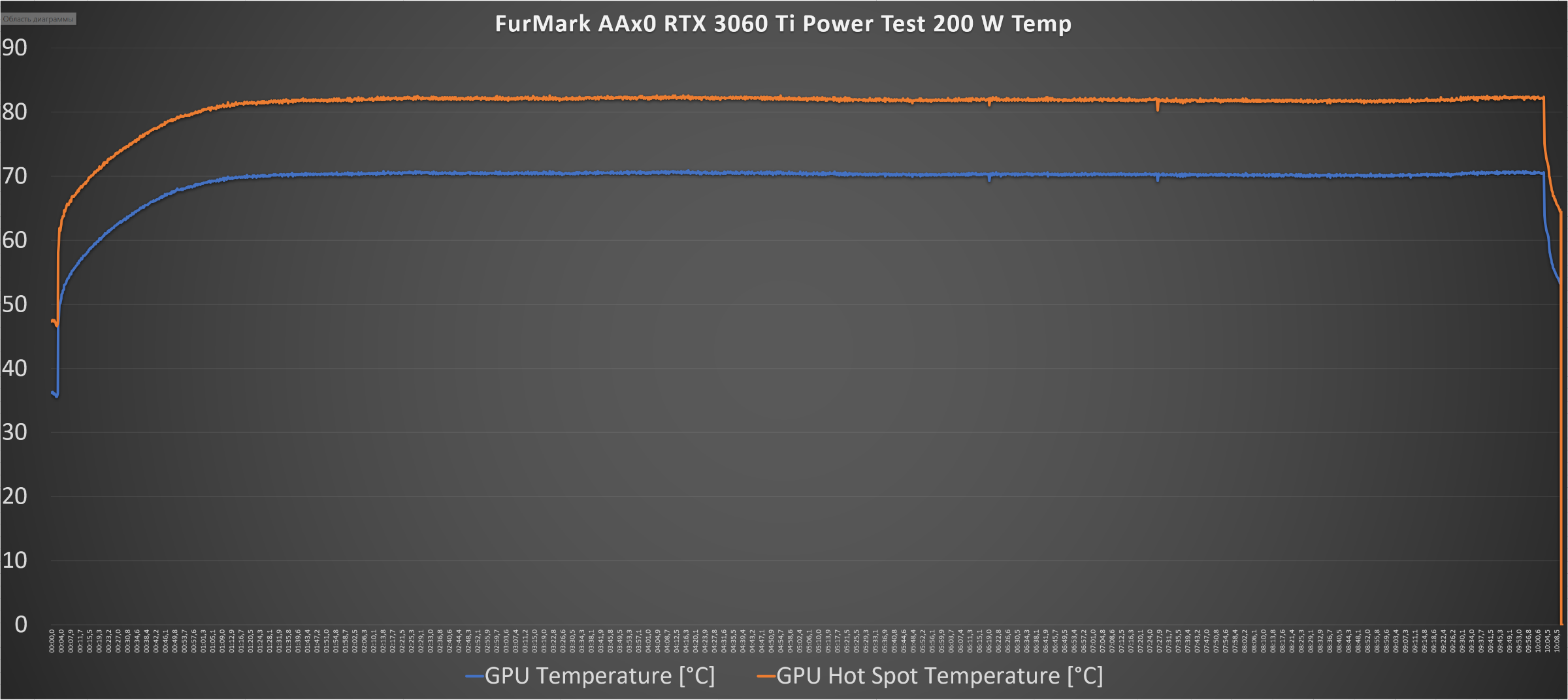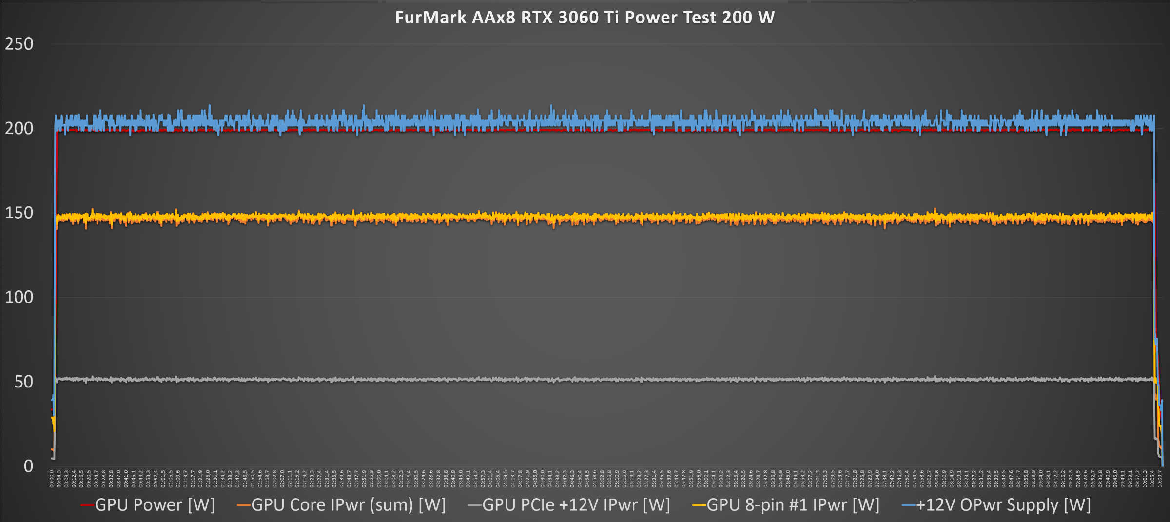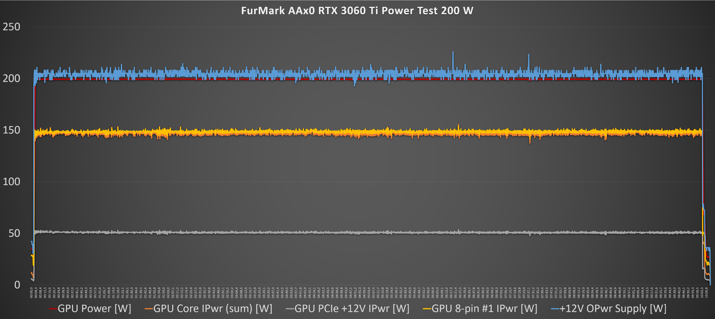 В Furmark AAx0: максимальное значение GPU Power [W] 200 Вт, среднее – 199 Вт, +12V OPwr Supply [W] максимальное – 226 Вт, среднее – 203 Вт.