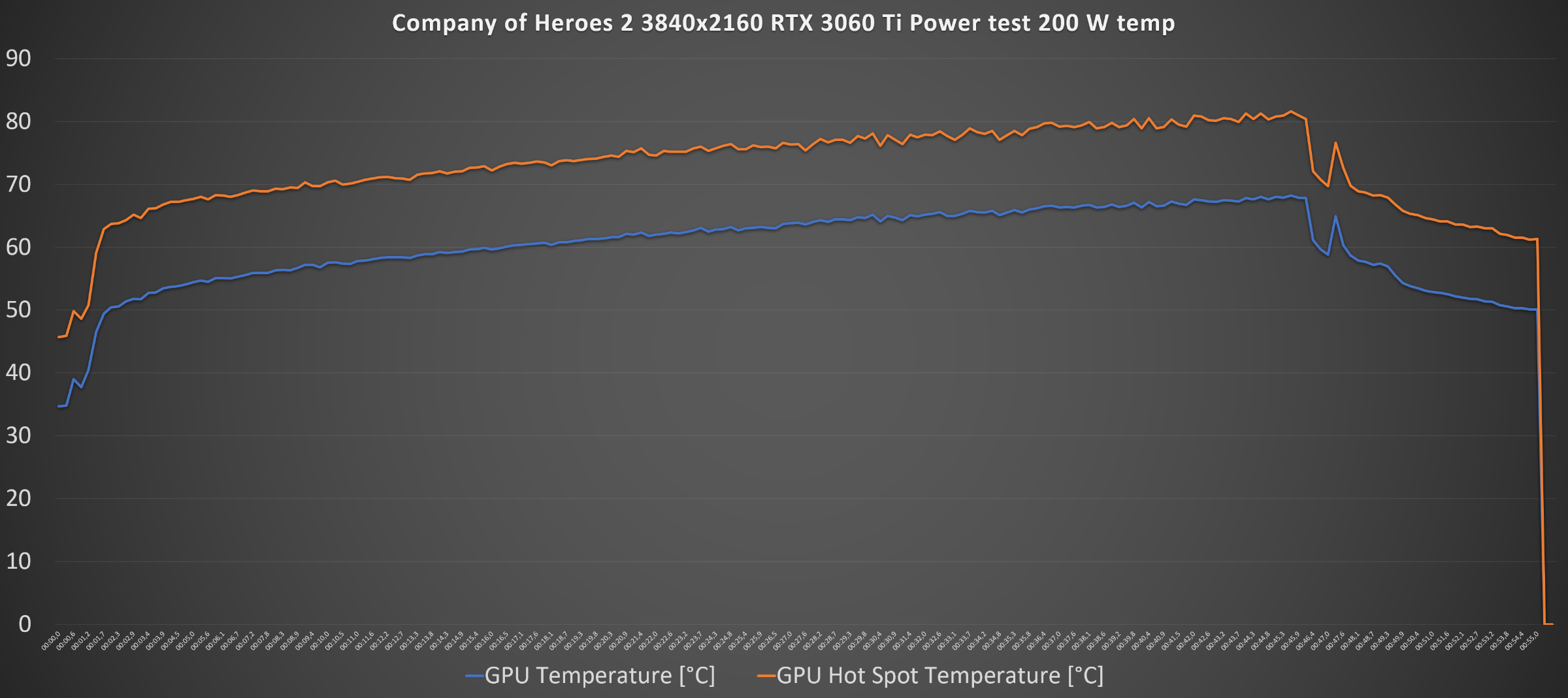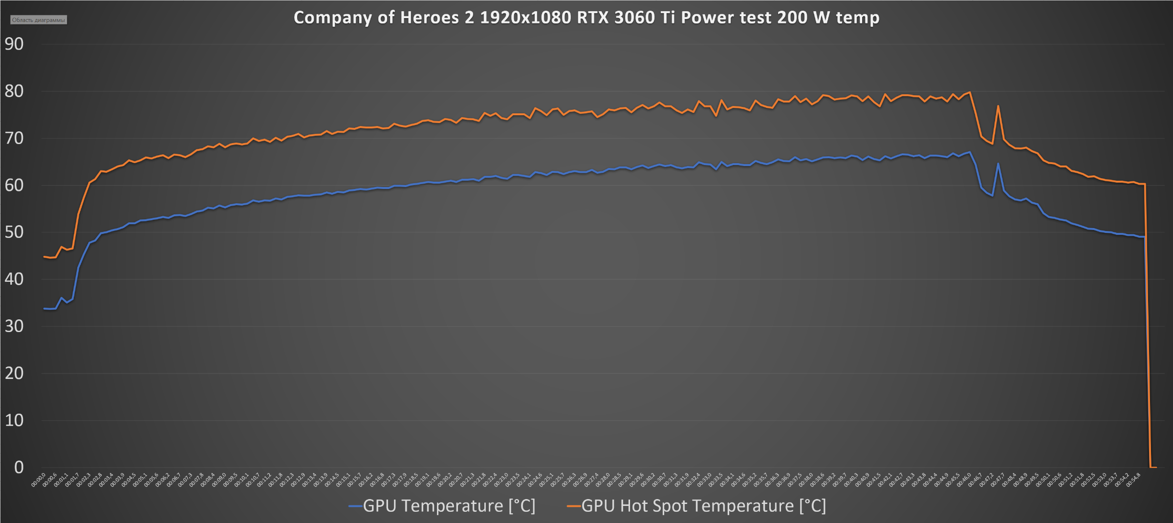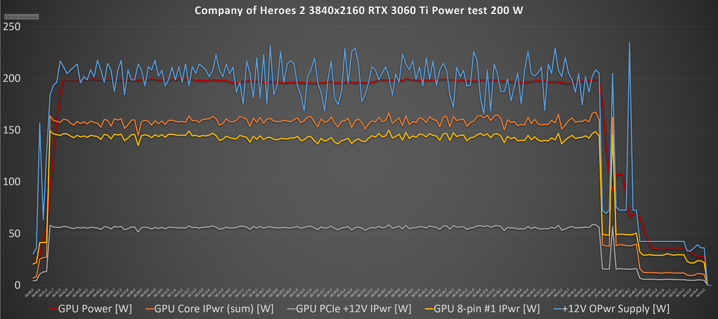 В Company of Heroes 2 1920x1080 энергопотребление видеокарты составило: максимальное значение GPU Power [W] 200 Вт, среднее – 192 Вт, +12V OPwr Supply [W] максимальное – 200 Вт, среднее – 196 Вт.
