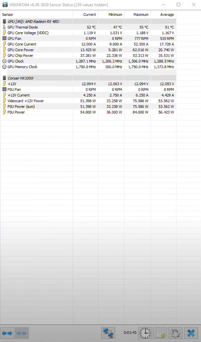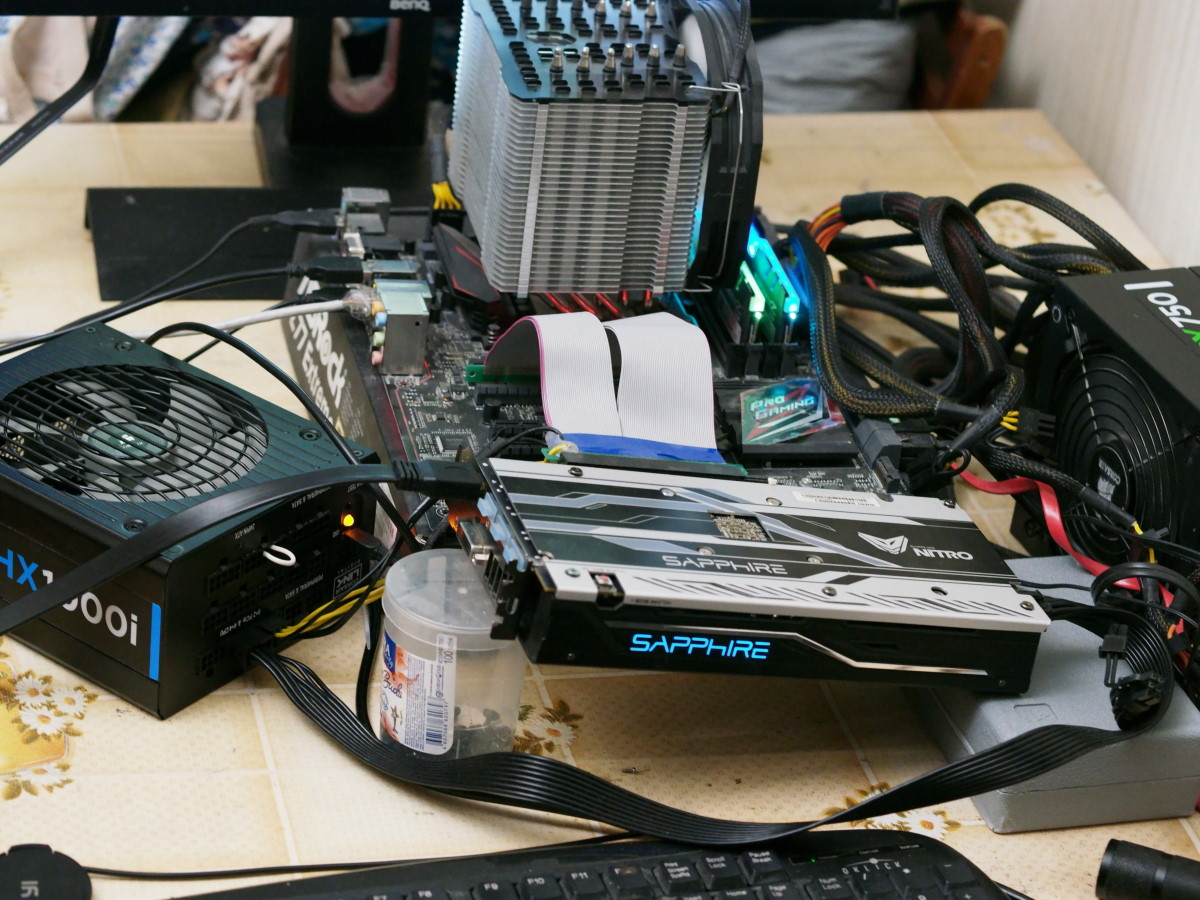 Видеокарта питалась от отдельного источника питания Corsair HX1000i через PCI-E 8 pin и райзер, в котором отрезаны дорожки питания 12 В идущие к материнской плате и соединены напрямую к блоку питания через разъём PCI-E 6 pin. Вся остальная часть тестового стенда была запитана через блок питания Corsair CX 750W. В качестве источника получения данных энергопотребления видеокарты и остальной системы использовалась программа HWiNFO64.