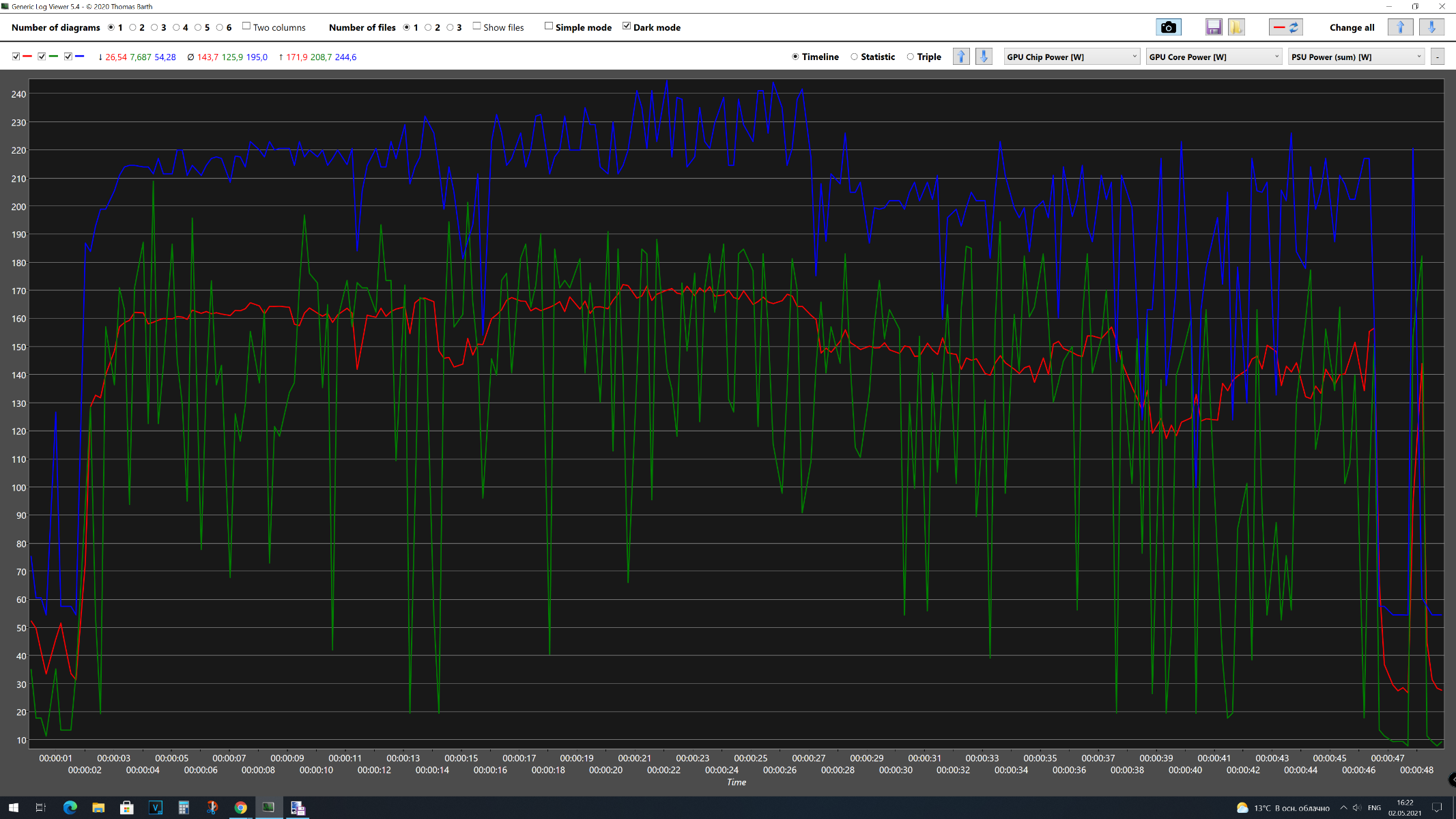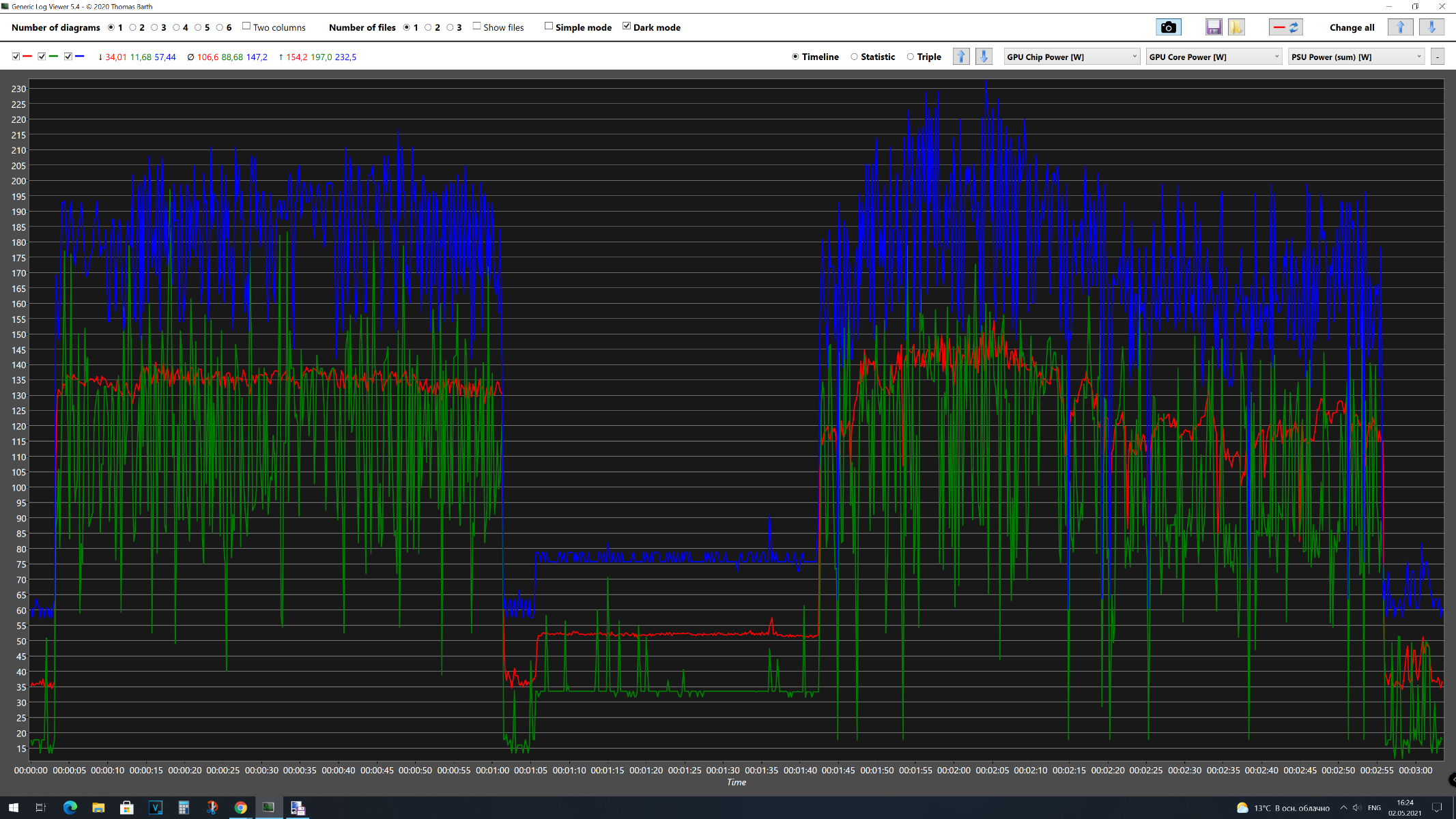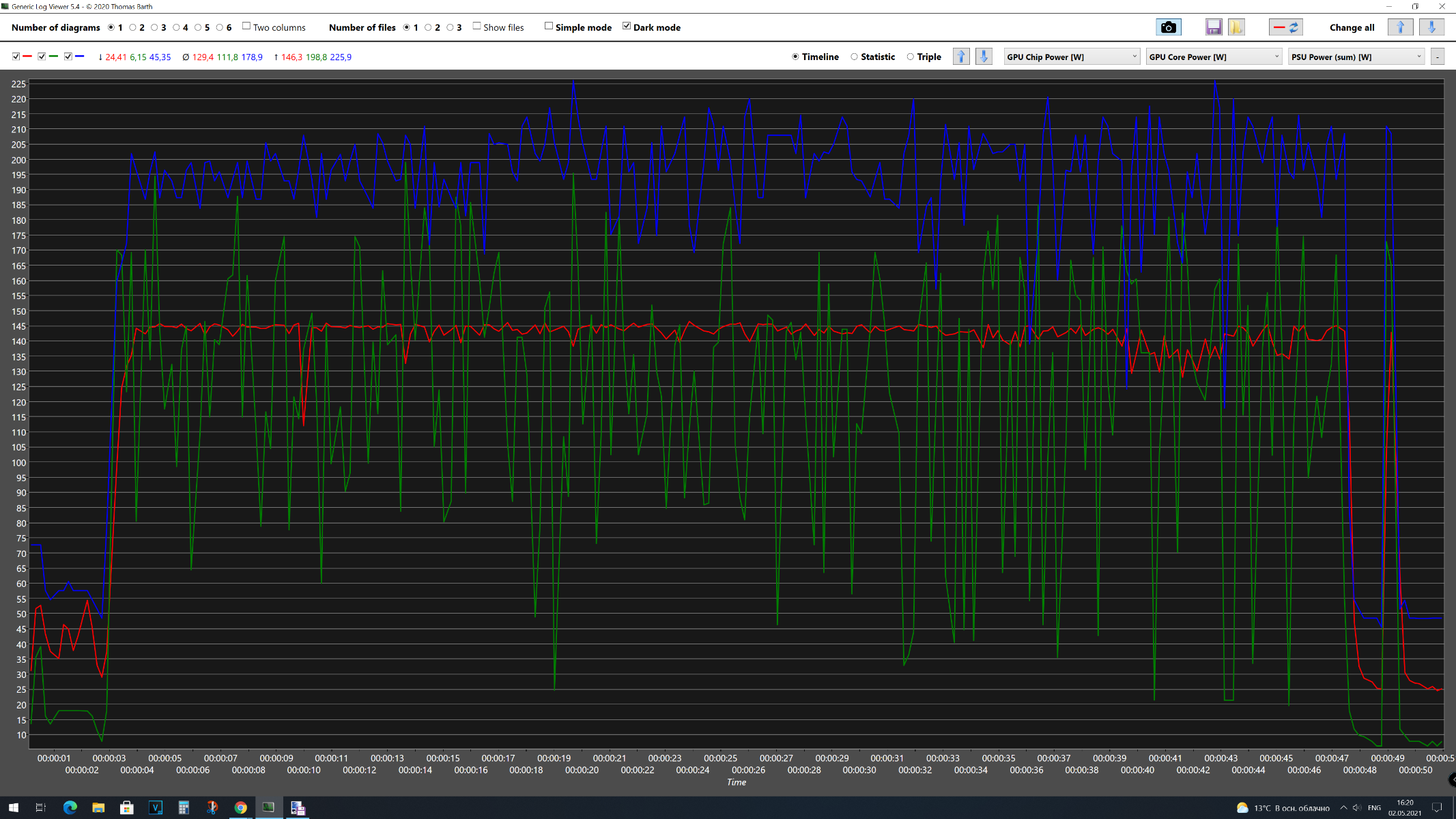 В первом тестовом отрезке 3DMark Time Spy Extreme получены следующие результаты: GPU Chip Power [W] максимальное энергопотребление 141 Вт, среднее – 134 Вт, GPU Core Power максимальное – 197 Вт, среднее – 117 Вт, а для Videocard +12V Power максимальное – 217 Вт, среднее – 183 Вт. Средняя частота графического процессора составила 1306 МГц, максимальная – 1306 МГц. Средняя температура графического процессора составила 52 °C, максимальная – 565 °C. Среднее напряжение графического процессора составила 1,161 В, максимальная – 1,188 В. Средняя скорость вентилятора составила 3111 об/мин, максимальная – 3141 об/мин. Во втором тестовом отрезке 3DMark Time Spy Extreme получены следующие результаты: GPU Chip Power [W] максимальное энергопотребление 154 Вт, среднее – 126 Вт, GPU Core Power максимальное – 179 Вт, среднее – 107 Вт, а для Videocard +12V Power максимальное – 233 Вт, среднее – 172 Вт. Средняя частота графического процессора составила 1306 МГц, максимальная – 1306 МГц. Средняя температура графического процессора составила 52 °C, максимальная – 55 °C. Среднее напряжение графического процессора составила 1,165 В, максимальная – 1,188 В. Средняя скорость вентилятора составила 3089 об/мин, максимальная – 3113 об/мин