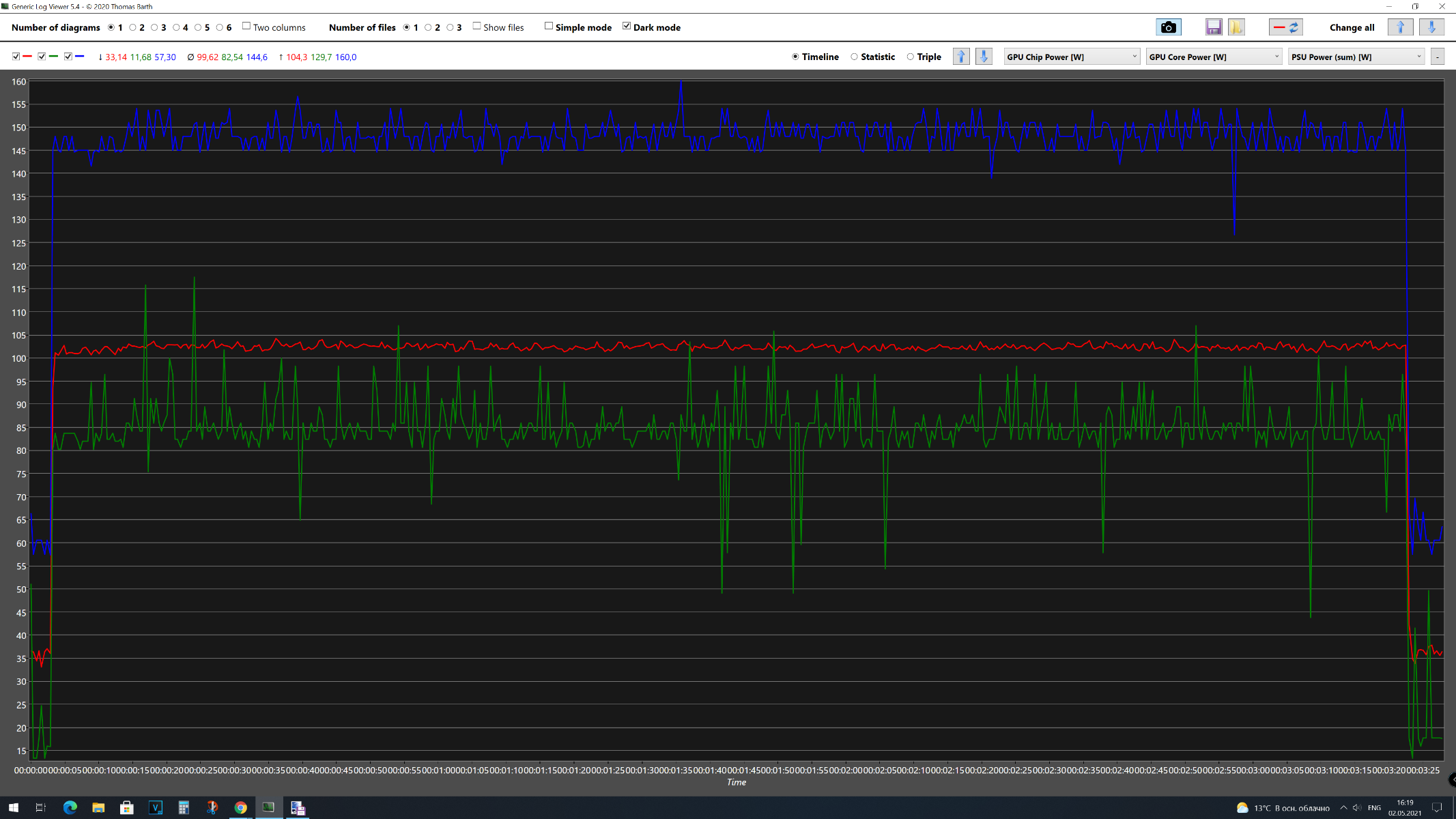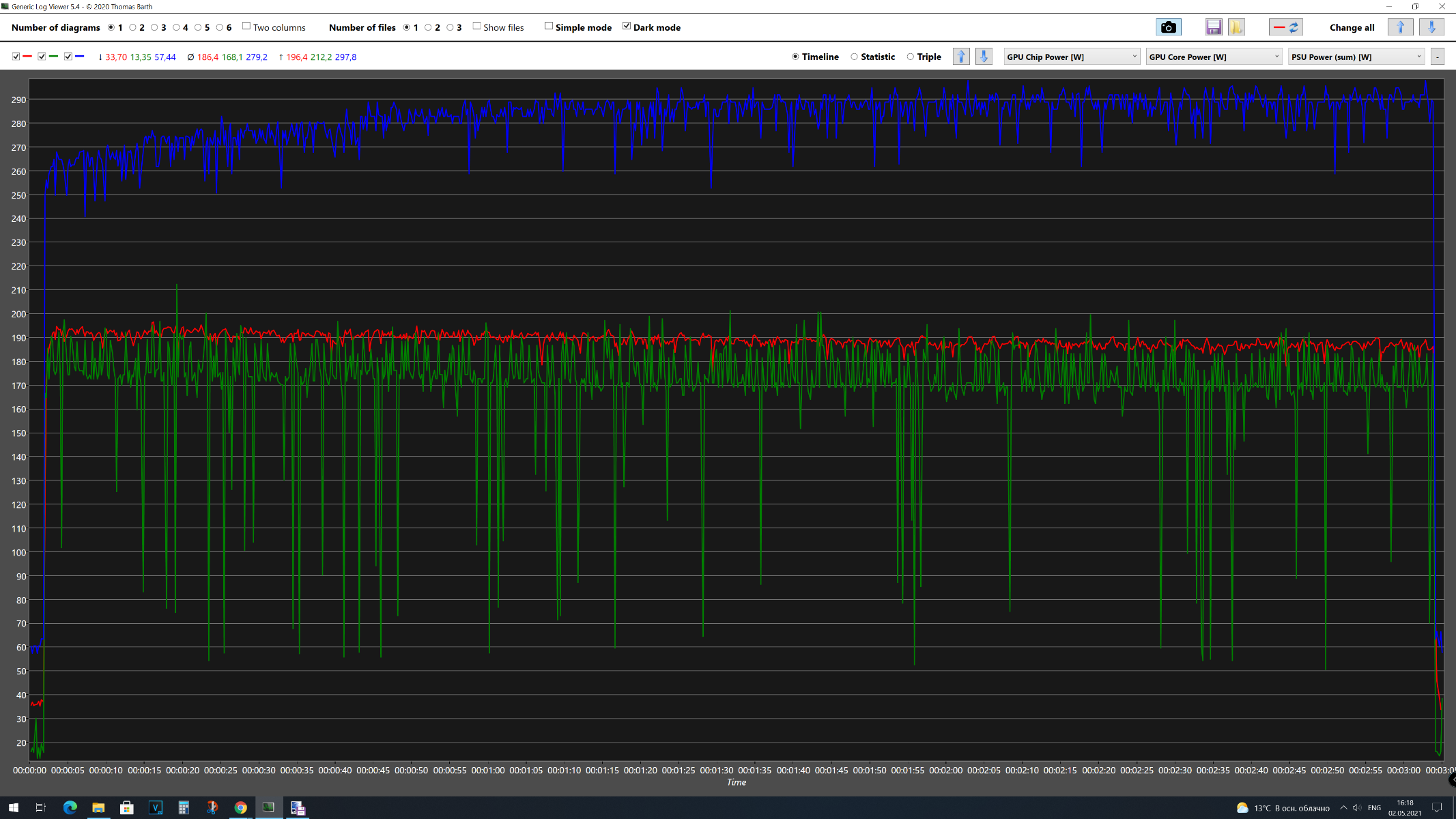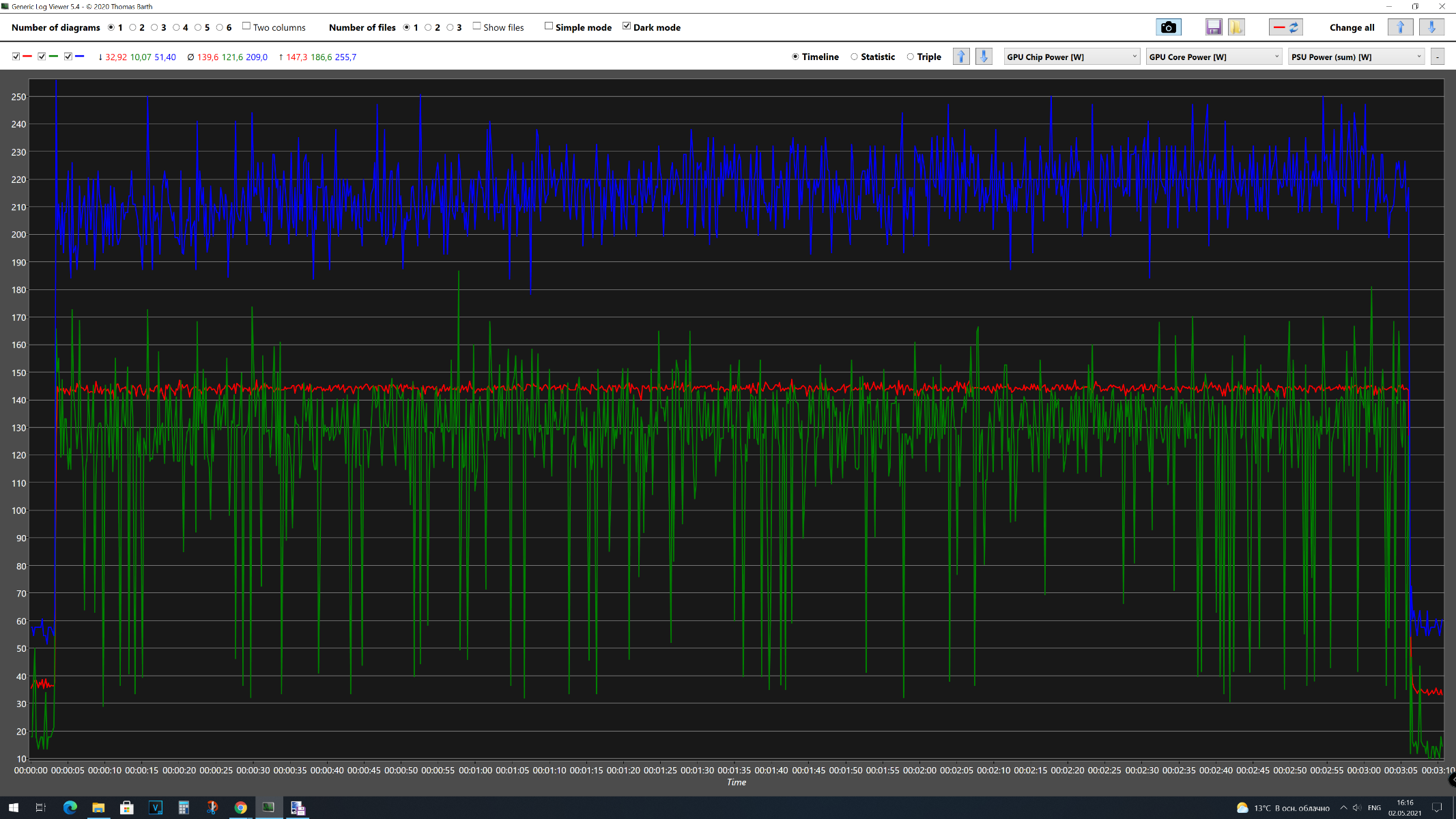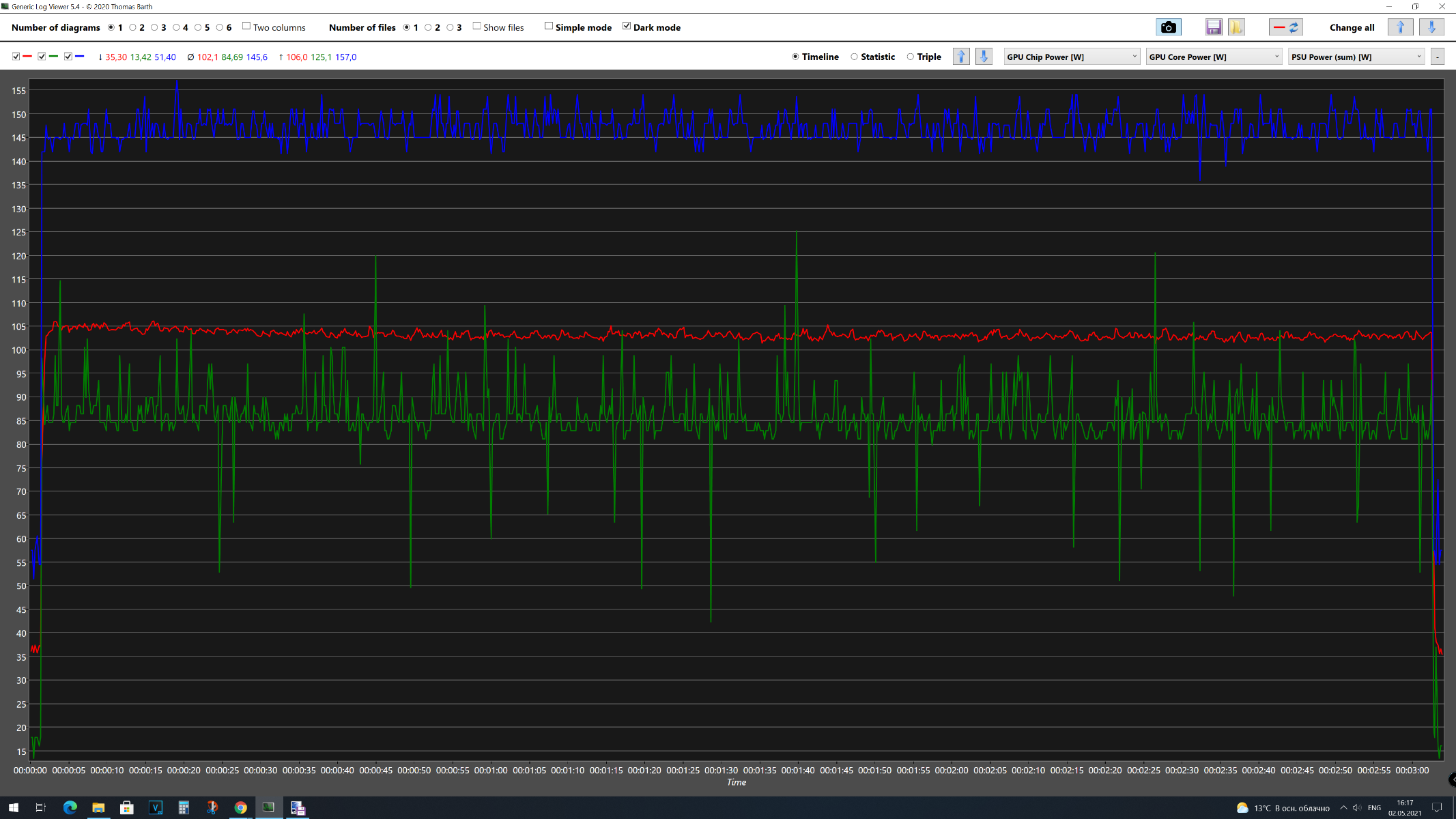 В первом тестовом отрезке 3DMark Time Spy Extreme получены следующие результаты: GPU Chip Power [W] максимальное энергопотребление 141 Вт, среднее – 134 Вт, GPU Core Power максимальное – 197 Вт, среднее – 117 Вт, а для Videocard +12V Power максимальное – 217 Вт, среднее – 183 Вт. Средняя частота графического процессора составила 1306 МГц, максимальная – 1306 МГц. Средняя температура графического процессора составила 52 °C, максимальная – 565 °C. Среднее напряжение графического процессора составила 1,161 В, максимальная – 1,188 В. Средняя скорость вентилятора составила 3111 об/мин, максимальная – 3141 об/мин. Во втором тестовом отрезке 3DMark Time Spy Extreme получены следующие результаты: GPU Chip Power [W] максимальное энергопотребление 154 Вт, среднее – 126 Вт, GPU Core Power максимальное – 179 Вт, среднее – 107 Вт, а для Videocard +12V Power максимальное – 233 Вт, среднее – 172 Вт. Средняя частота графического процессора составила 1306 МГц, максимальная – 1306 МГц. Средняя температура графического процессора составила 52 °C, максимальная – 55 °C. Среднее напряжение графического процессора составила 1,165 В, максимальная – 1,188 В. Средняя скорость вентилятора составила 3089 об/мин, максимальная – 3113 об/мин