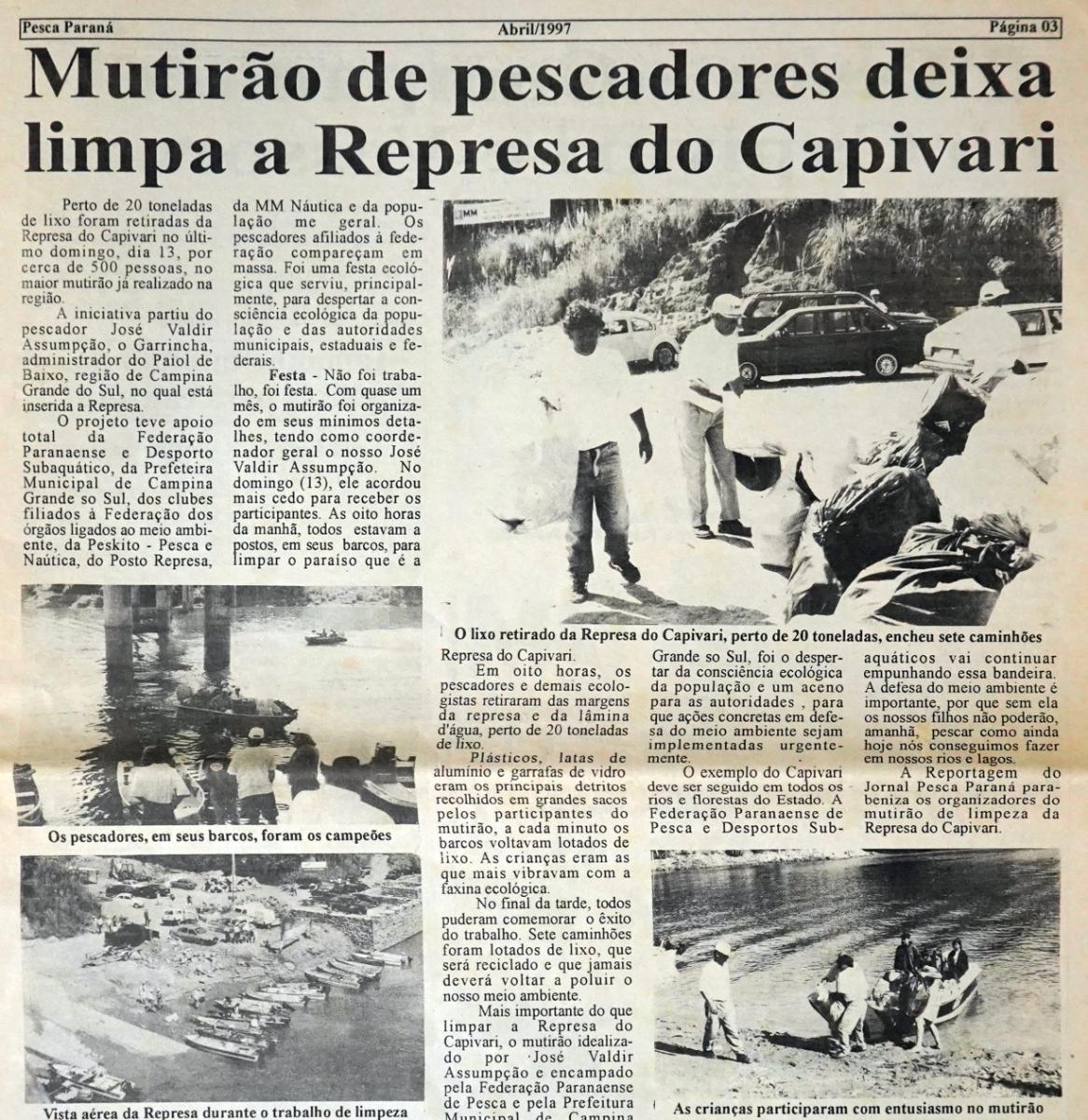 Вот статья, опубликованная в апреле 1997 года в его газете «Pesca Paraná» («Рыбалка в Парана»), в которой рассказывается об одном из мероприятий по уборке. В статье подчёркивается, что из водохранилища были вывезены тонны мусора.
