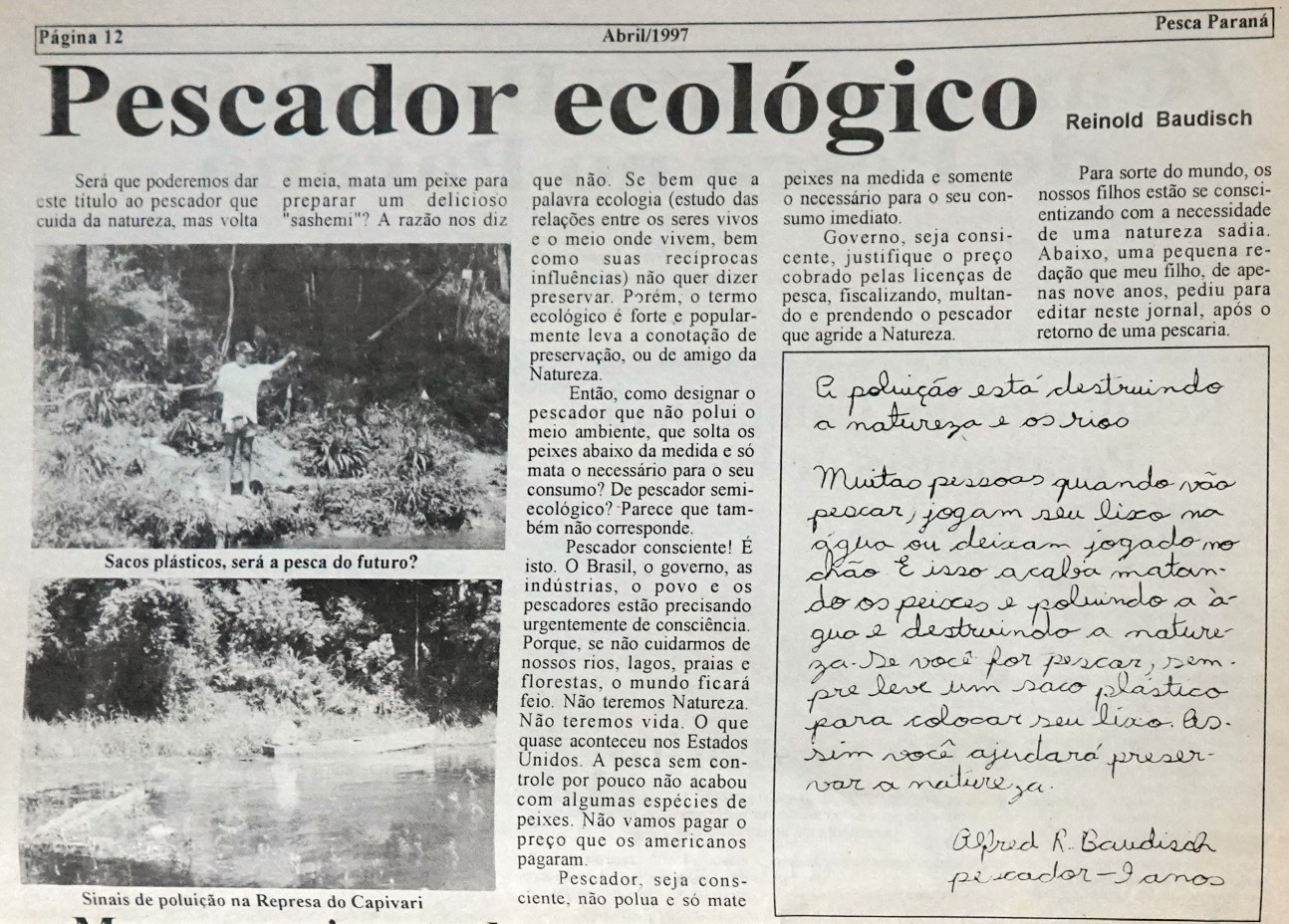 Газета Pesca Paraná за апрель 1997 г., освещающая статью моего отца Рейнольда Баудиша – "Pescador Ecológico" ("Экологический рыболов"). Справа – мое письмо.