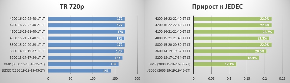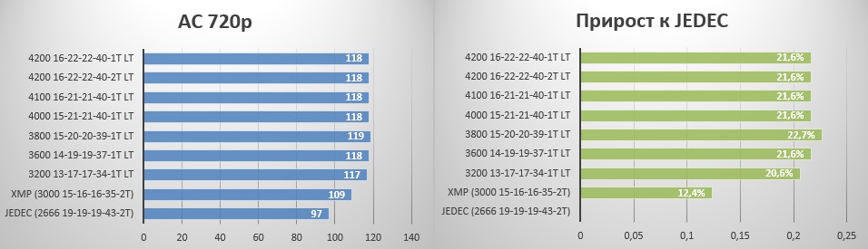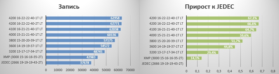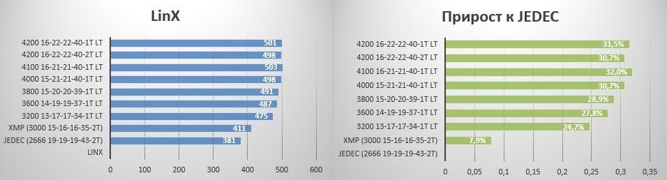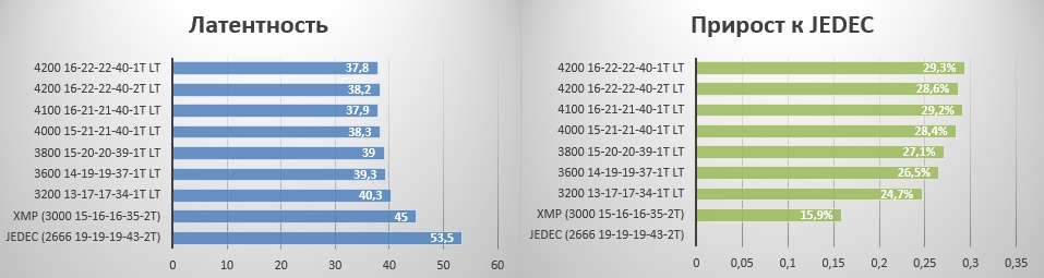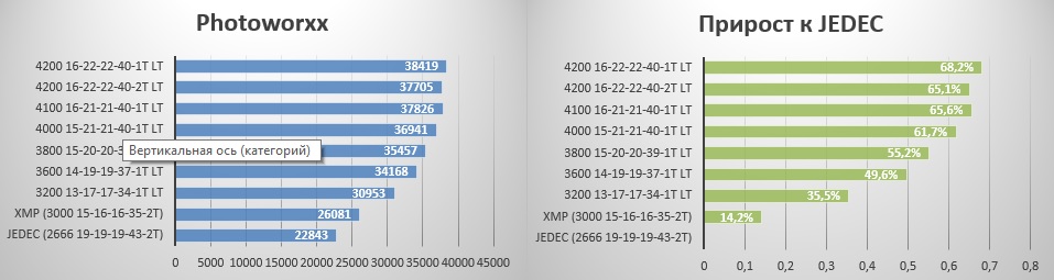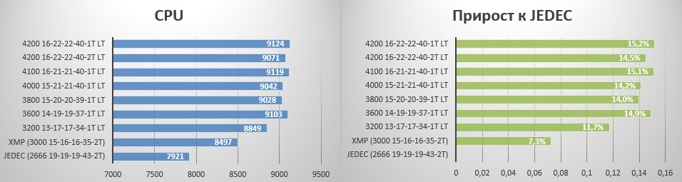 Тут тоже все понятно - профиль XMP дает чуть меньше настроенных таймингов, а вместе весомый прирост в 15%.