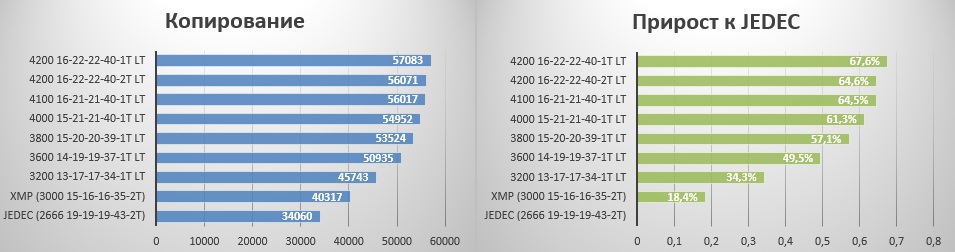 По этим тестам видно, что самый большой прирост идет от настроенных таймингов (впервые я это сделал на частоте 3200), потом идет прирост от XMP профиля, а дальше практически линейный рост показателей с ростом частоты. Режим 1Т дает прирост, но не такой весомый, как хотелось бы. Гоним пока латентность снижается, а частота растет)