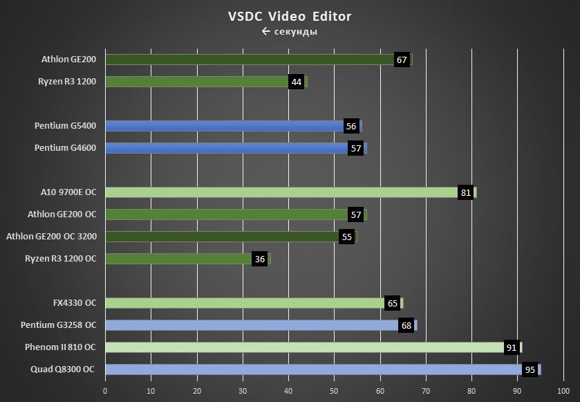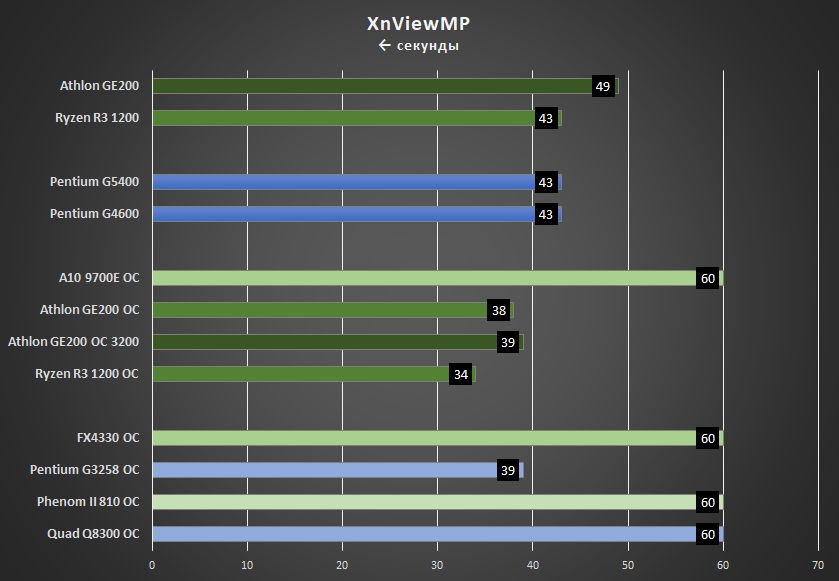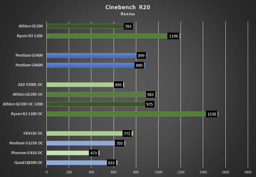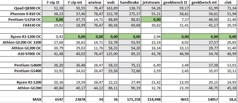 Зеленый – лидер, белый фон – до 35% отставания, темный фон – более 35% проигрыша. Оптимальный процессор тестирования - Ryzen R3 1200 в режиме разгона, которому Athlon 200GE уступает 20-90% без разгона и 10-60% c разгоном.
