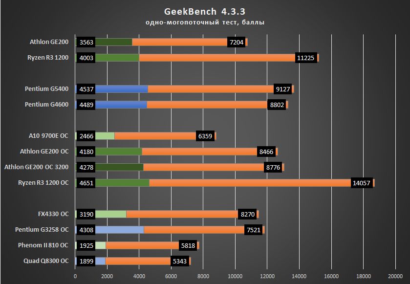 Все важные для 7-zip параметры у 200GE не в лучшем виде: у него низкая частота CPU, памяти, урезанный кеш. Однако, возможность разгона позволяет ему немного обойти своих конкурентов марки Pentium, хотя до производительности R3 1200, даже в номинале, все равно не дотянуться. Из старых камней неплохо выступил FX4330, благодаря своей высокой частоте и G3258, занявший первую строчку в однопоточном режиме.